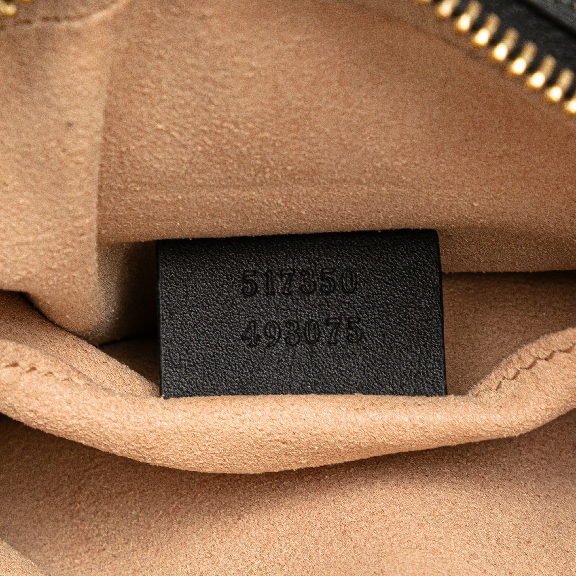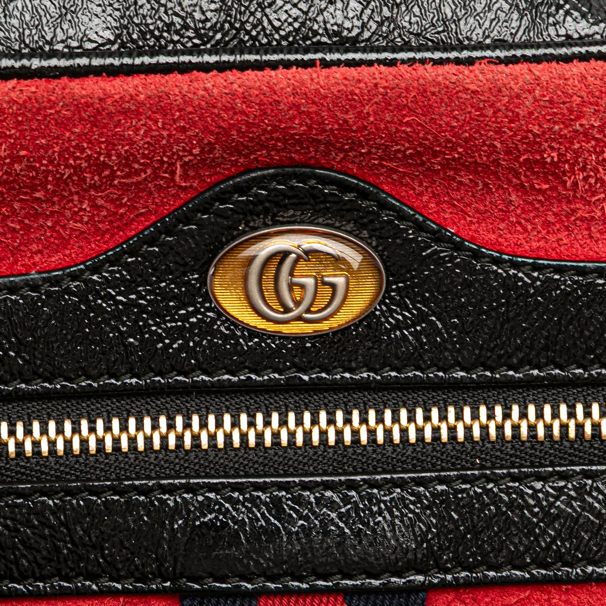 The Ophidia crossbody bag features a suede body with patent leather trim and web detail, an adjustable flat leather strap, a top zip closure, an exterior front zip pocket, and an interior slip pocket. Retail Price: 890.00