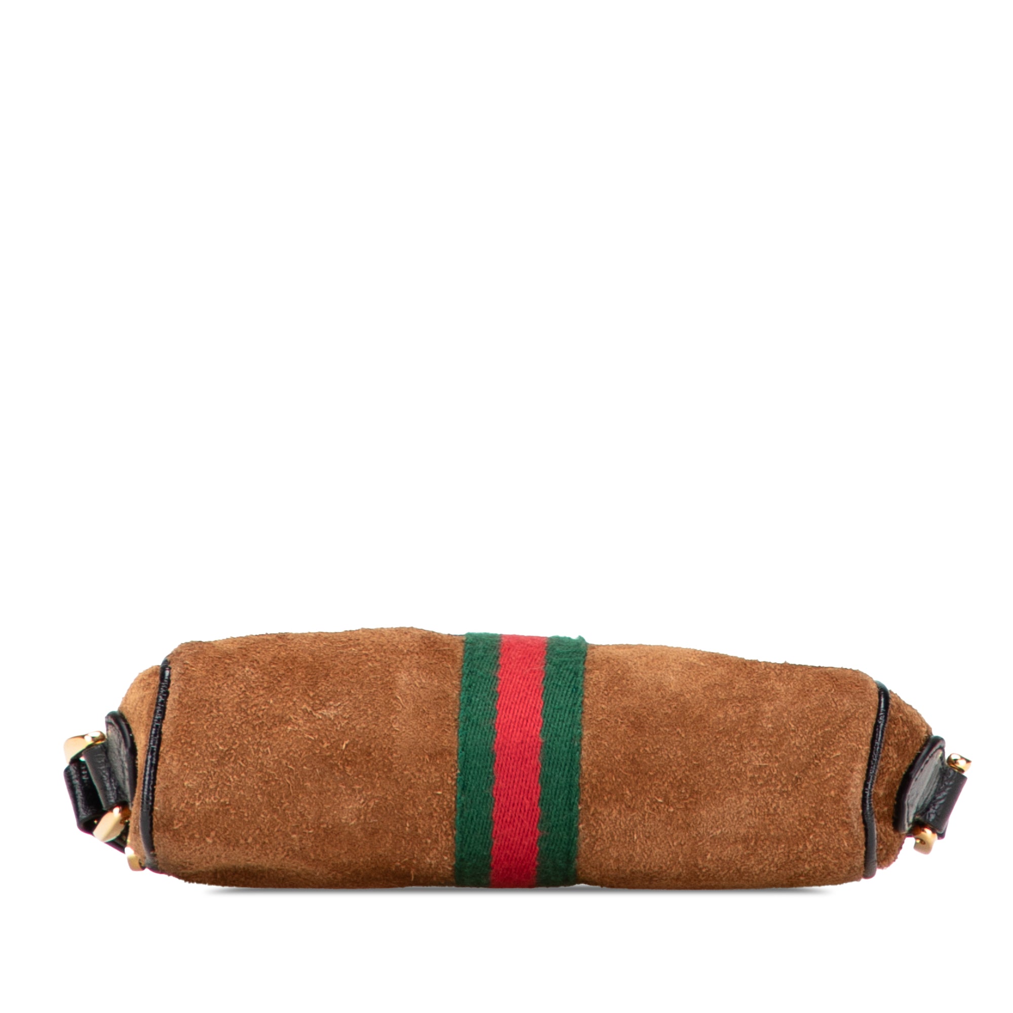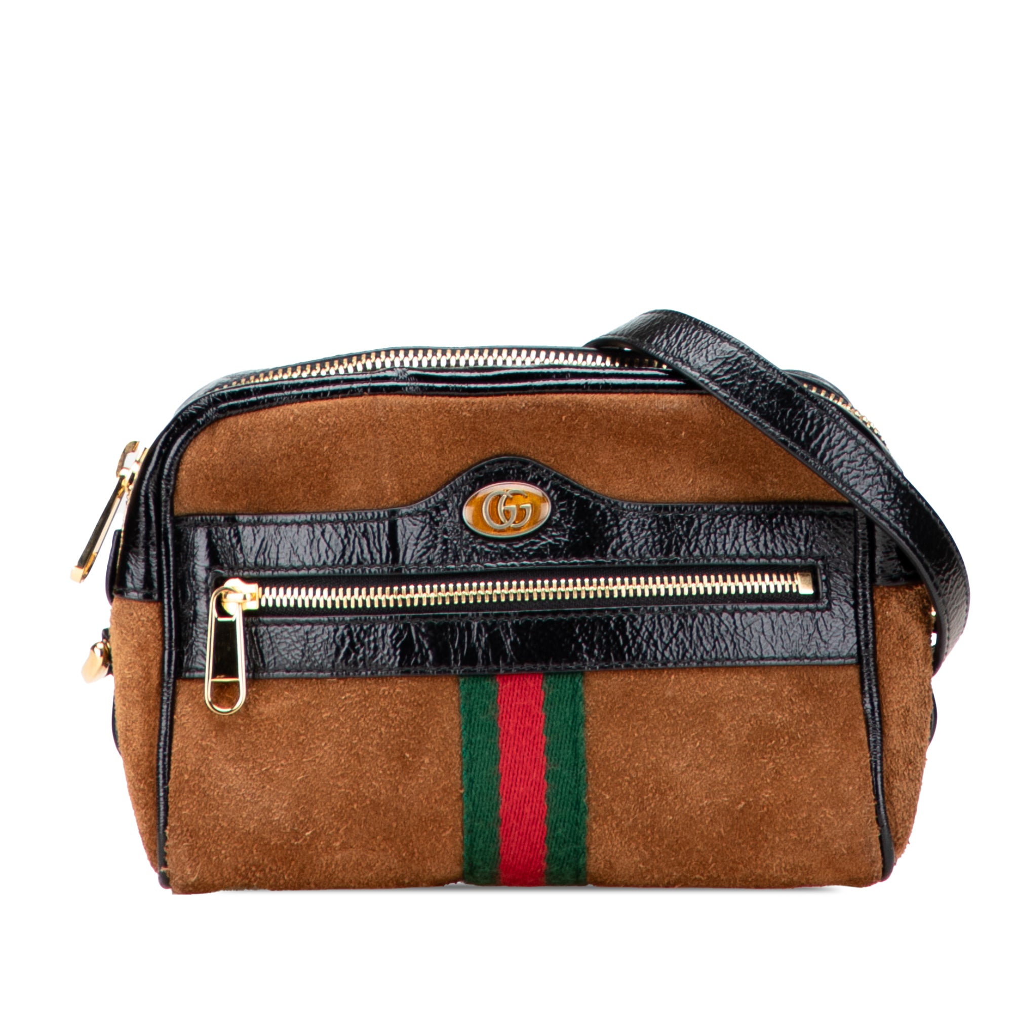 The Ophidia crossbody bag features a suede body with patent leather trim, an adjustable flat patent leather strap, a top zip closure, an exterior front zip pocket, and an interior slip pocket. Retail Price: 770.00