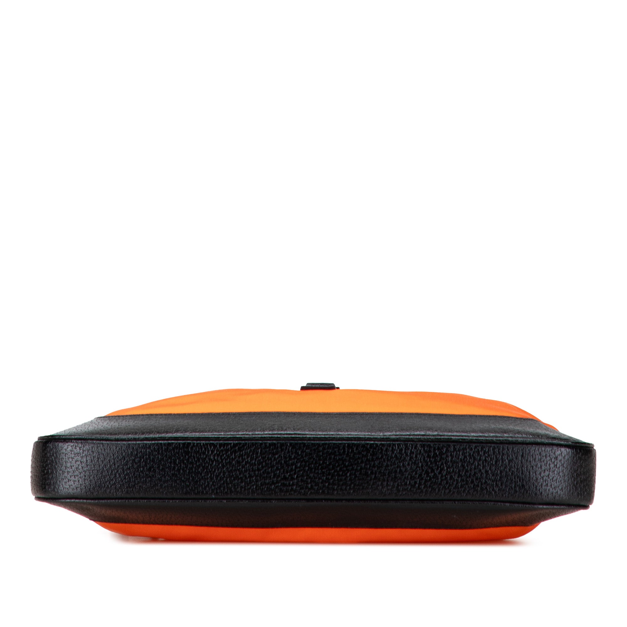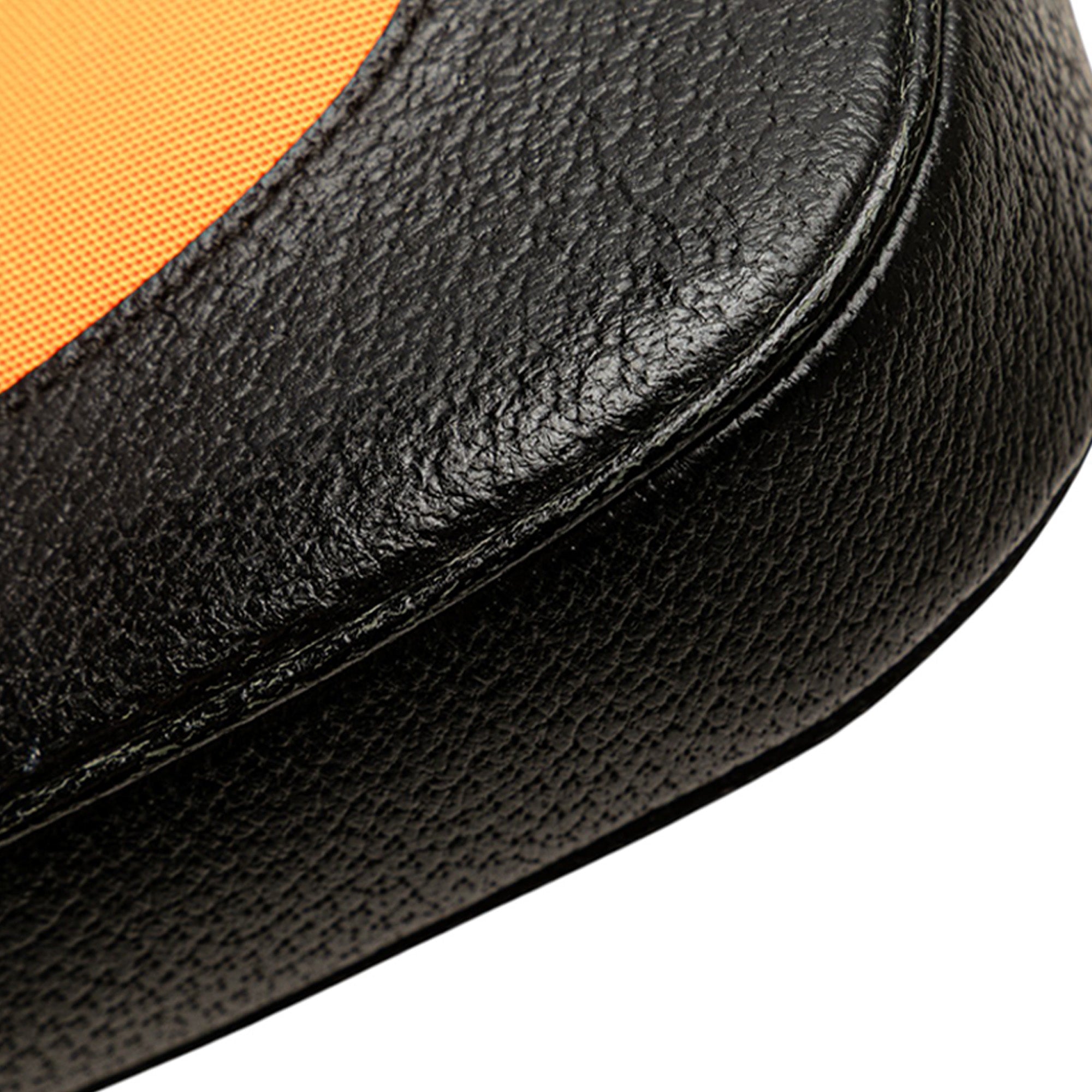 This shoulder bag features a canvas body with leather trim, a flat leather shoulder strap, an open top with a flat strap and push lock closure, and an interior zip pocket. Retail Price: 700.00