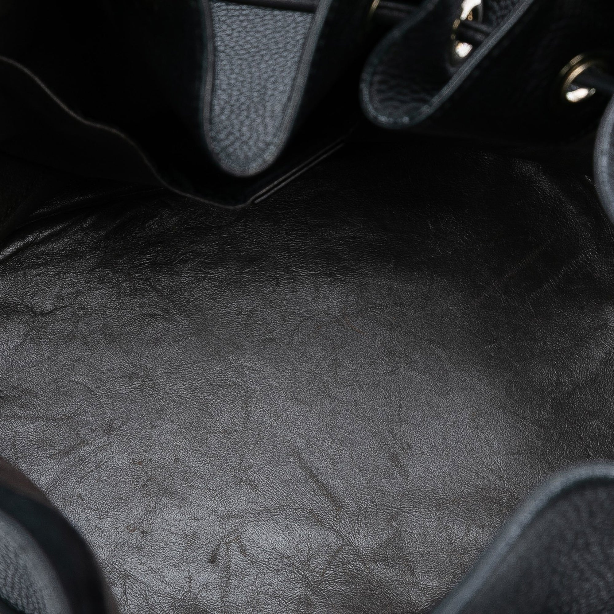 This bucket bag features a leather body, a bamboo top handle, a detachable chain strap, a top drawstring closure with fringe details, and interior slip pockets. Retail Price: 1000.00