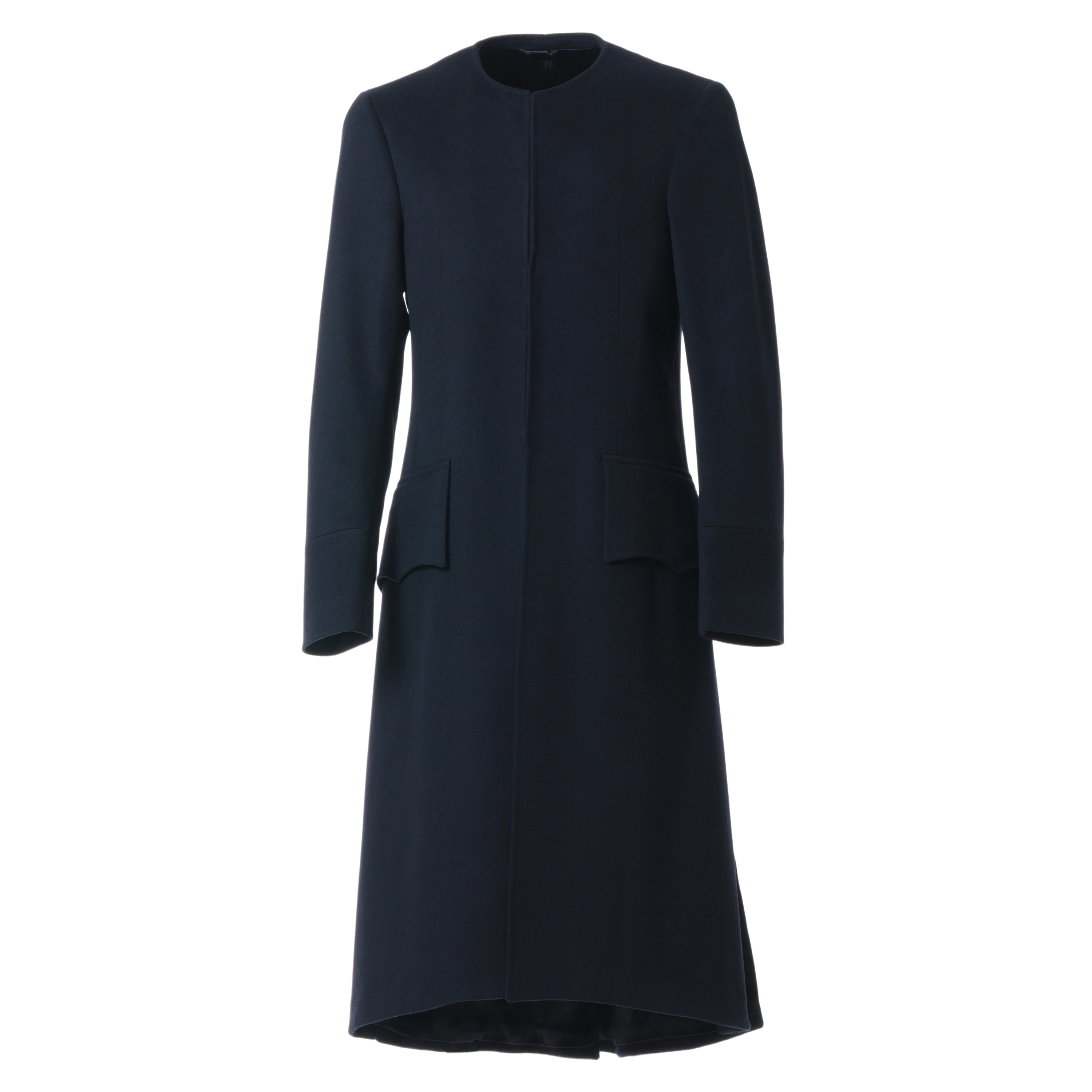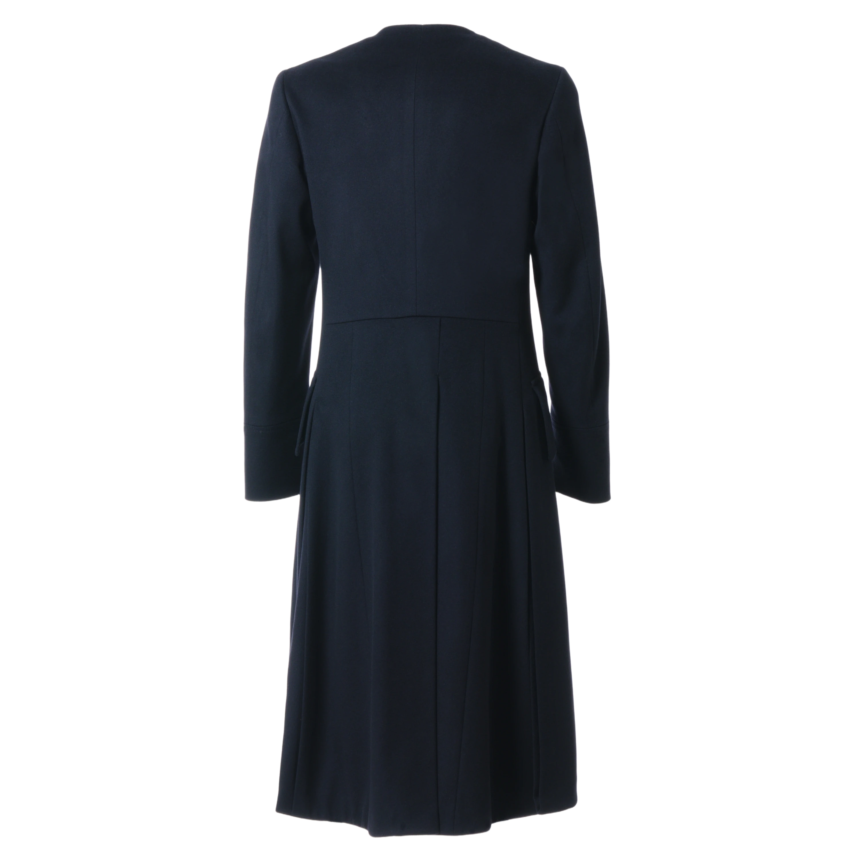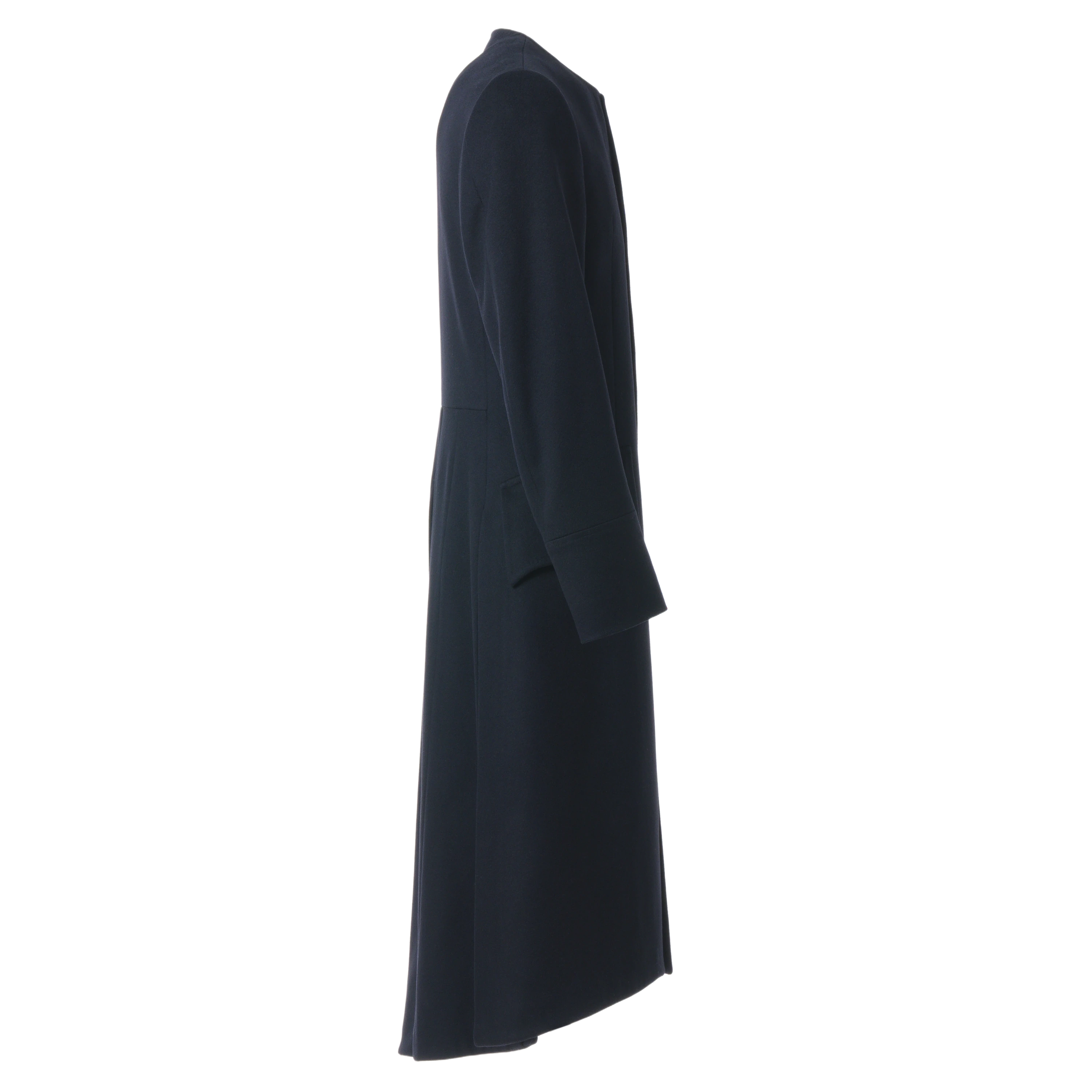 Gucci Autumn-Winter 2006 runway long coat in pure wool, crafted in deep midnight blue. The streamlined 46R silhouette drapes with refined structure, featuring clean lines, hidden fastening and sculpted flap pockets. Finished with a smooth satin lining, it’s a distinguished piece from the runway archives, perfect for an elevated, timeless wardrobe.