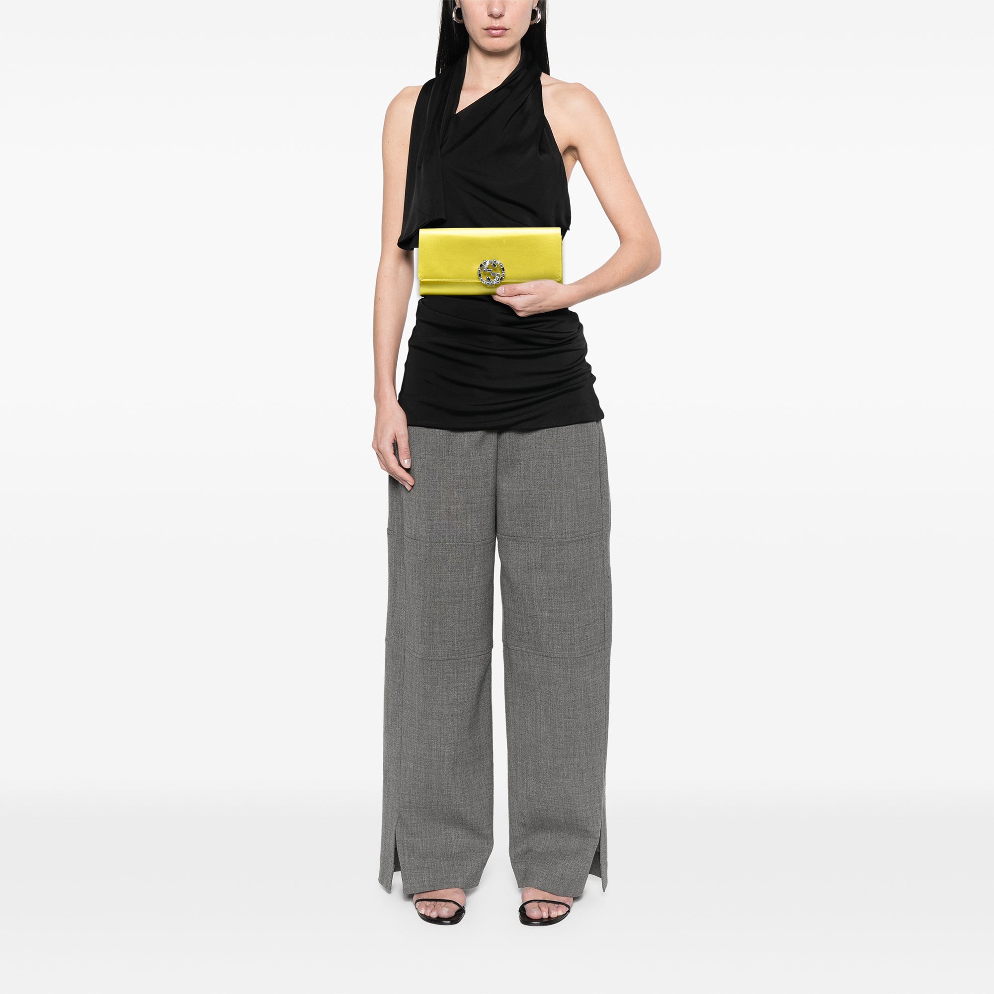 This clutch bag features a satin body, a front flap with clasp closure, and an interior slip pocket. Retail Price: 890.00
