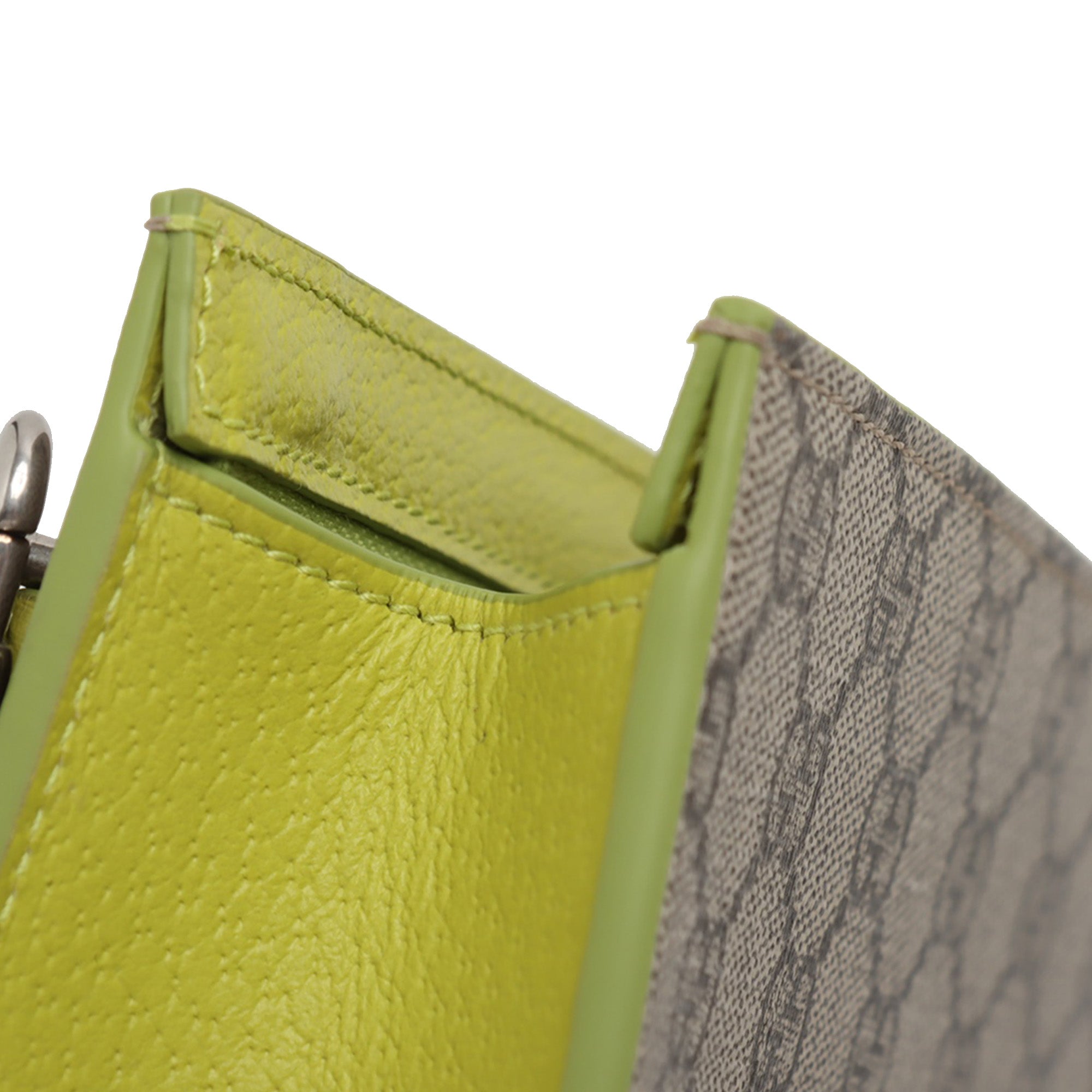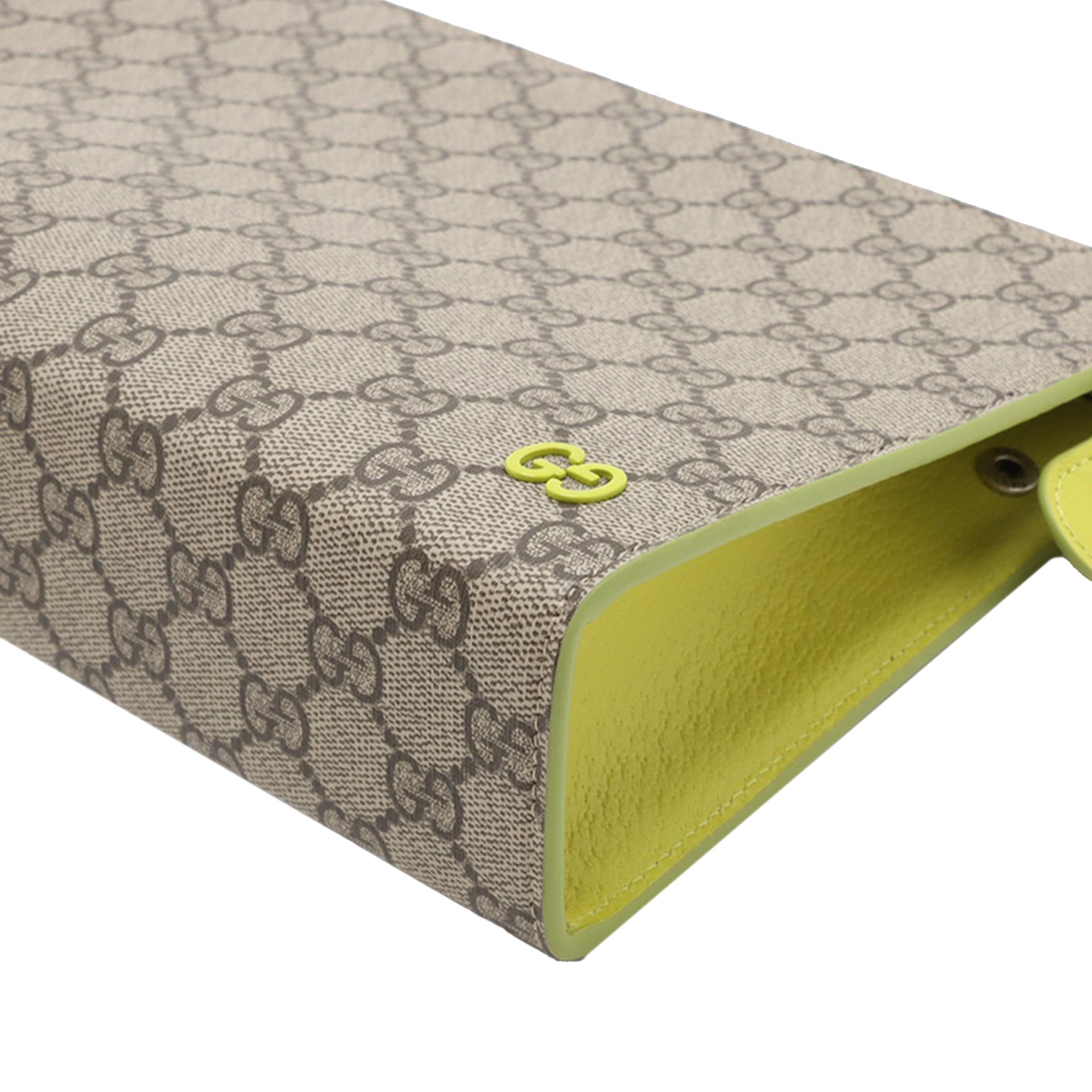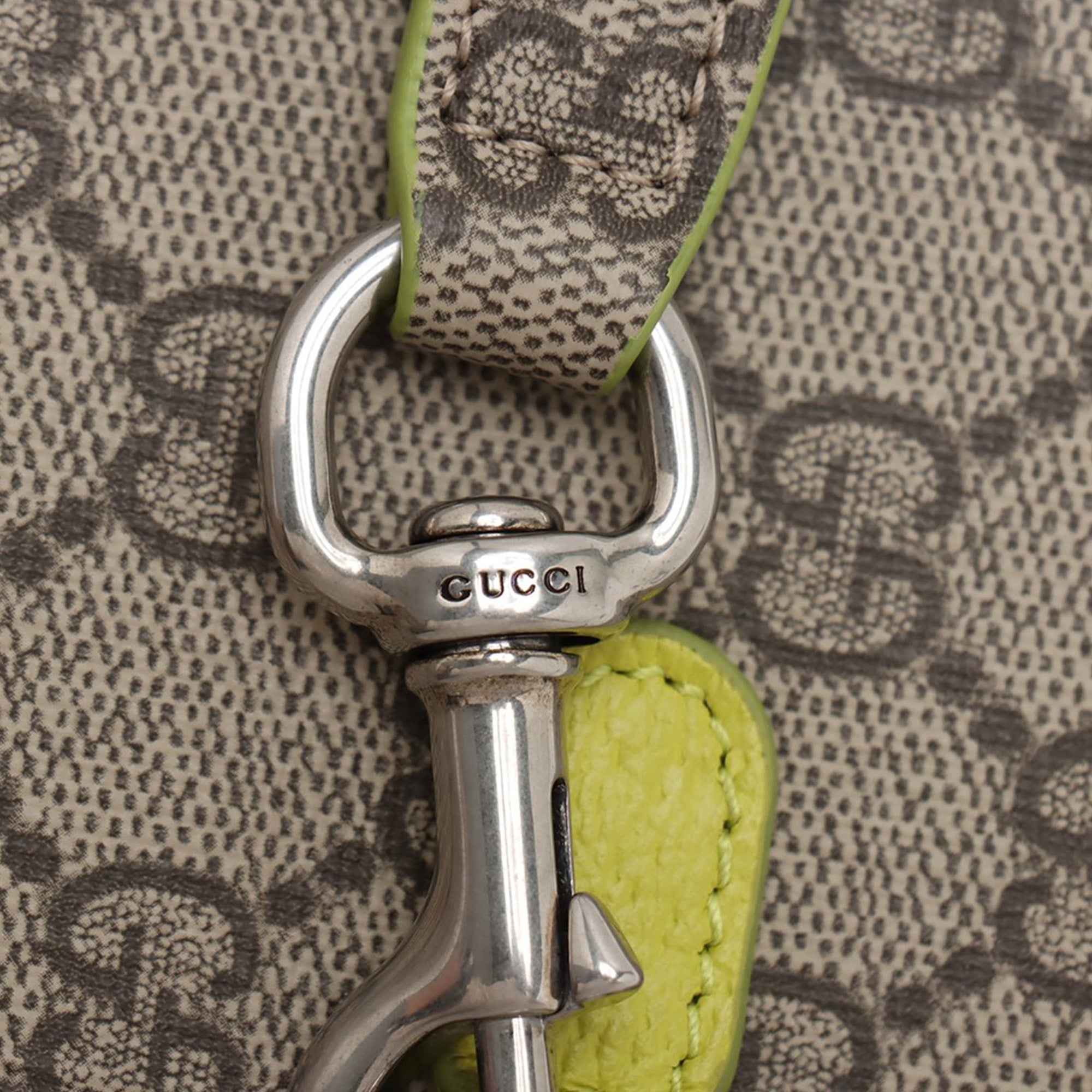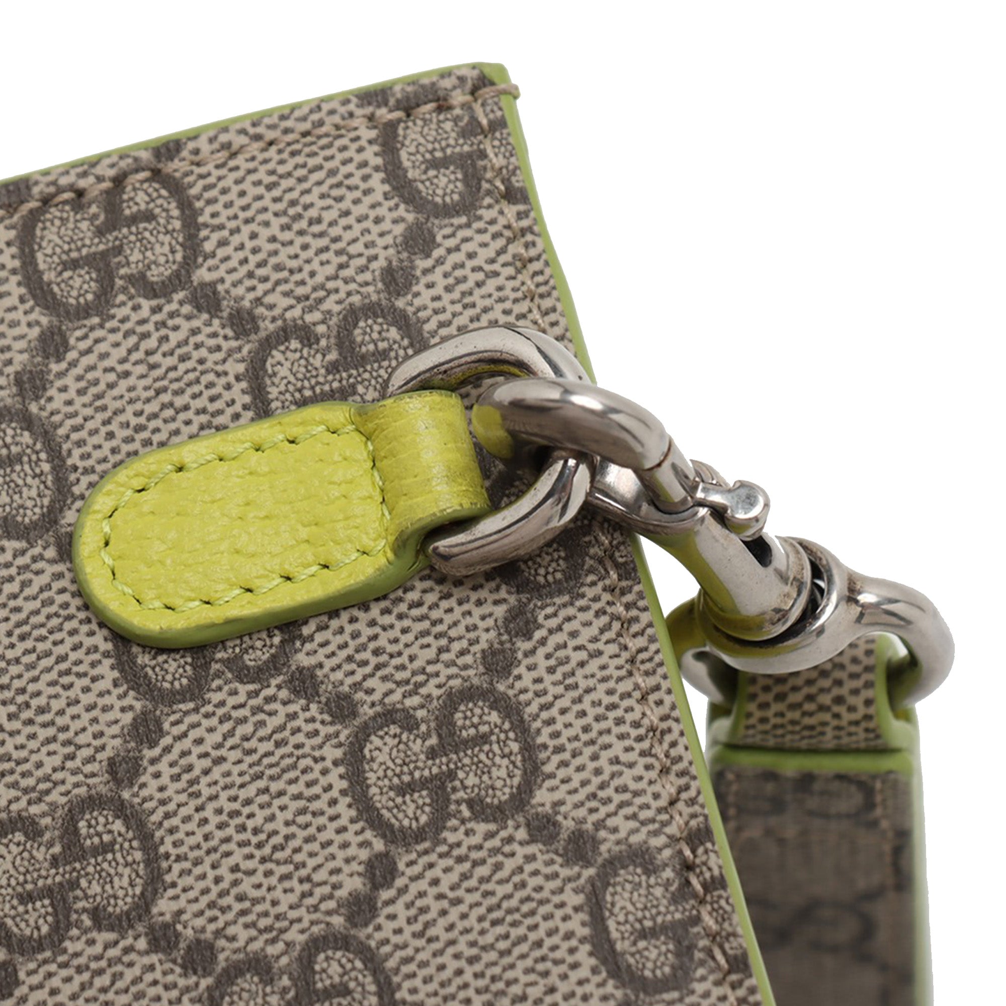 This pouch features a coated canvas body with leather trim, a detachable flat wrist strap, a top zip closure, and interior slip pockets. Retail Price: 1050.00