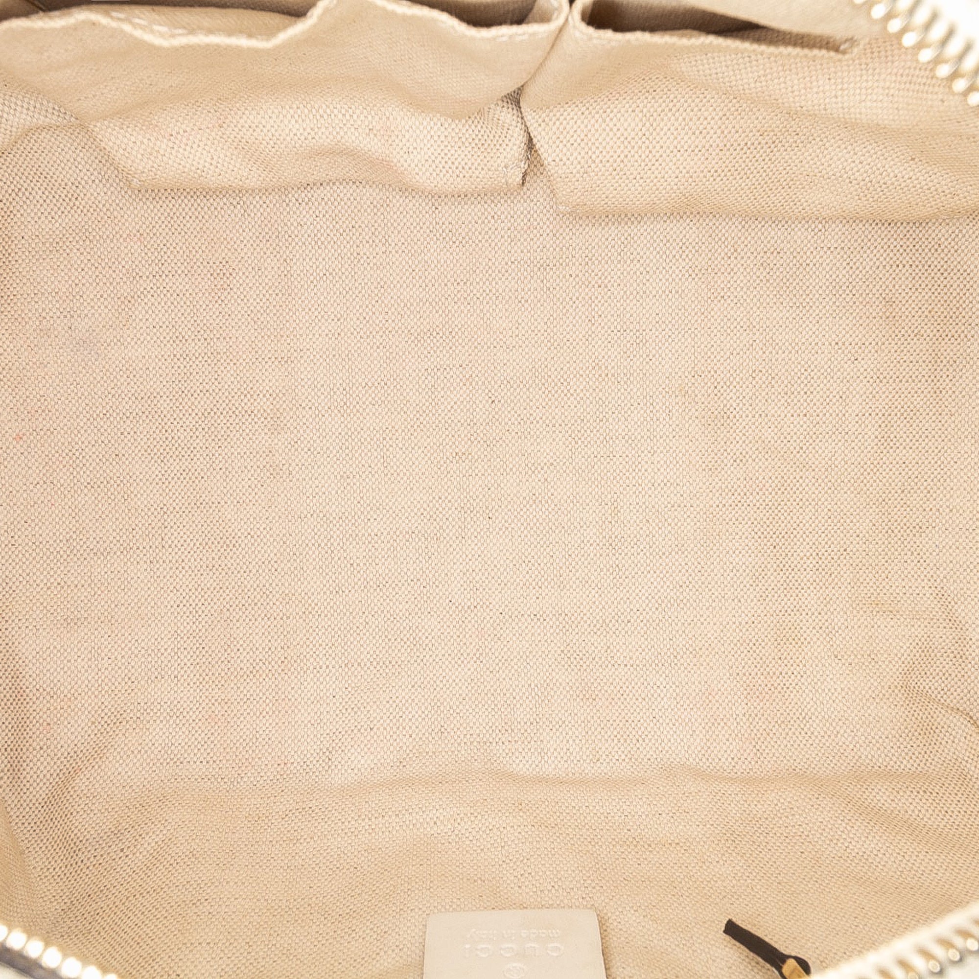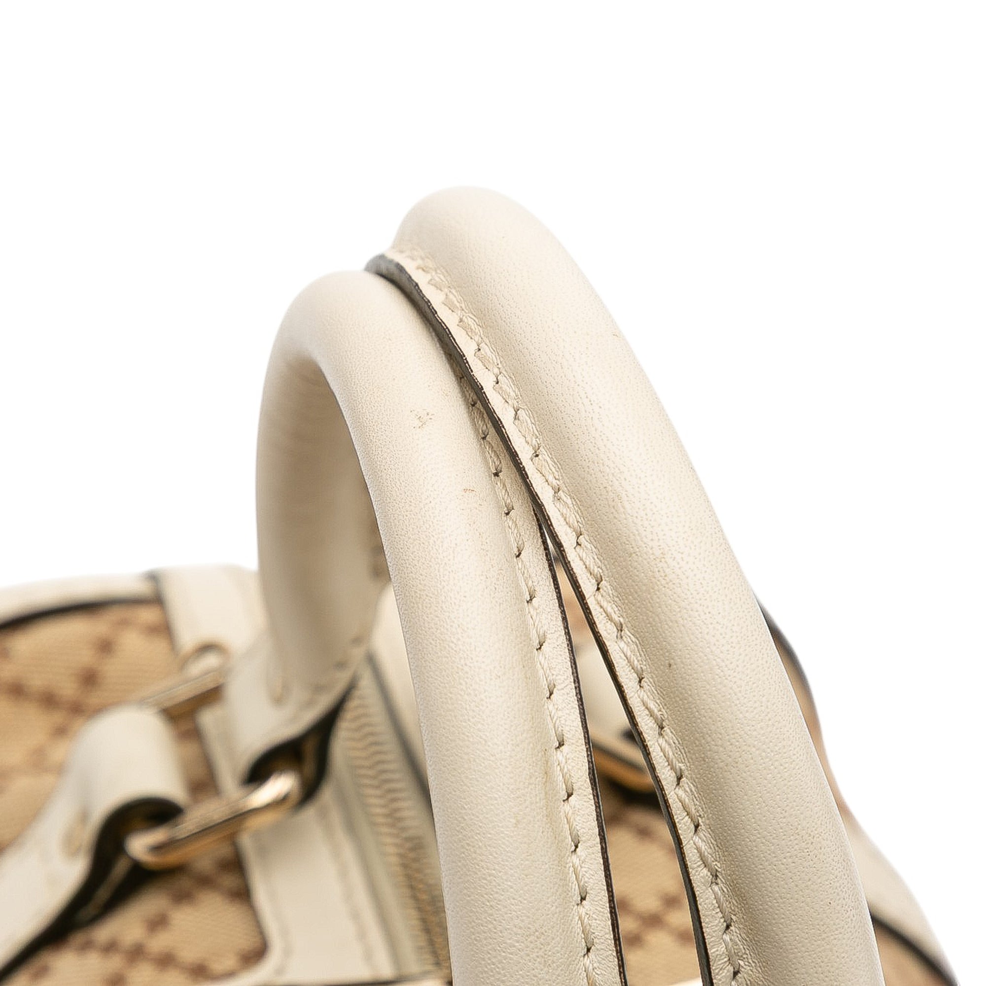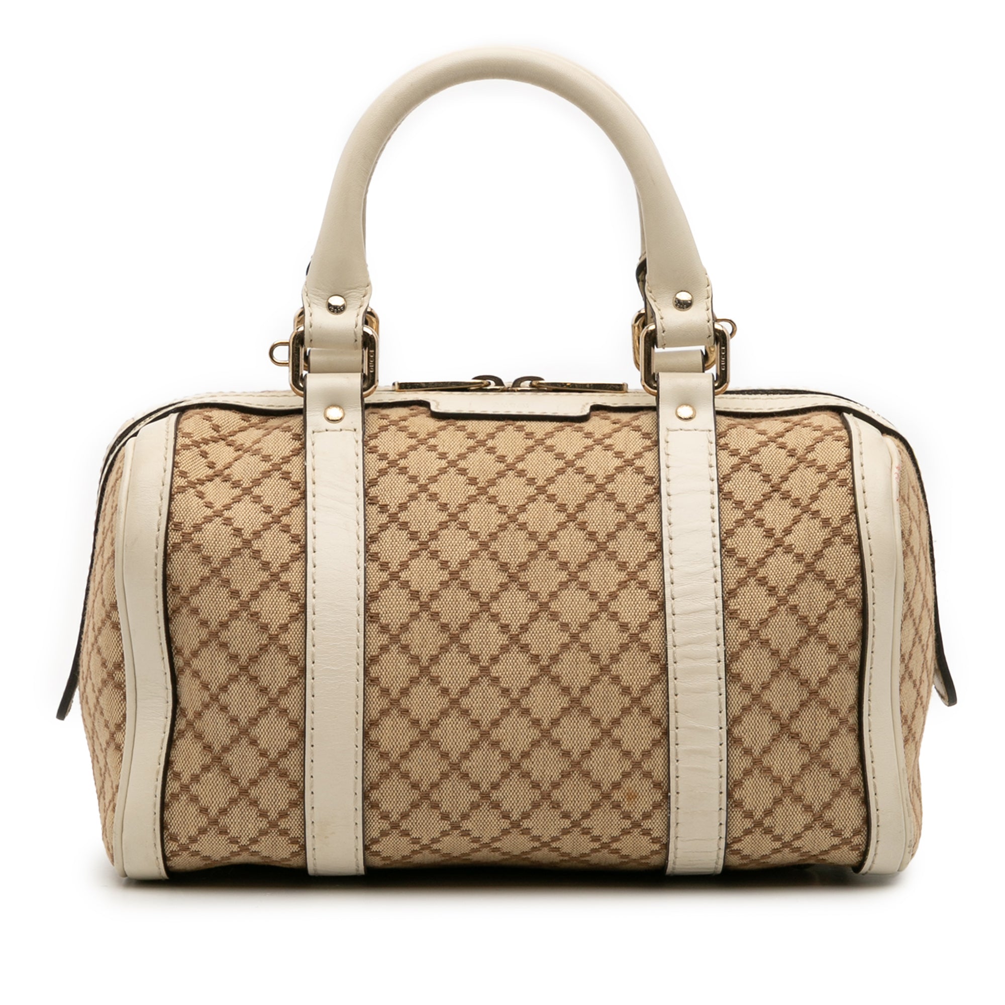 This boston bag features a canvas body with leather trim, rolled leather handles, a detachable leather shoulder strap, a top zip closure, and interior zip and slip pockets. Retail Price: 1675.00