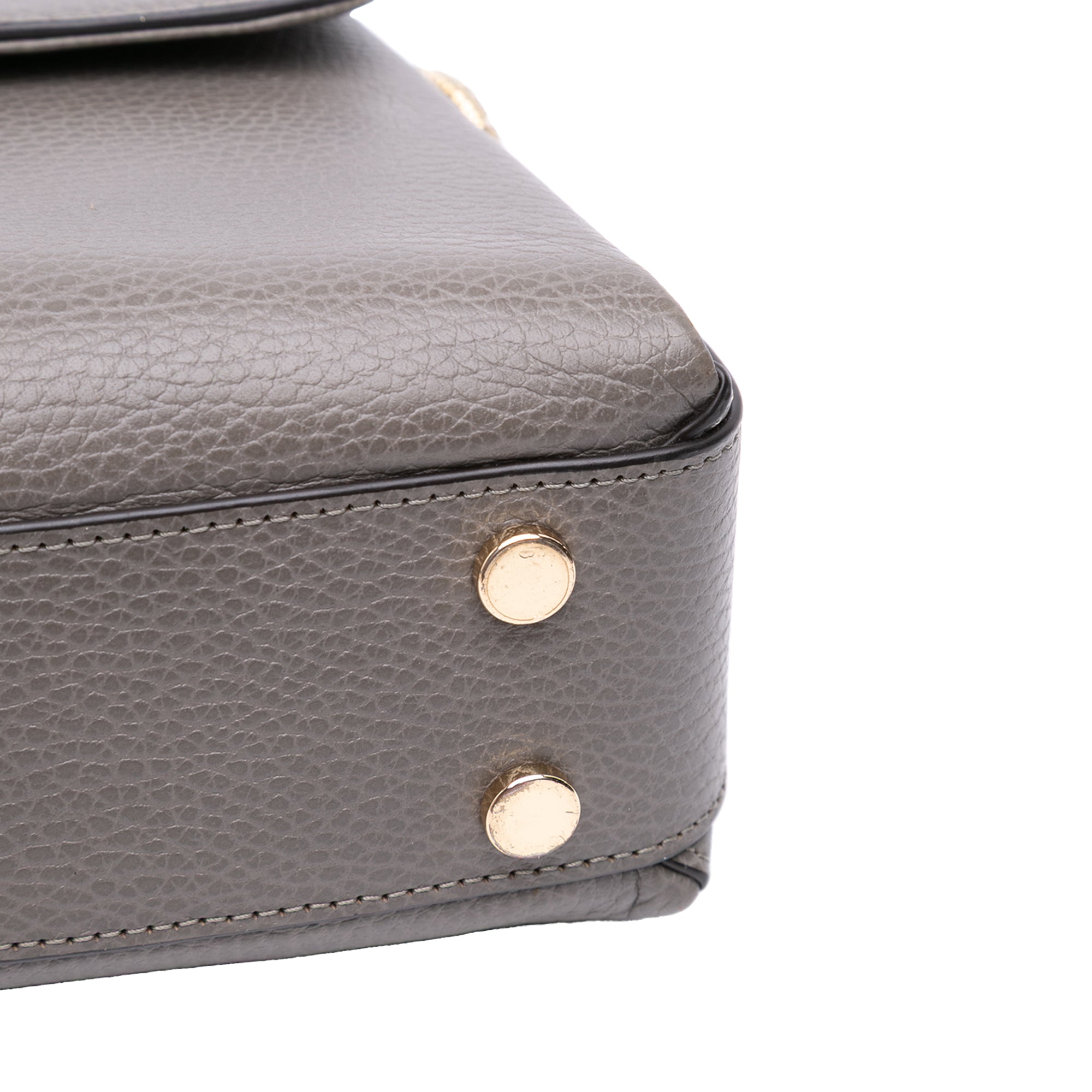 This satchel features a leather body, a flat leather handle, a detachable chain link shoulder strap with leather guard, a front flap with interlocking GG flip-lock closure, and interior zip and slip pockets. Retail Price: 1950.00