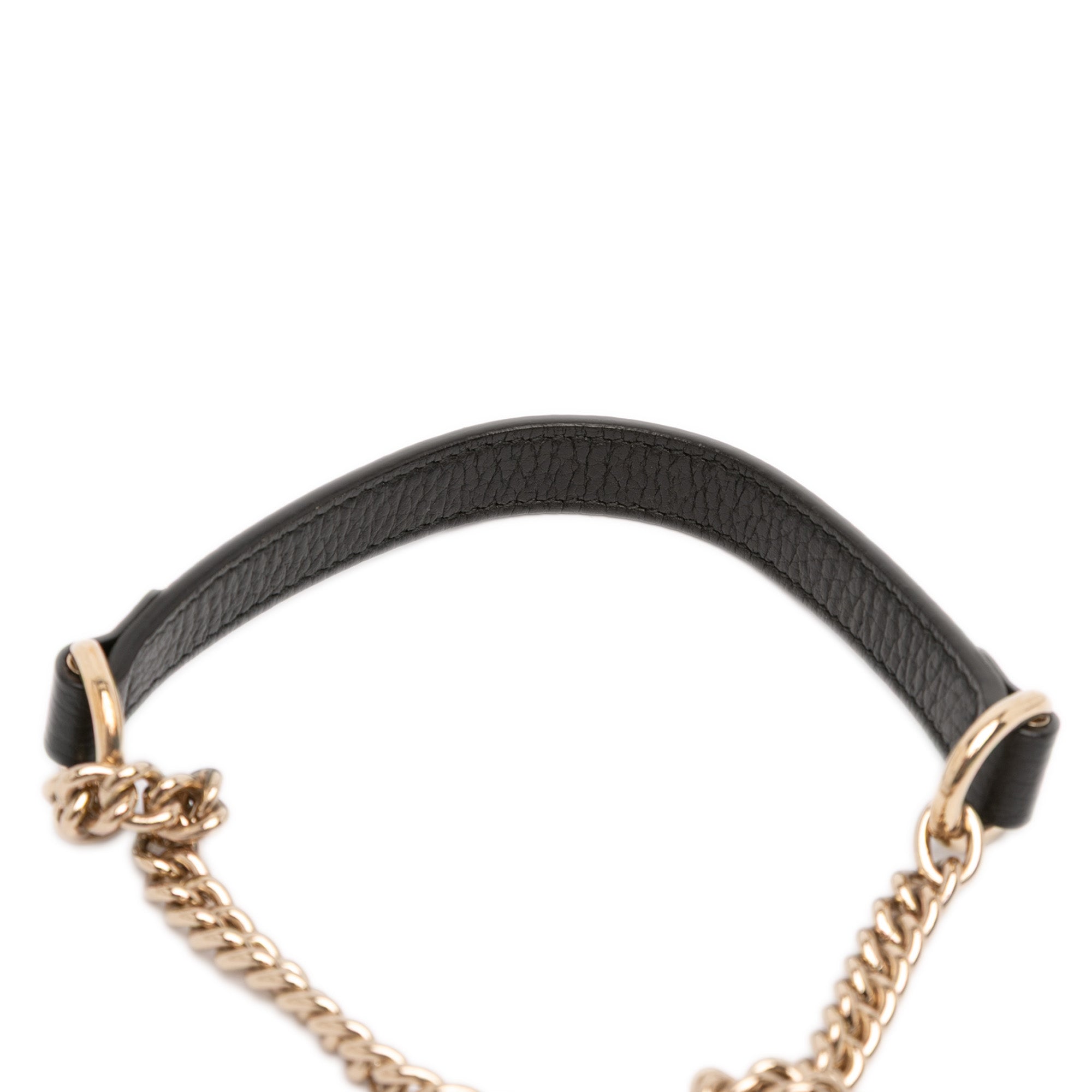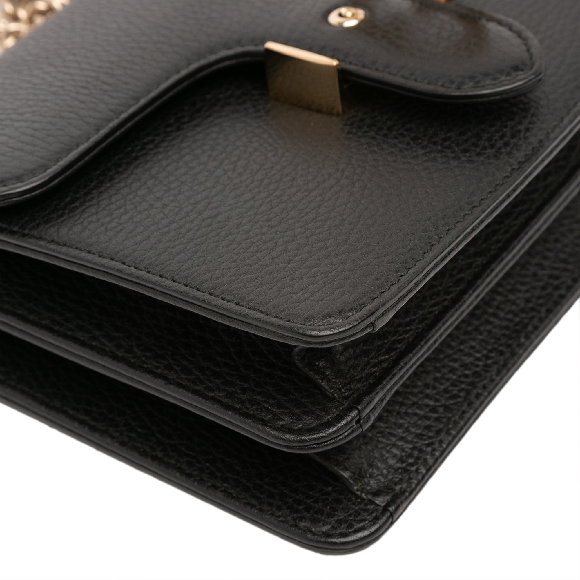 This crossbody bag features a leather body, a chain-link shoulder strap with leather shoulder guard, a front flap with snap button closure, and an interior slip pocket. Retail Price: 2450.00