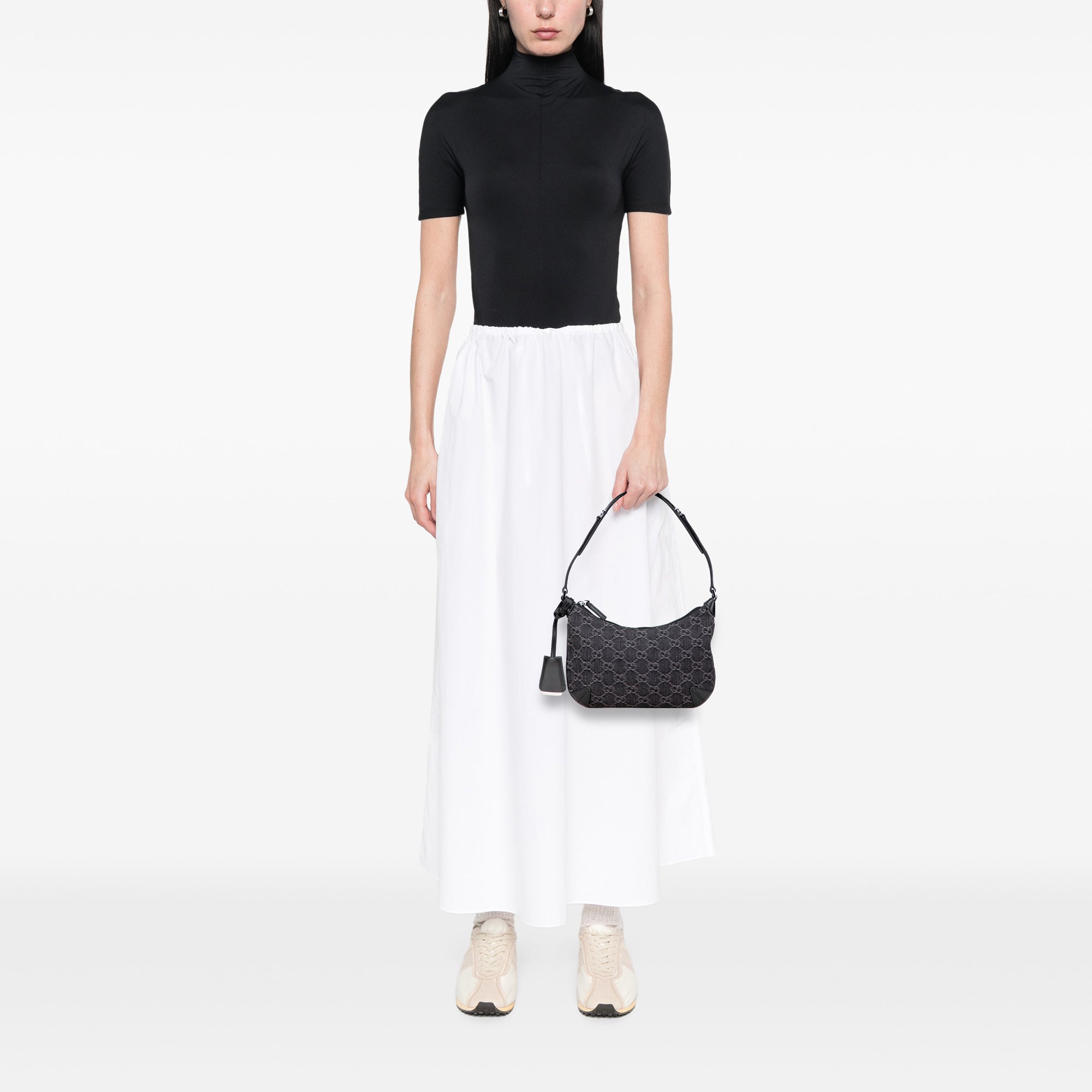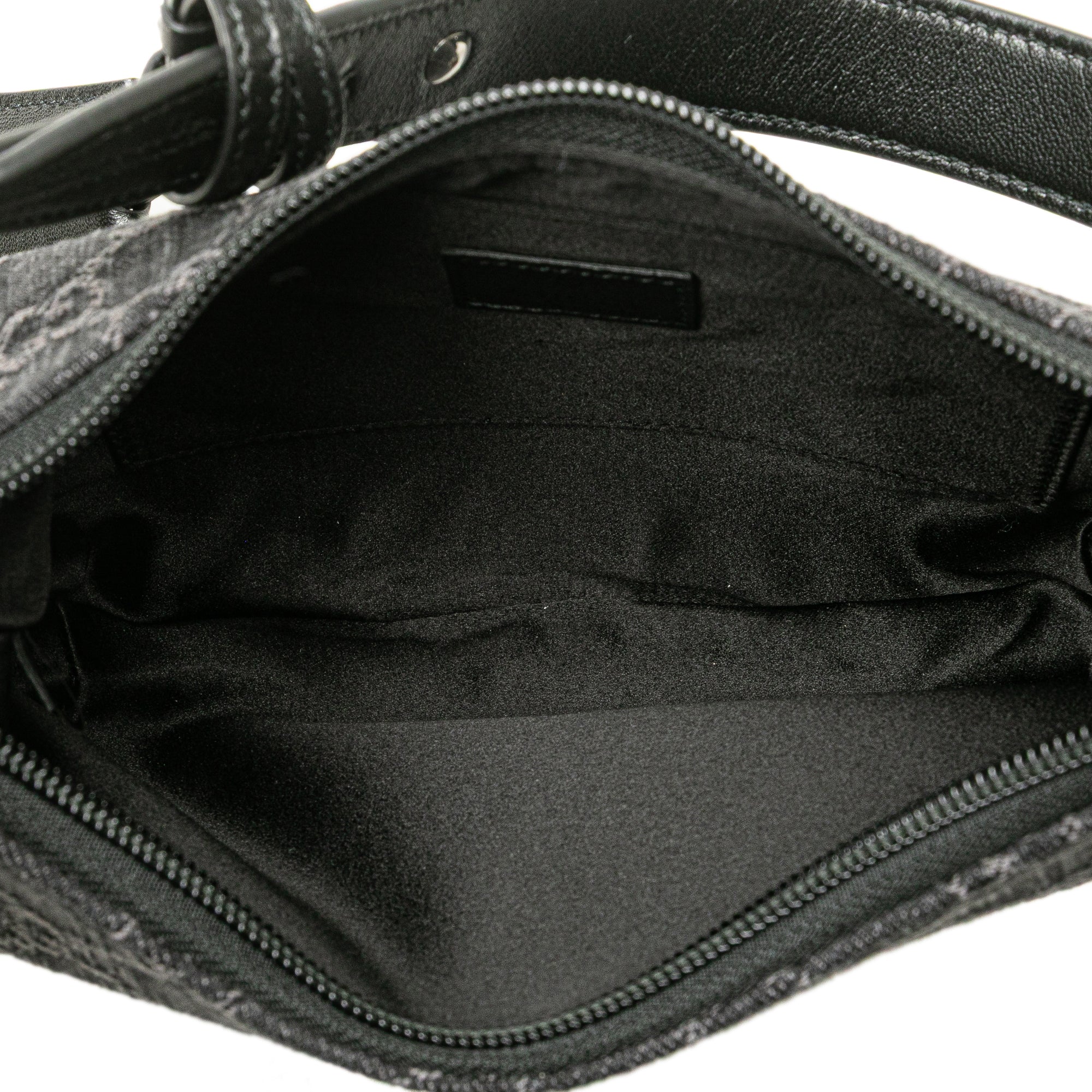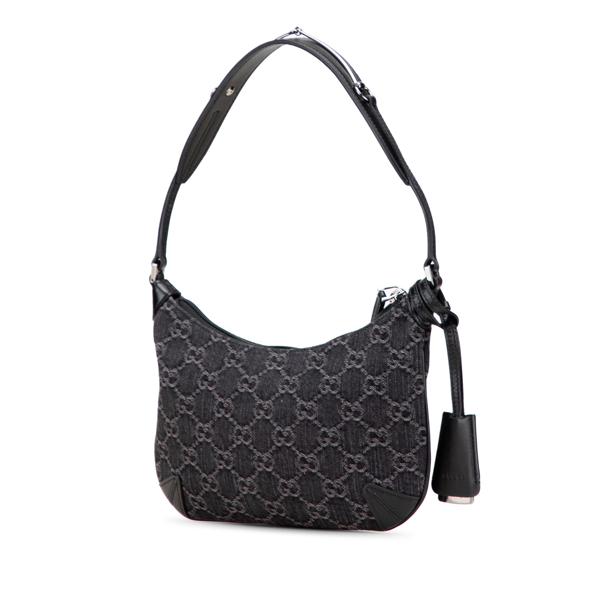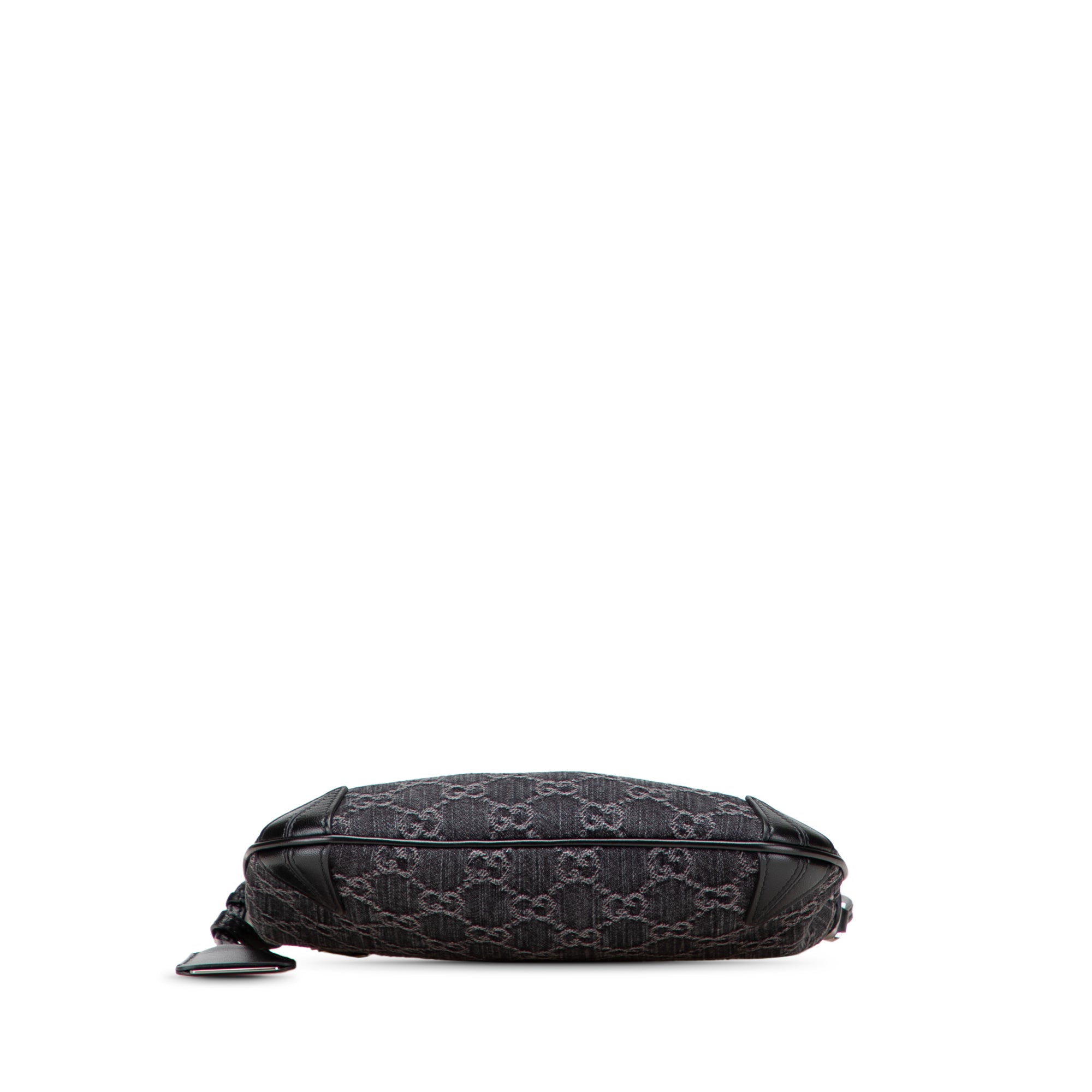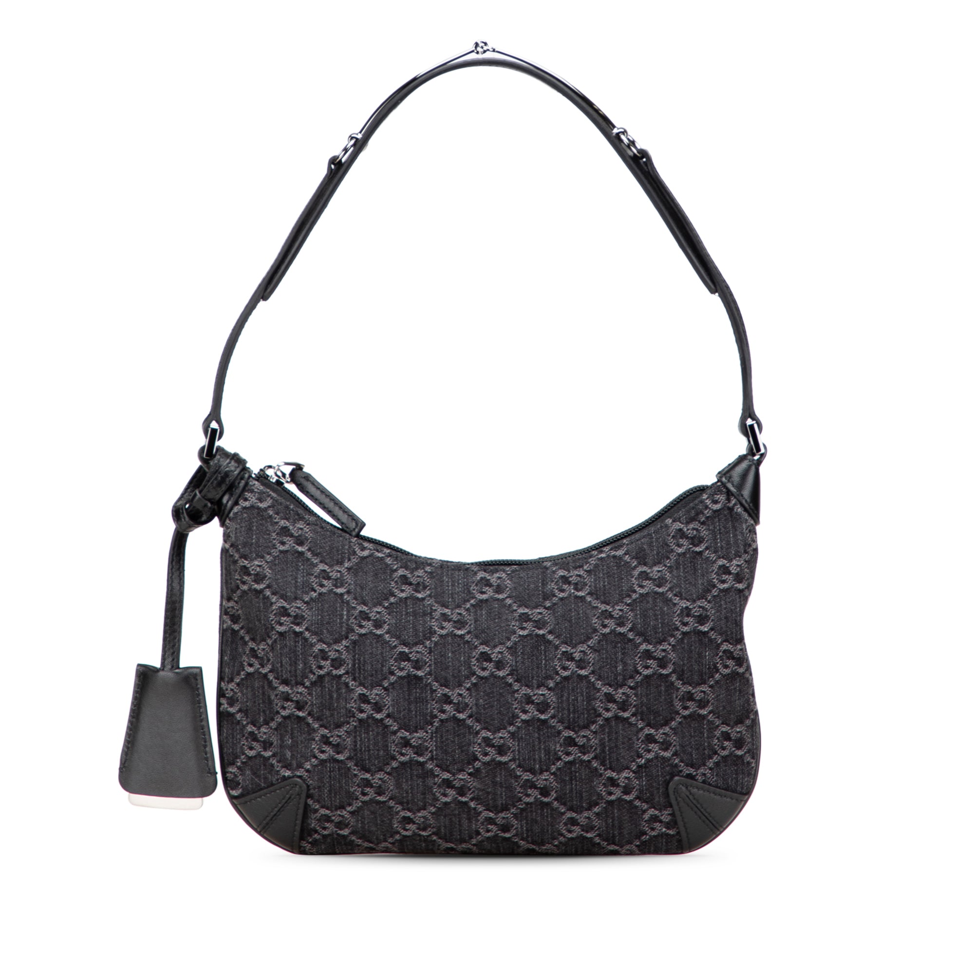This hobo bag features a denim body, a flat leather strap with horsebit details, a top zip closure, and an interior slip pocket. Inclusion: Dust bag. Retail Price: 1890.00