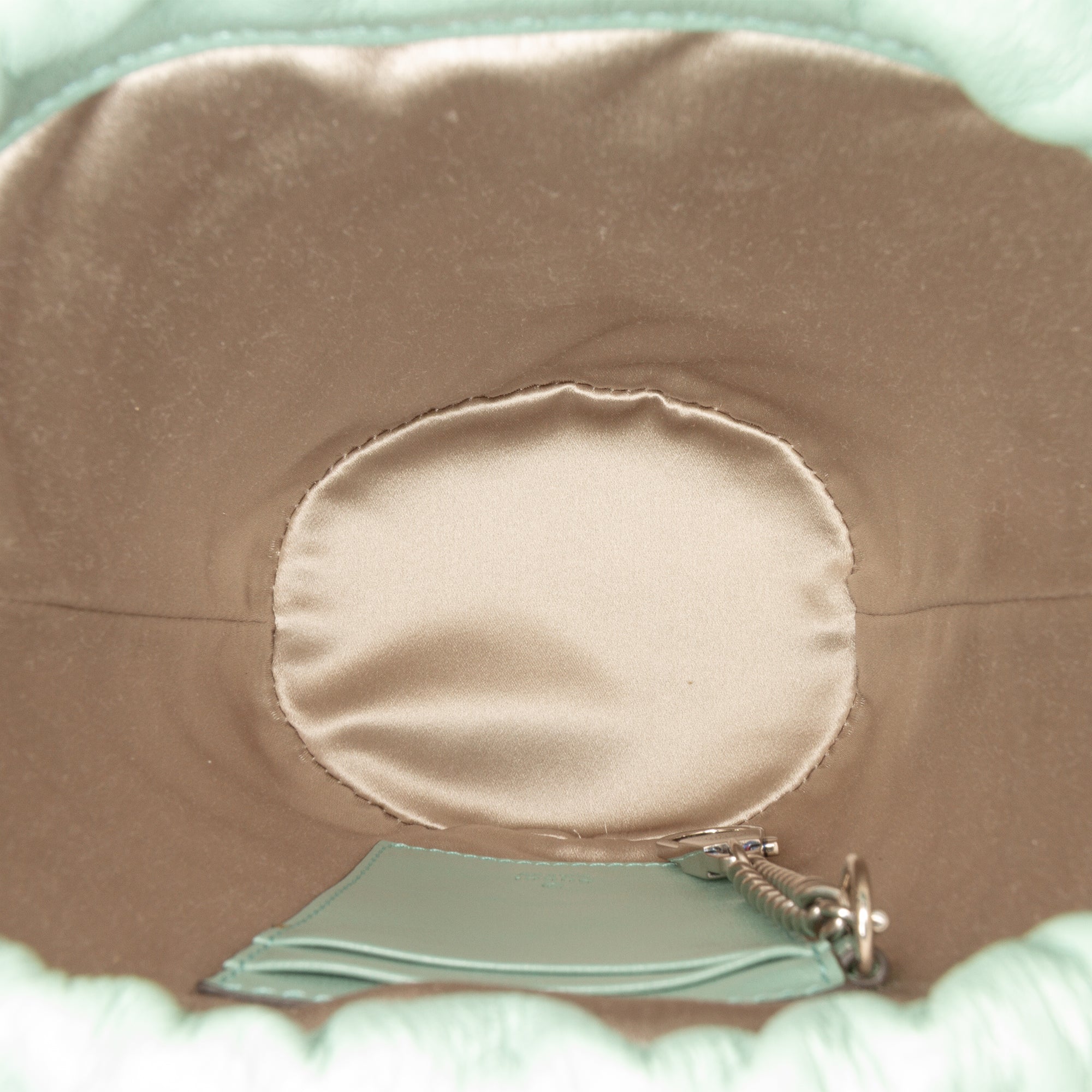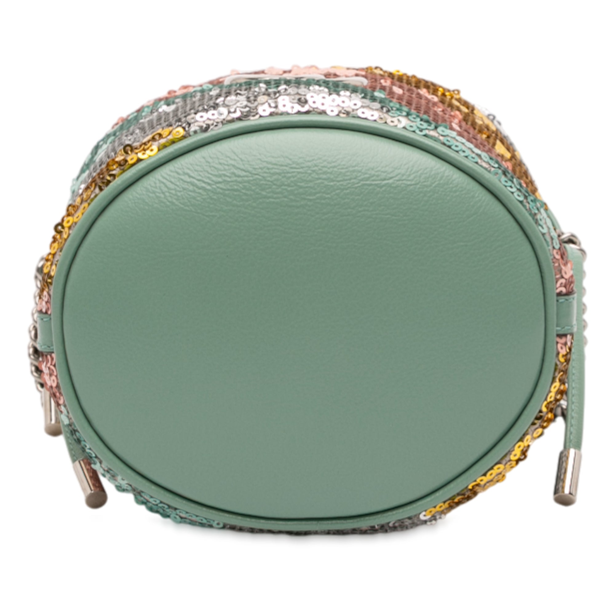 This bucket bag features a quilted leather body with sequins detail, a chain link strap, an open top with a drawstring closure, and interior slip pockets. Inclusion: Dust bag, box. Retail Price: 1095.00