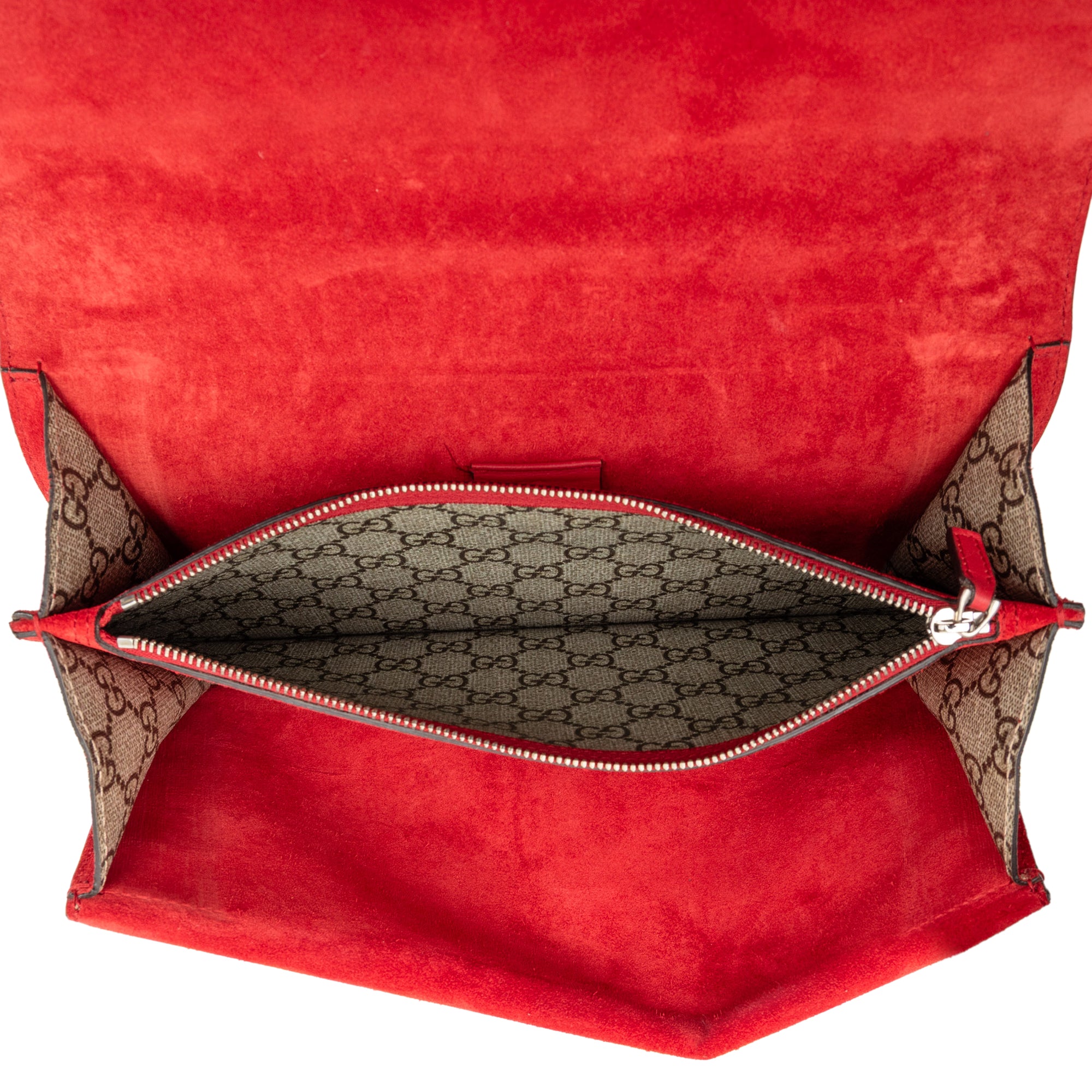 This Dionysus features a coated canvas body with suede leather trim, a silver-tone curb chain link strap, a front flap with push lock closure, and interior zip and slip compartments. Retail Price: 2500.00