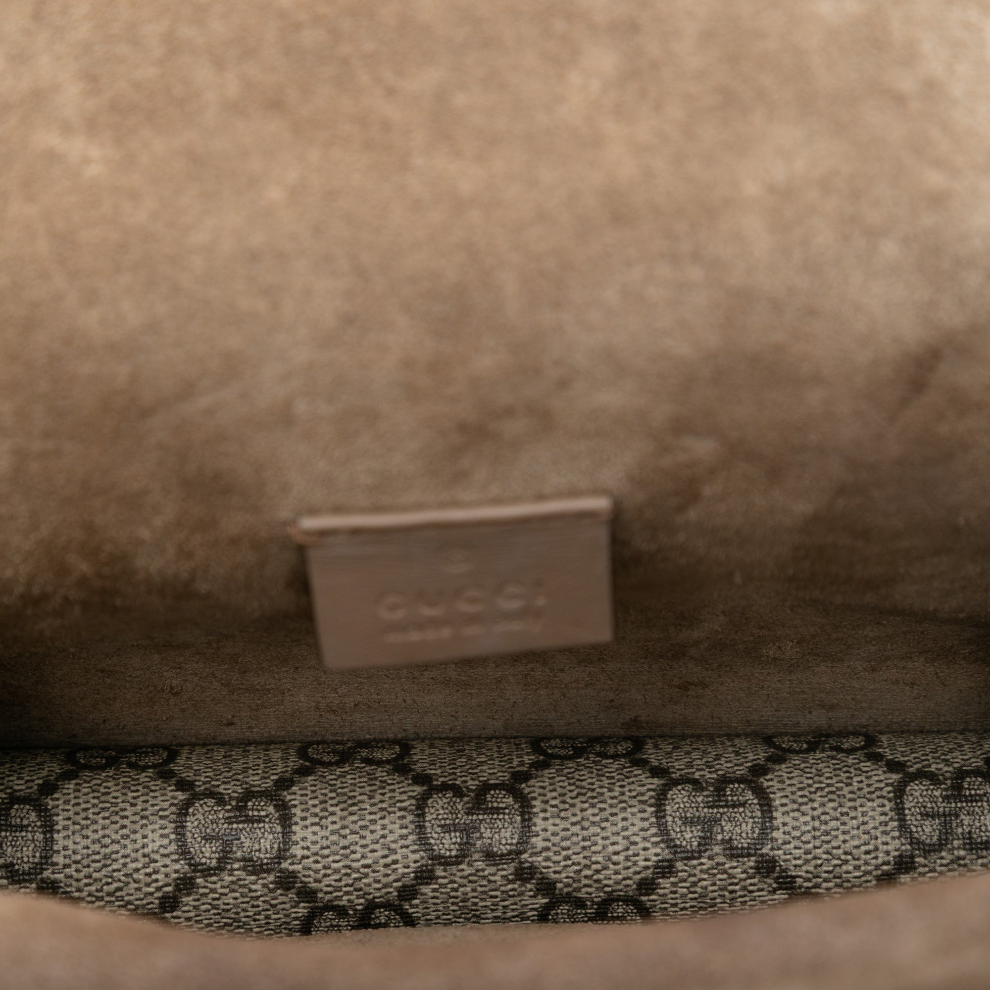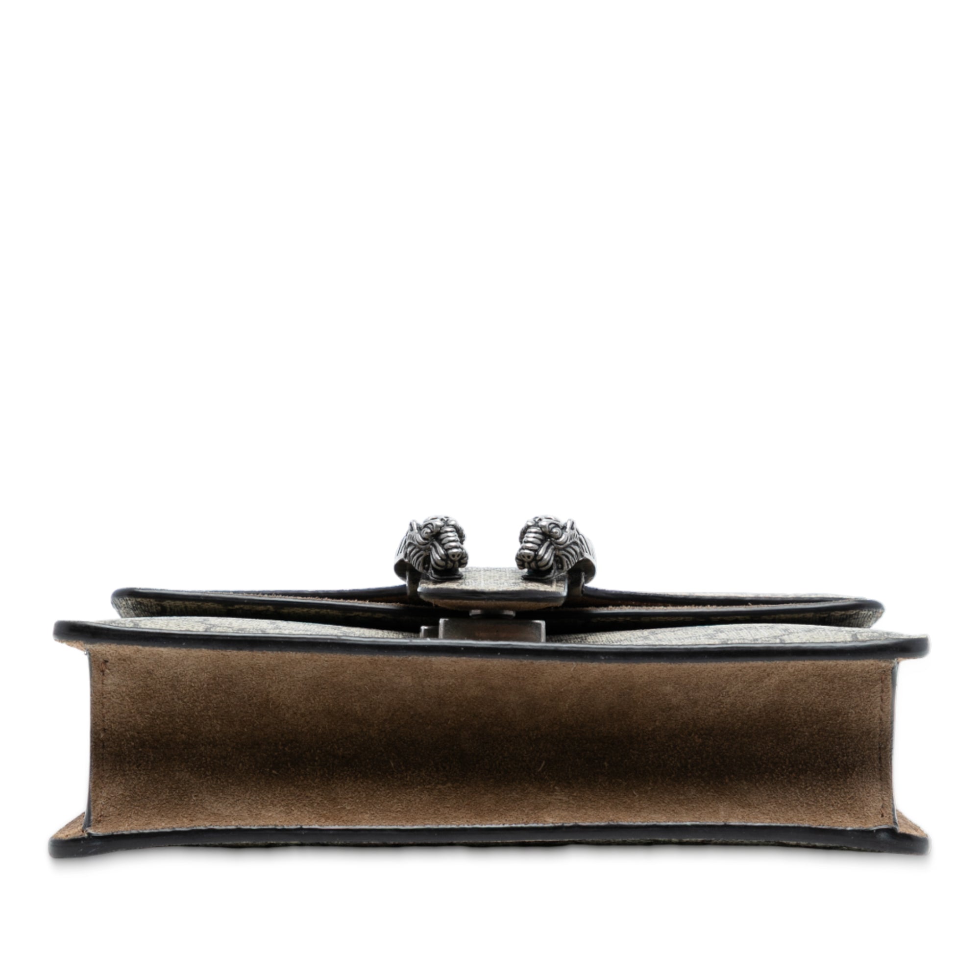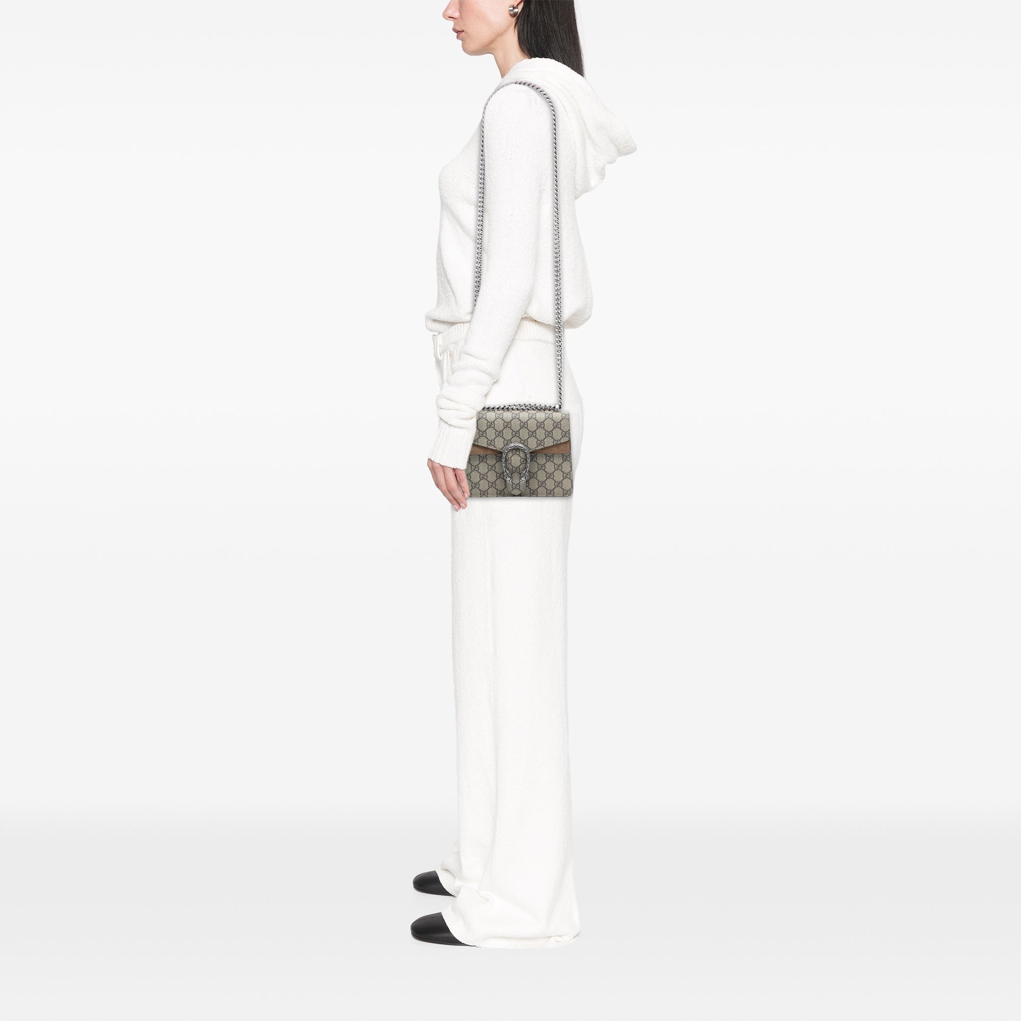 The Dionysus Crossbody bag features a coated canvas body with suede leather trim, a silver-tone chain strap, a top flap with a magnetic snap button closure, and an interior zip compartment. Inclusion: Dust bag. Retail Price: 2400.00