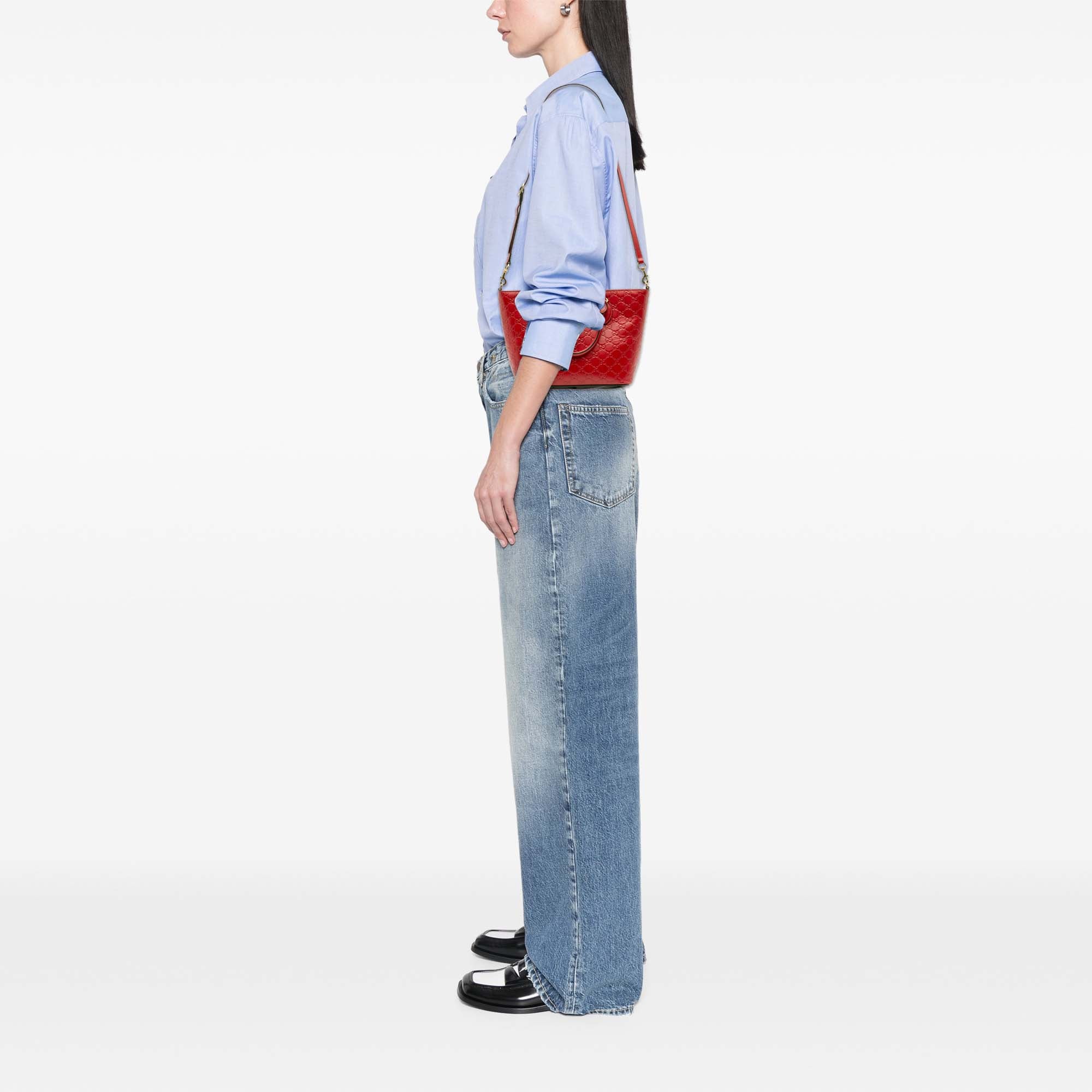 This satchel features an embossed leather body, rolled leather handles, a detachable flat leather strap, a top zip closure, and interior zip and slip pockets. Retail Price: 2990.00