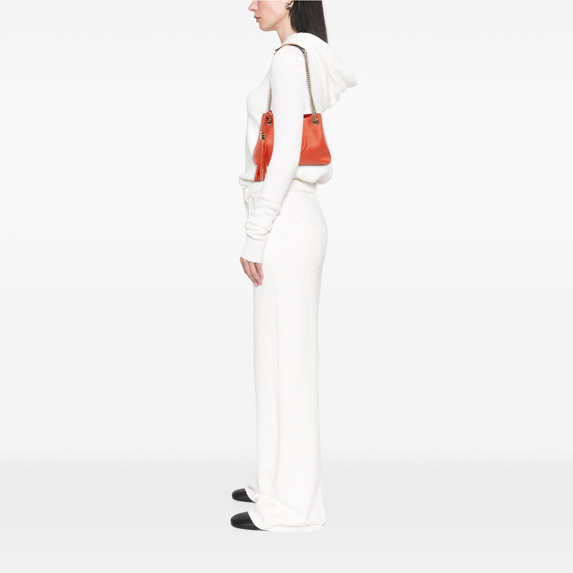 This tote bag features a leather body, a gold-tone curb chain link straps with leather guard, an open top, and interior slip pockets. Retail Price: 1300.00