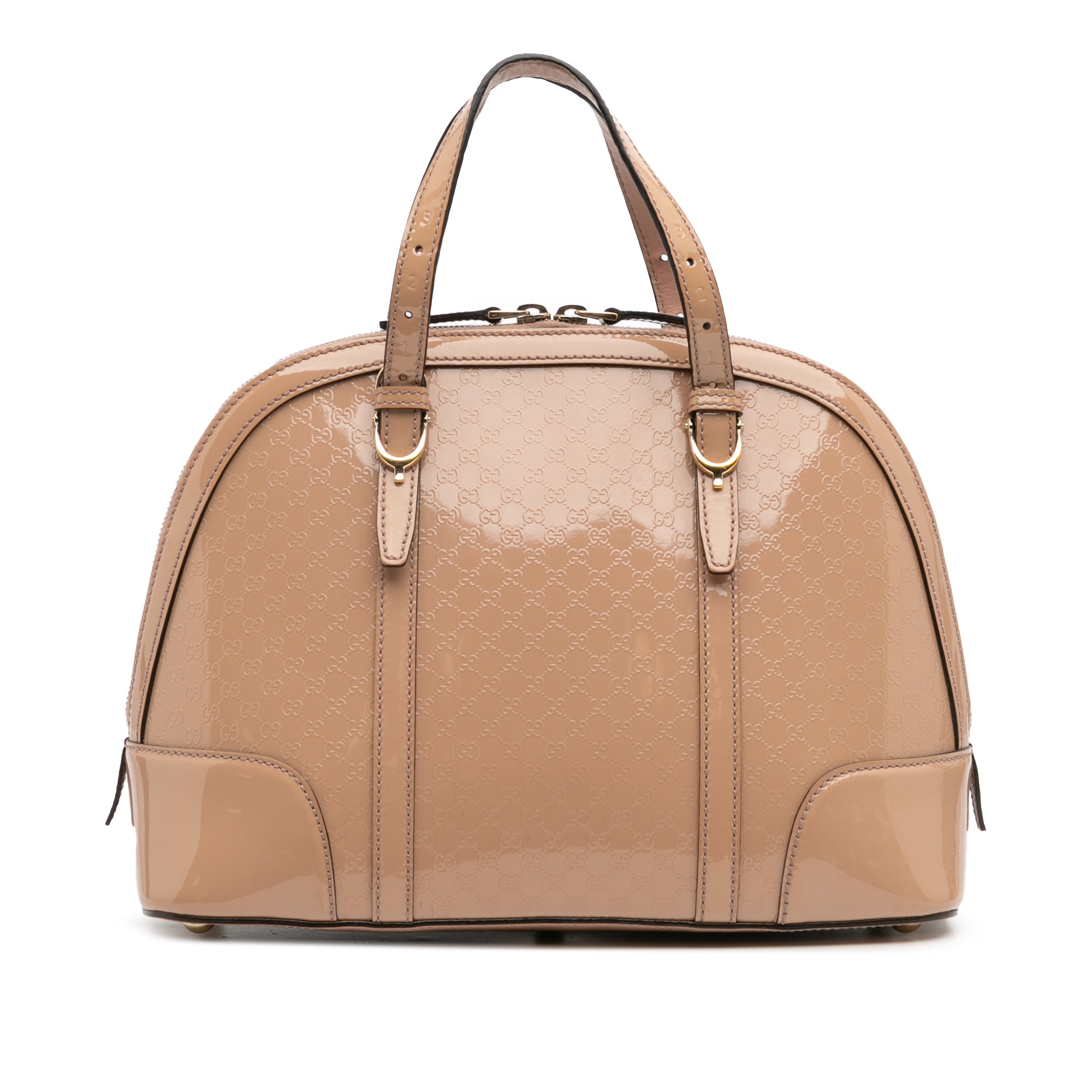 The Nice satchel features a patent leather body, flat leather handles, a top zip closure, and interior slip and zip pockets. Retail Price: 1255.00