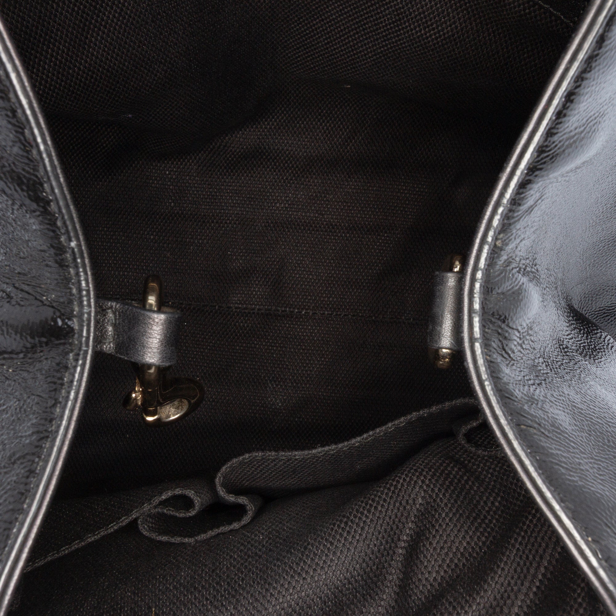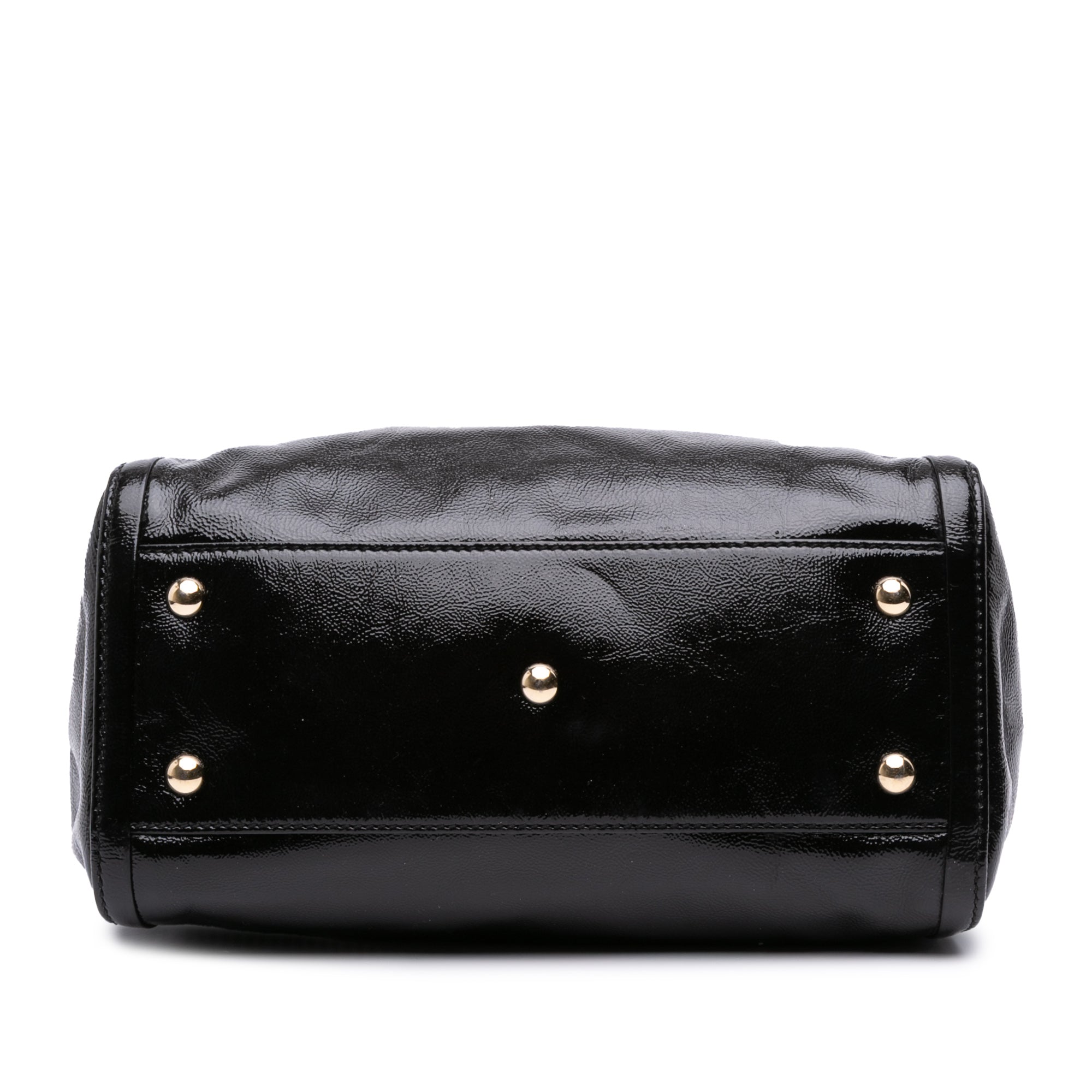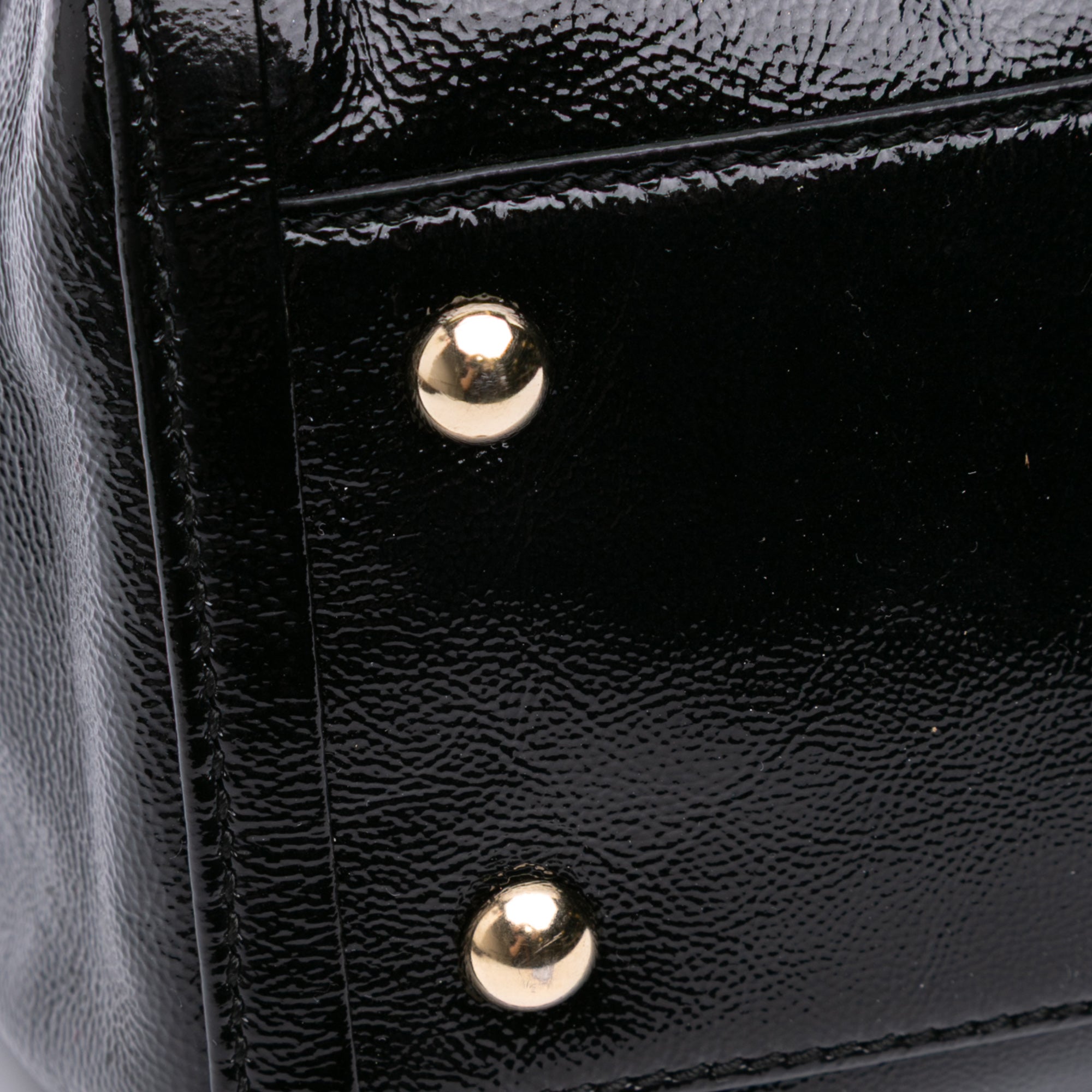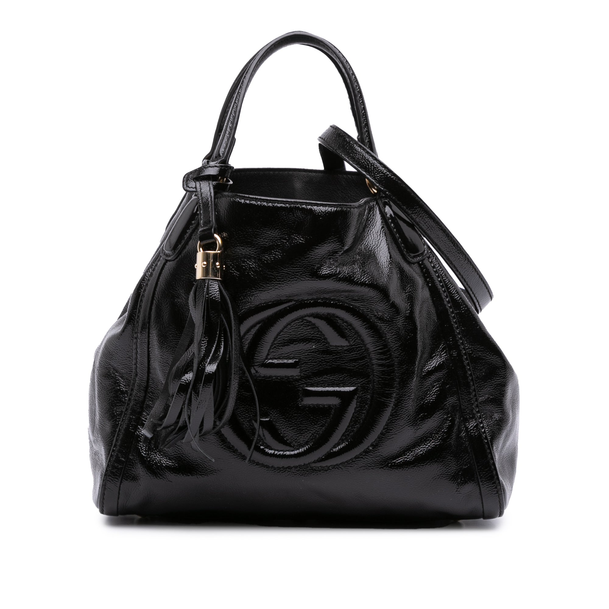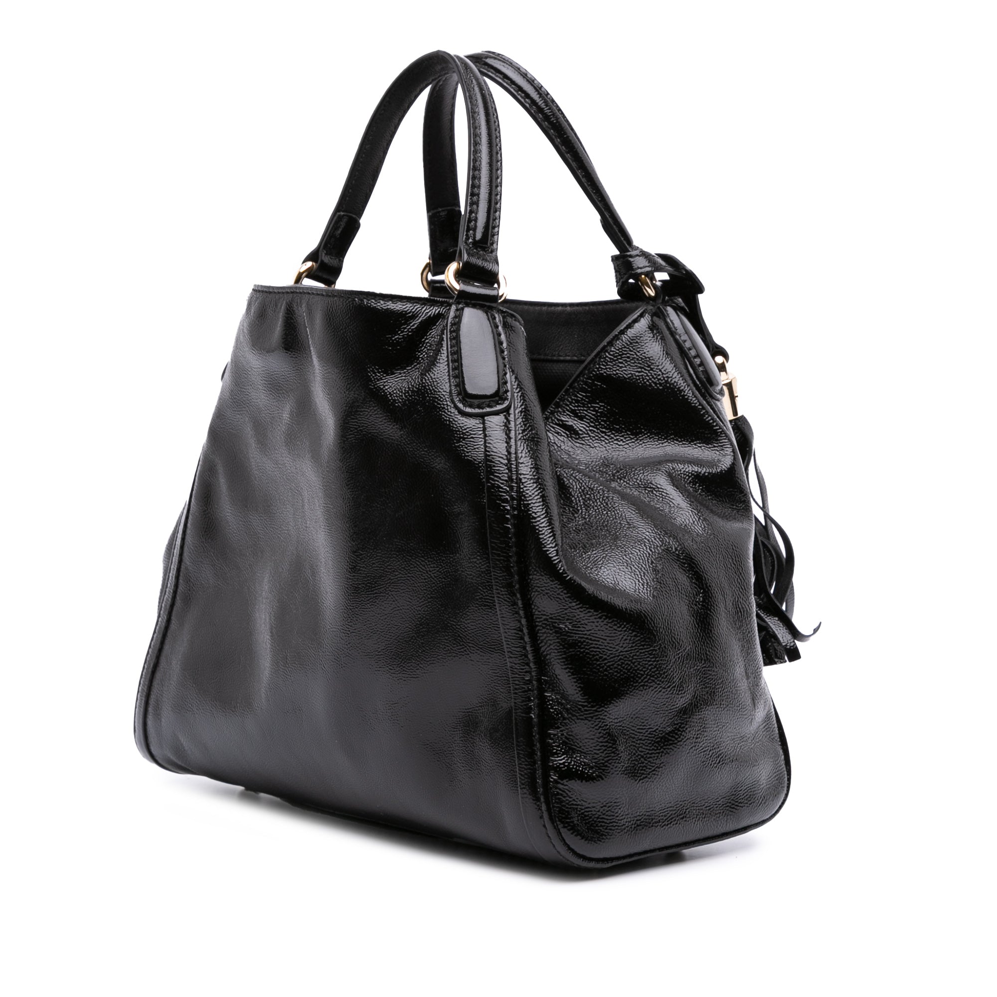 The Soho features a patent leather body, flat leather handles with tassel details, a detachable flat strap, an open top with lobster claw closure, and interior zip and slip pockets. Inclusion: Dust bag. Retail Price: 950.00