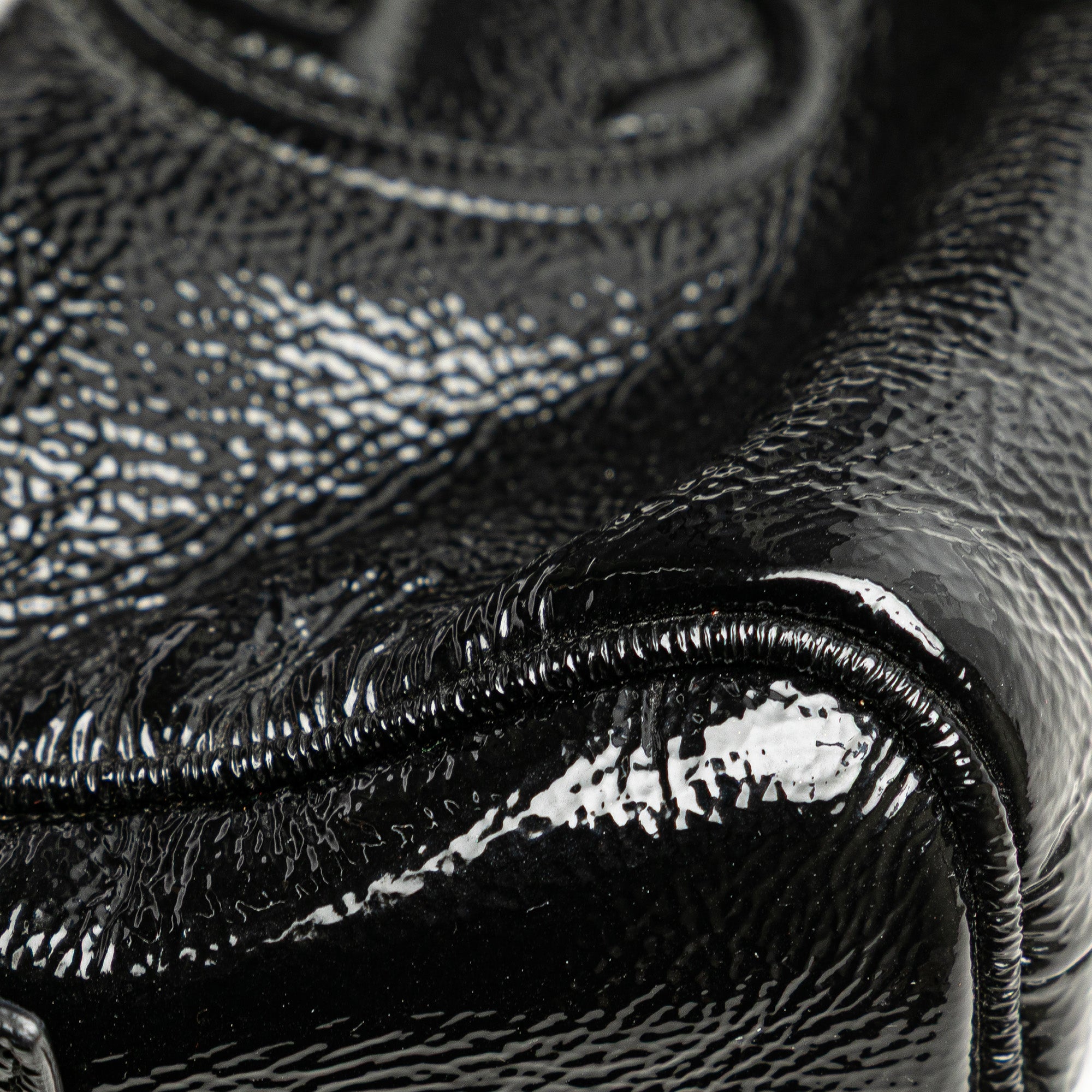 This clutch bag features a patent leather body, a top zip closure, and an interior slip pocket. Retail Price: 850.00