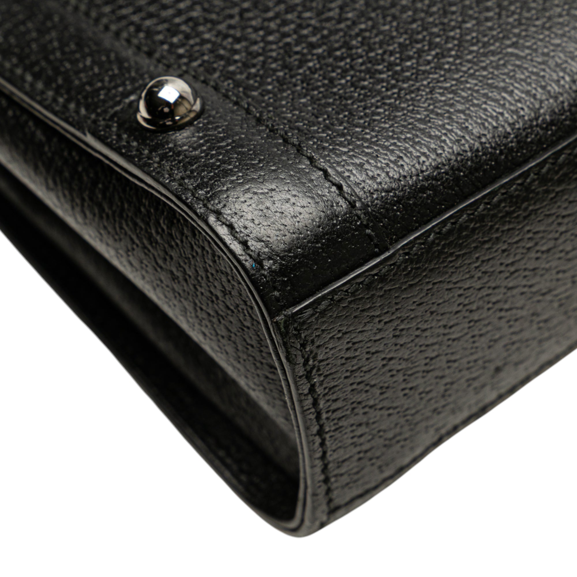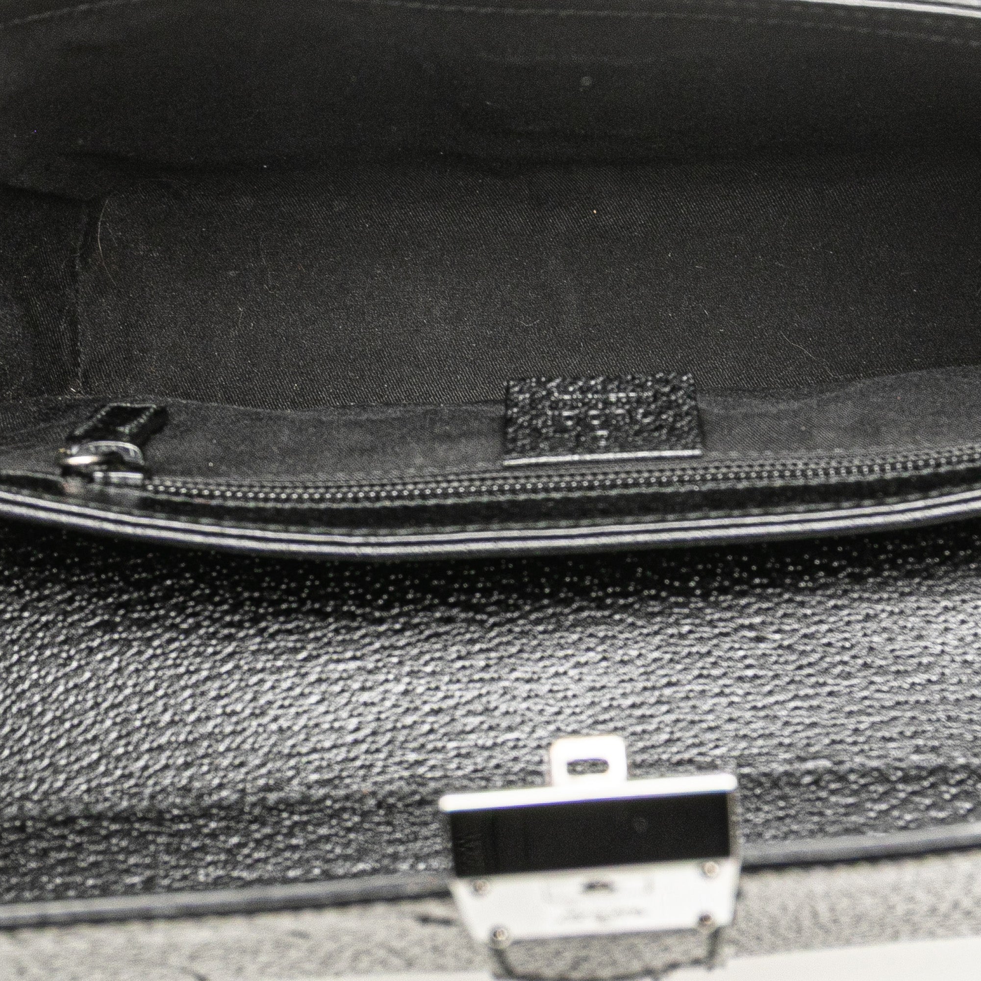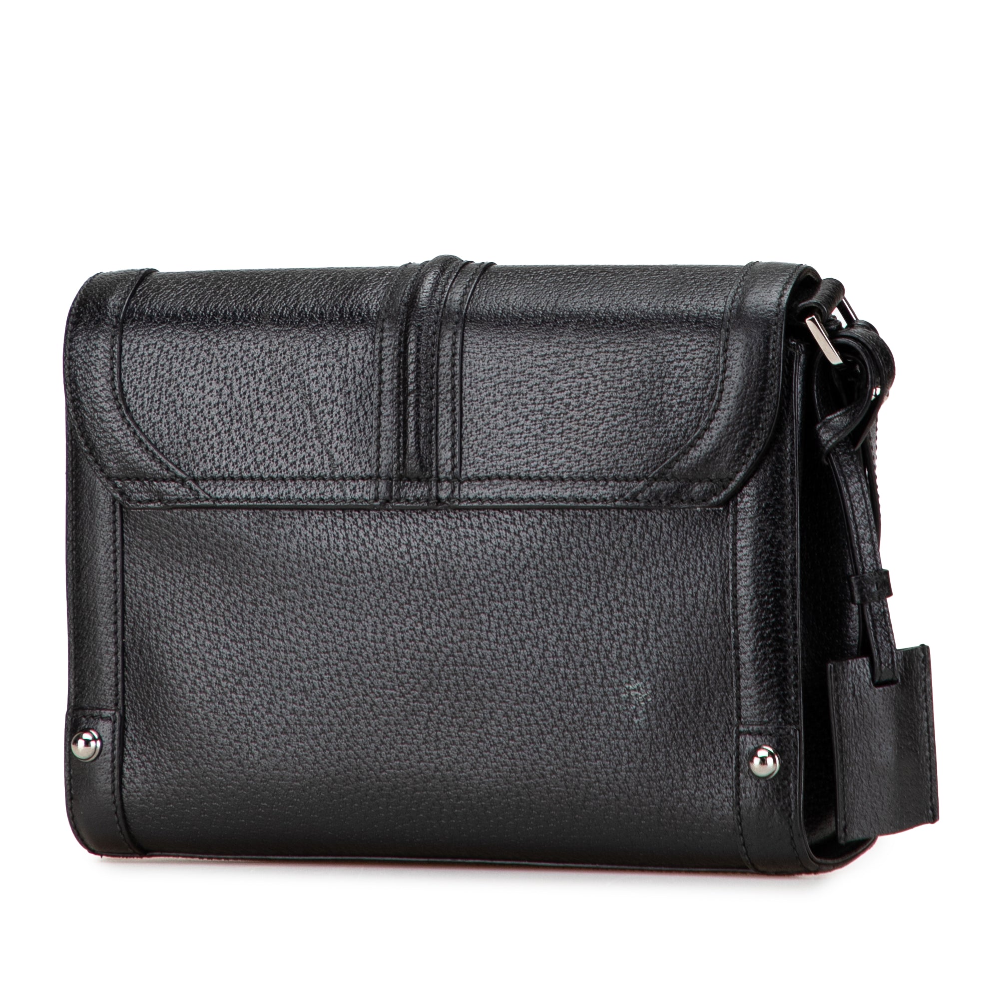 This clutch features a leather body, a flat leather wrist strap, a front flap with push lock closure, and an interior zip pocket. Retail Price: 850.00