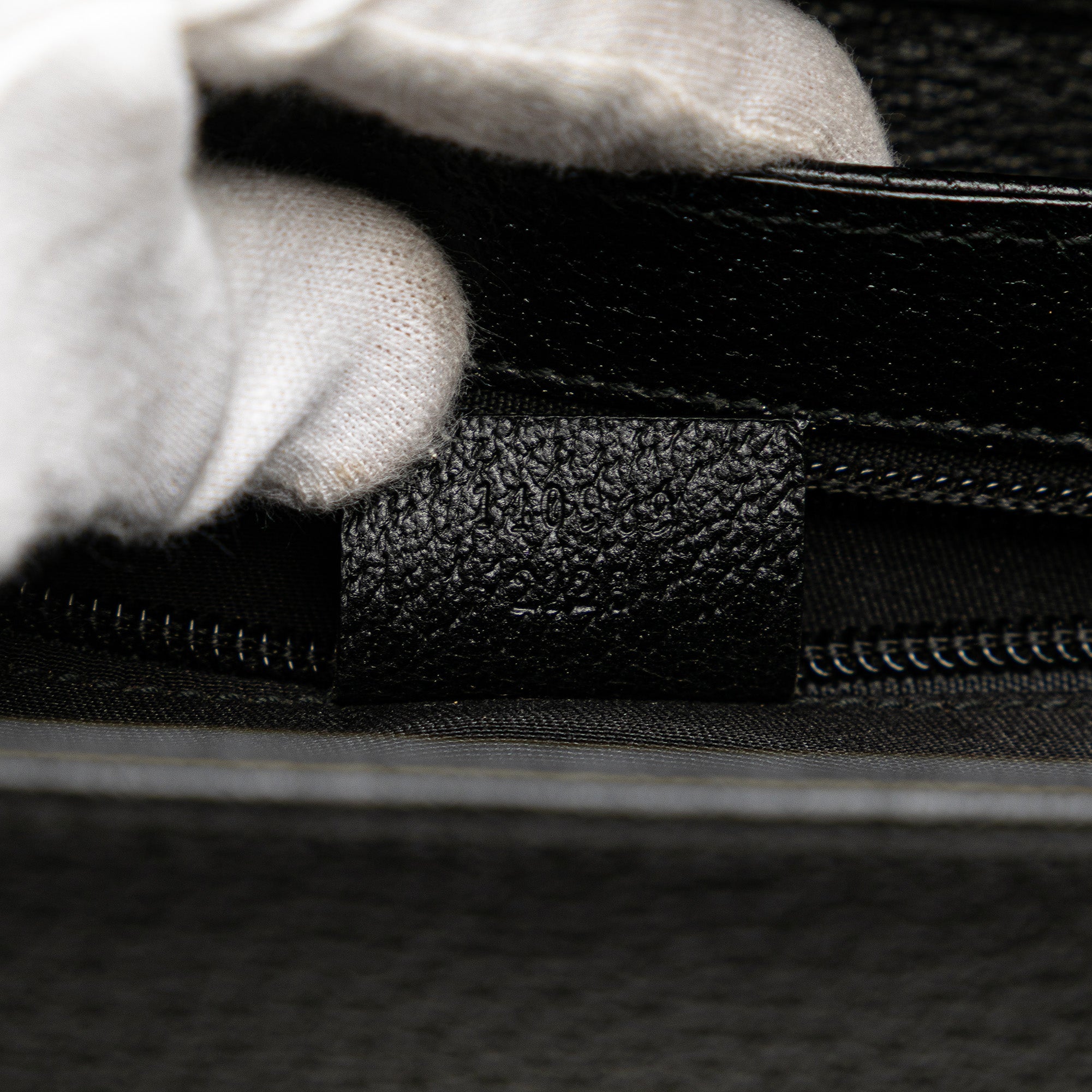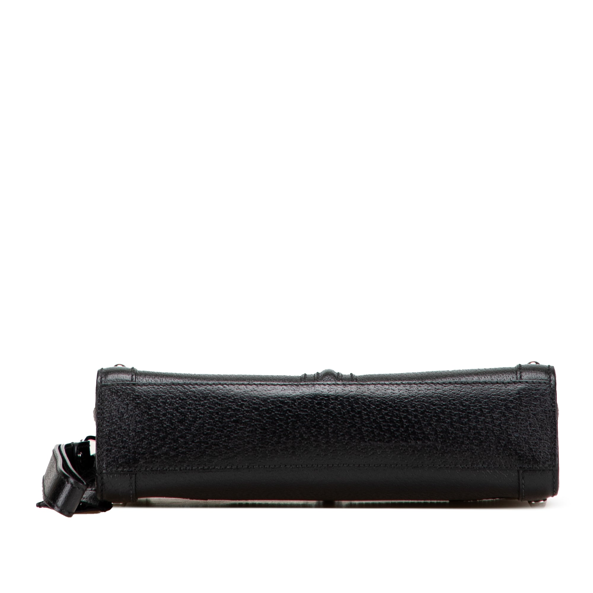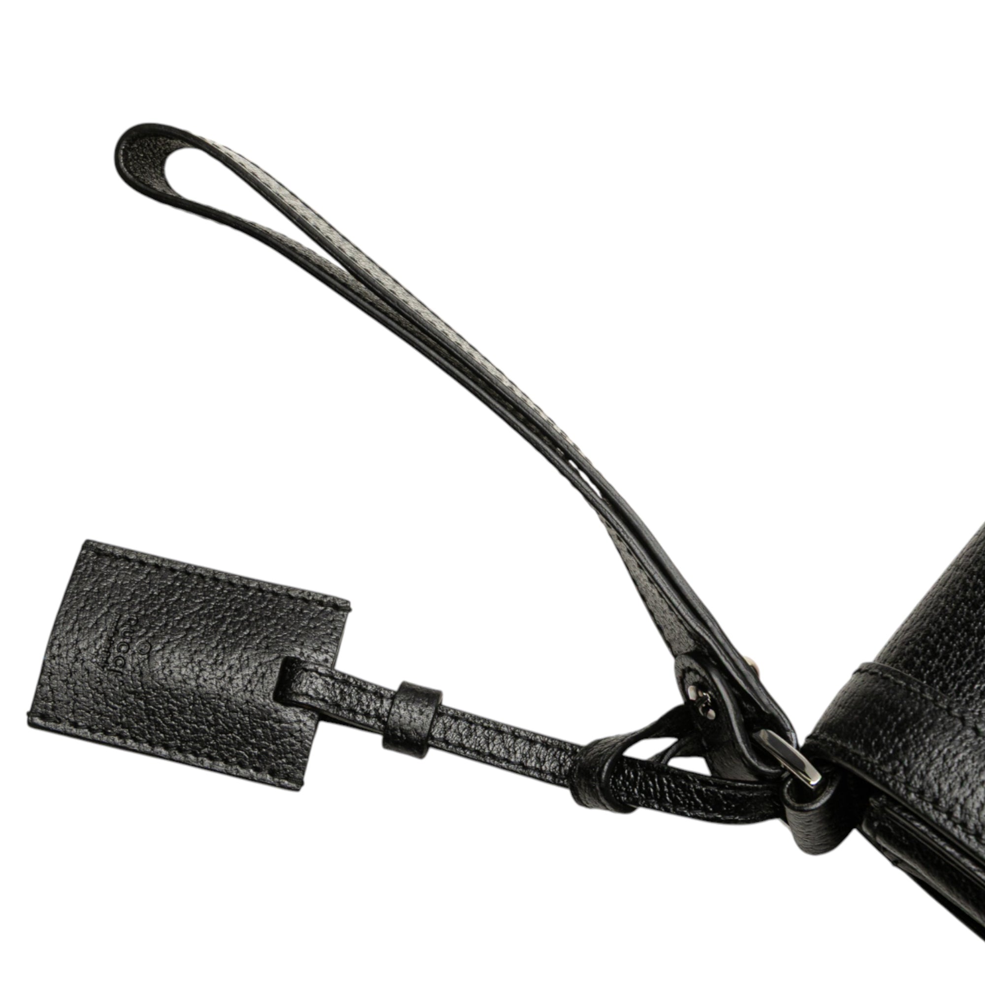 This clutch features a leather body, a flat leather wrist strap, a front flap with push lock closure, and an interior zip pocket. Retail Price: 850.00