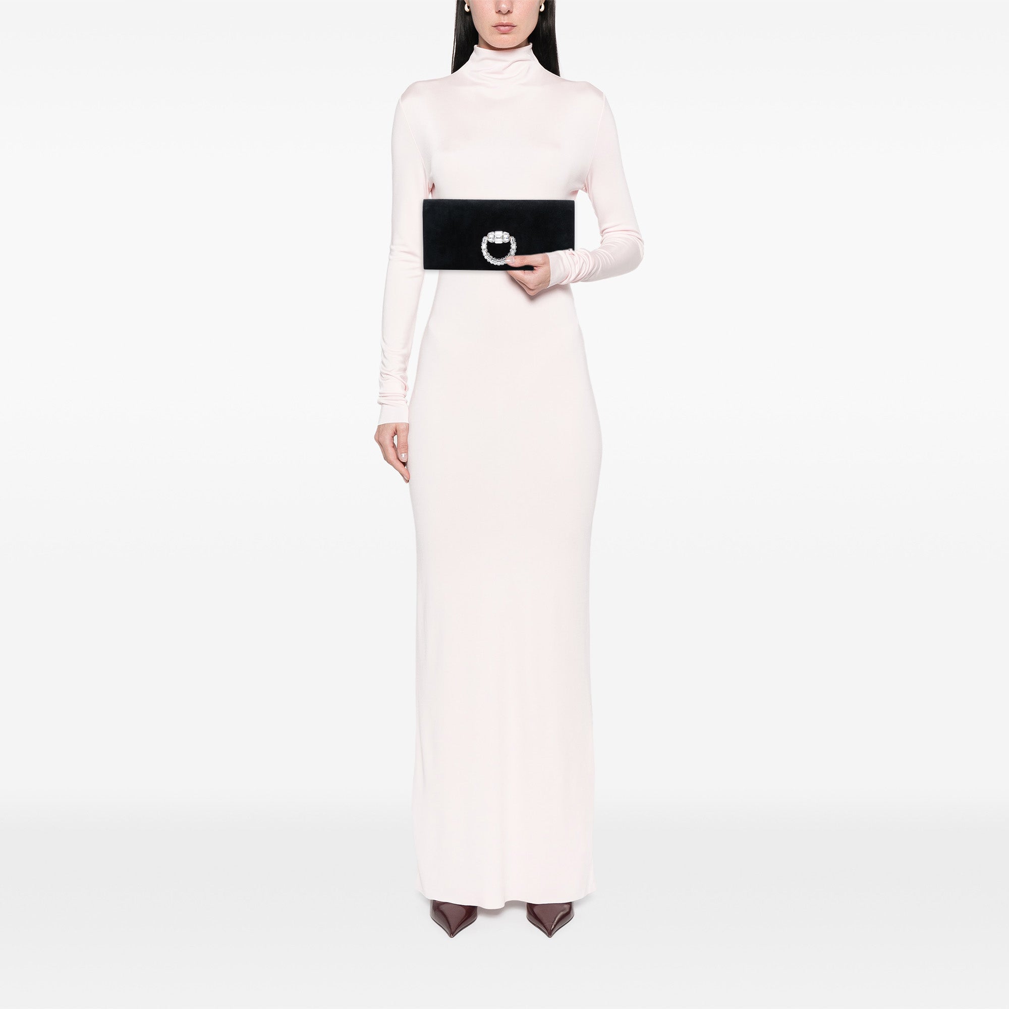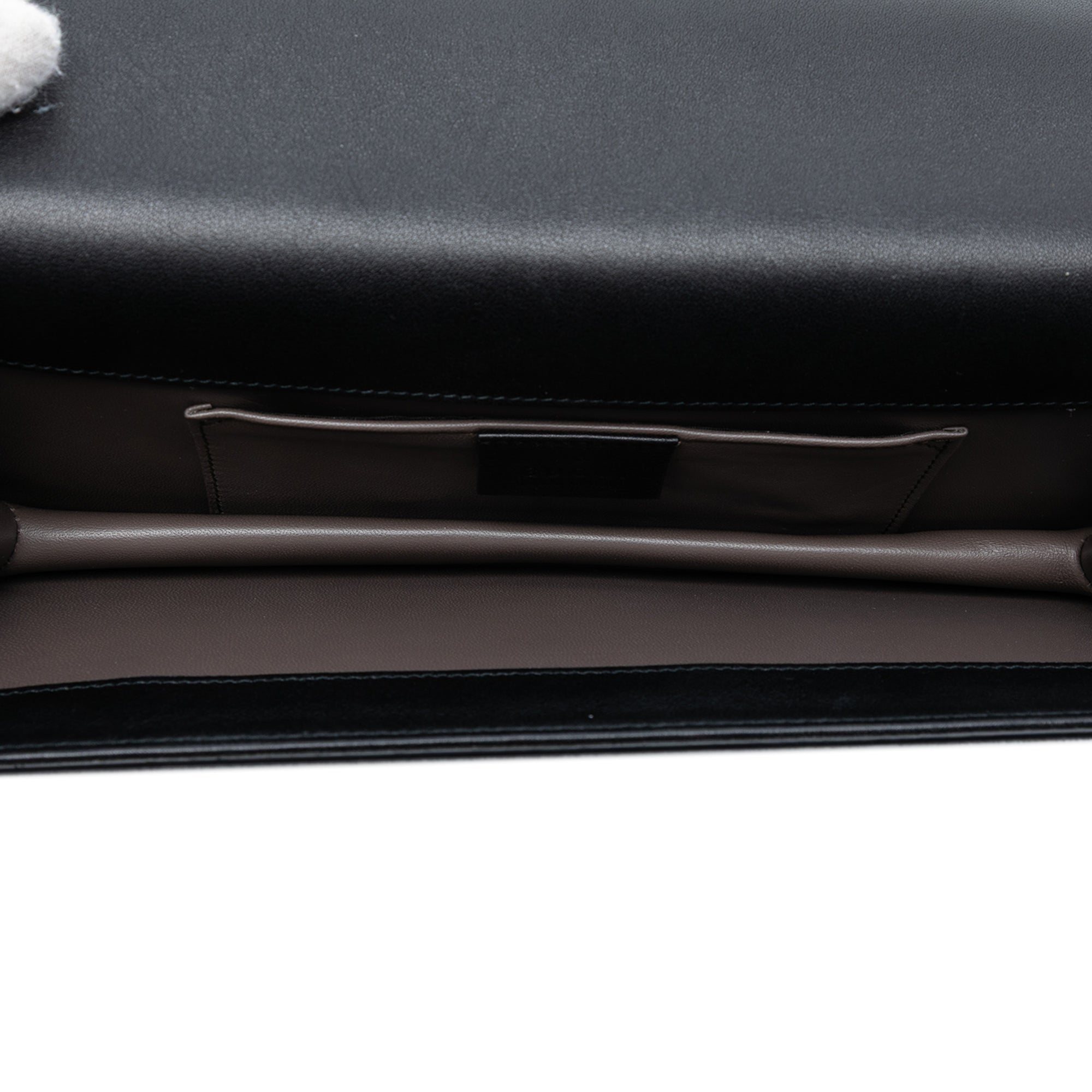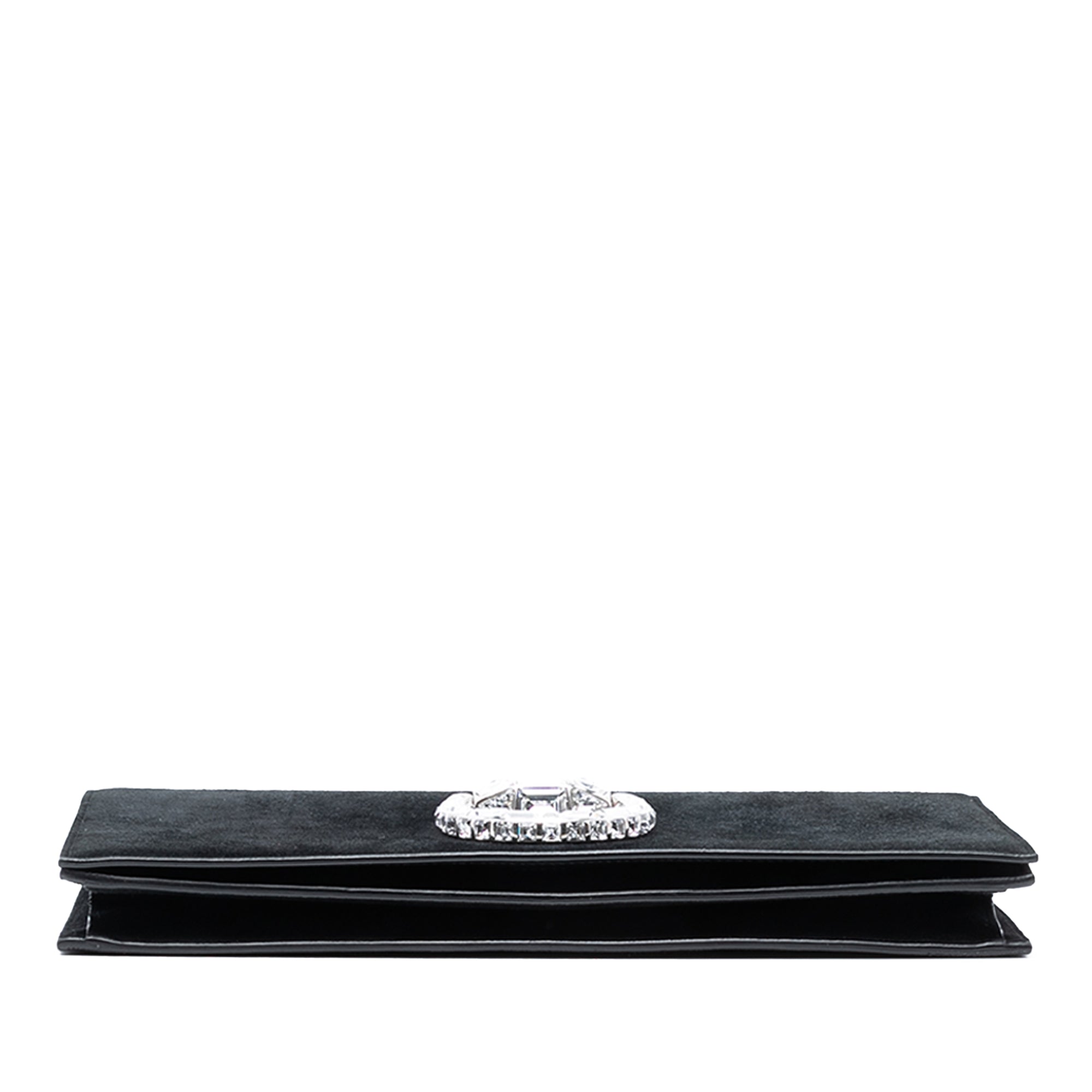 This clutch bag features a suede leather body, a front flap with magnetic snap closure, and an interior slip pocket. Retail Price: 678.00