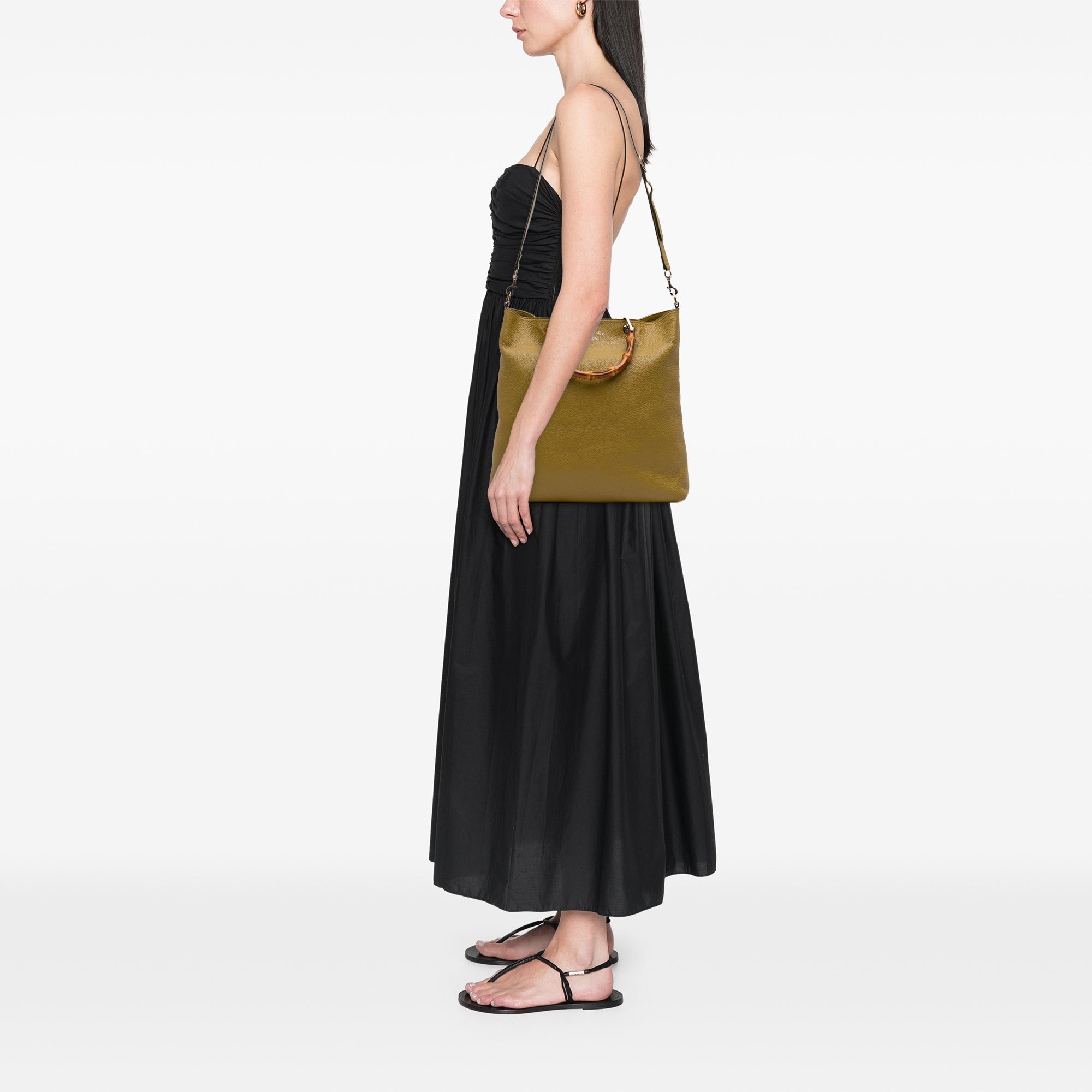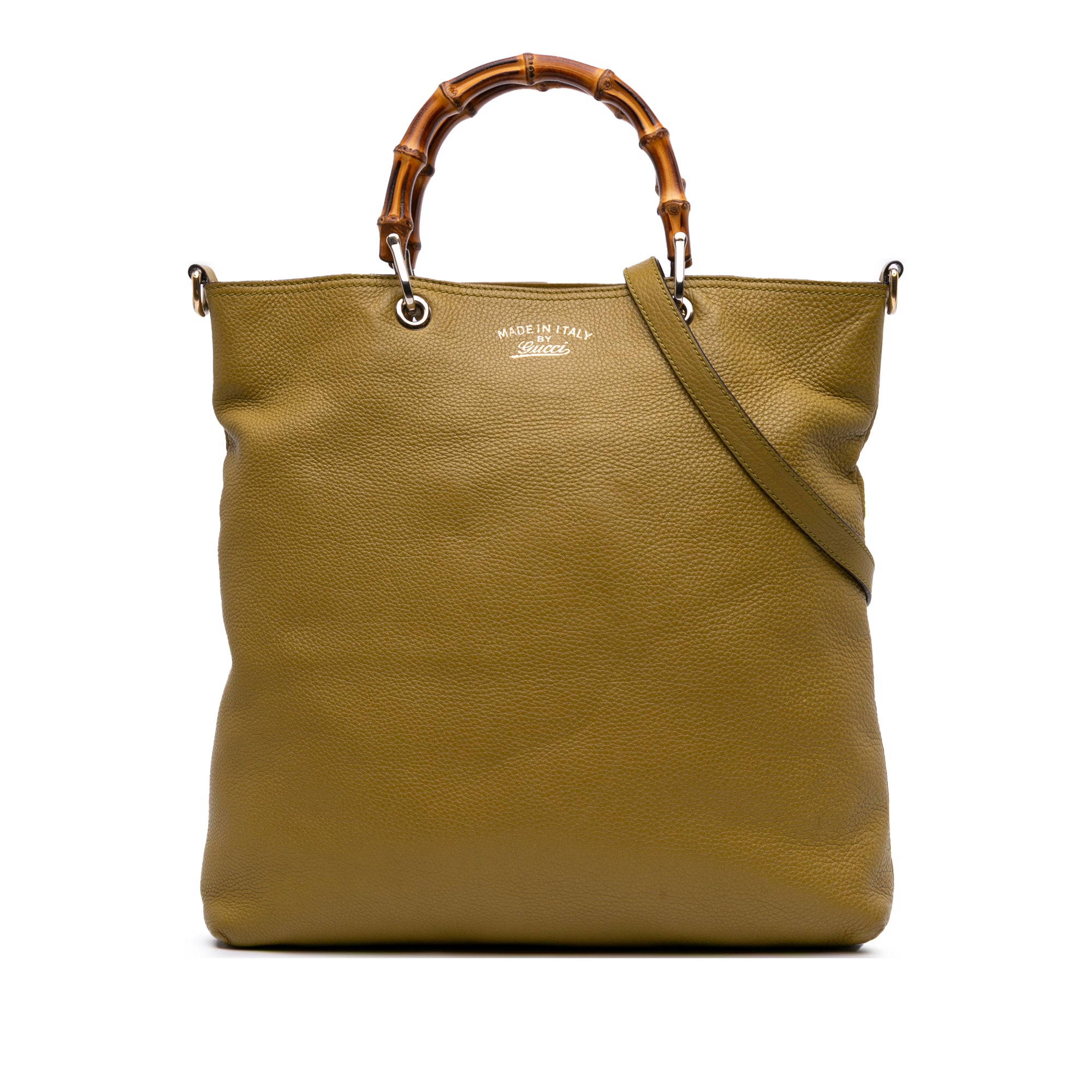 This satchel features a leather body, bamboo handles, an adjustable detachable flat leather strap, an open top with a magnetic closure, and interior zip and slip pockets. Retail Price: 1560.00