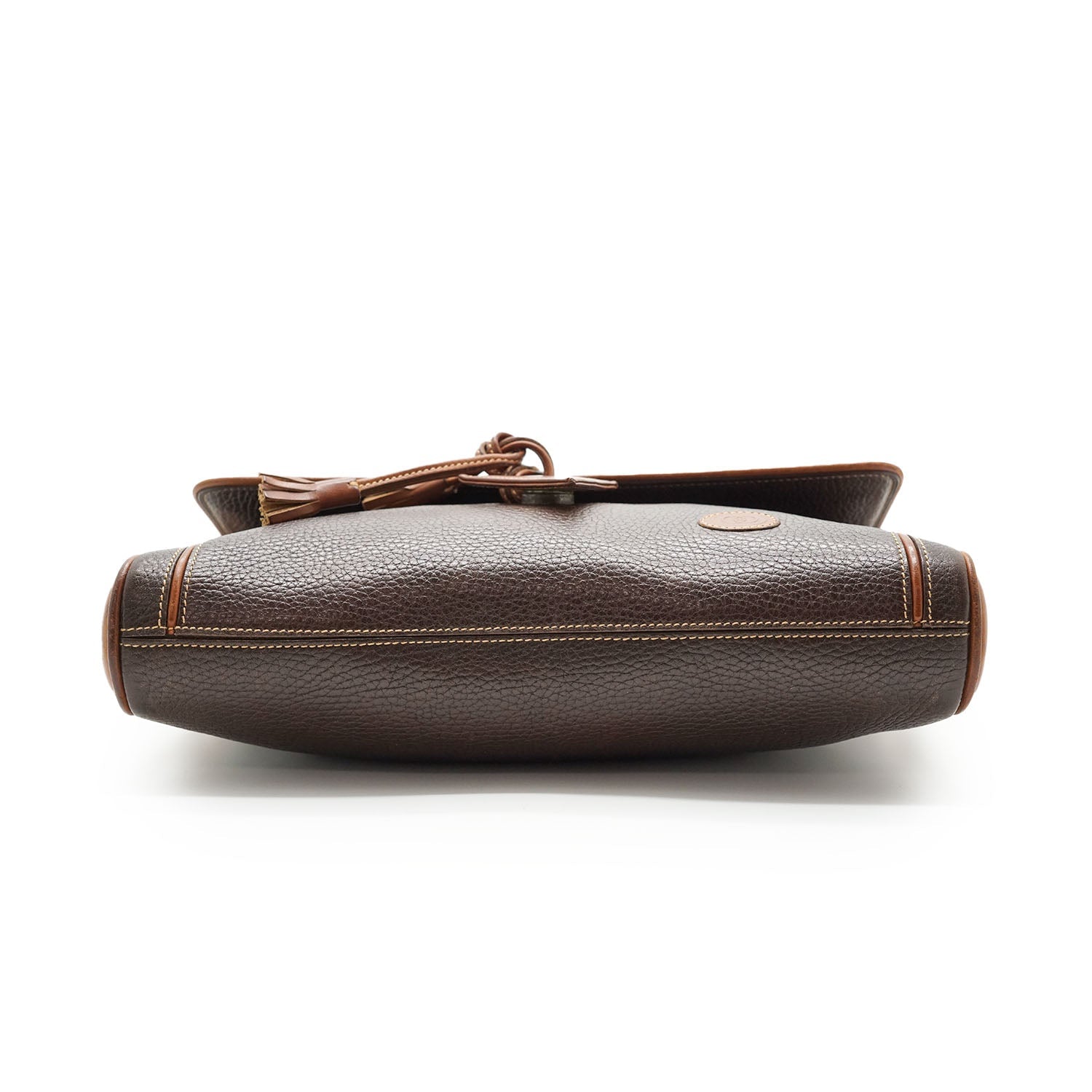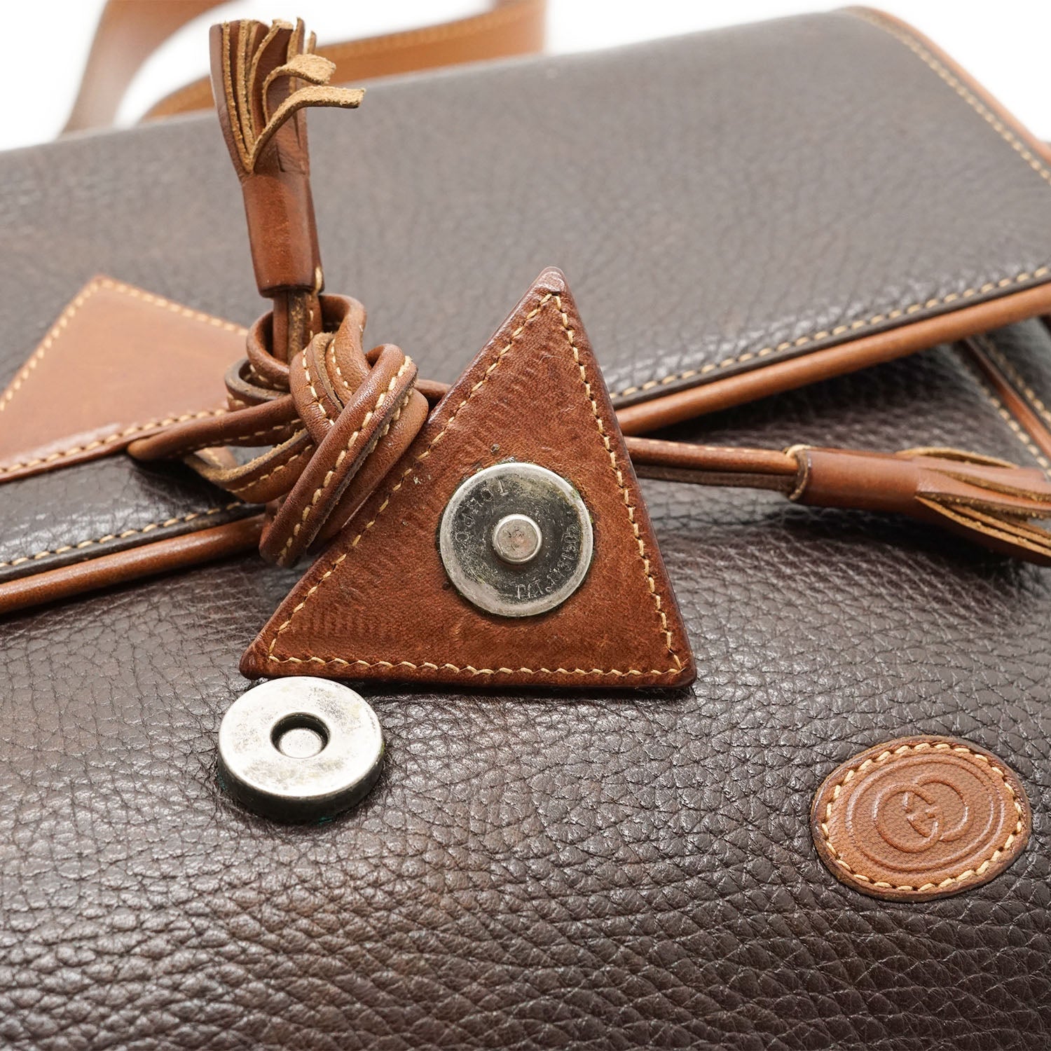 Vintage Triangle Detail Shoulder Bag Brown LeatherDepth: 5cmHeight: 23cmWidth: 28cmShoulder Drop: 48.5cmOutside Rank: BInside Rank: BStain: Noticeable water stains throughout the insideDiscoloration: Hardware tarnish/some green rust on the leather strap caused by hardware, slight leather discoloration overallScratch: Some scratches overall (front flap, sides, inside), some rubbing along the leather pipingWorn: In generalOdor: Slight storage smellSKU: 7080012
