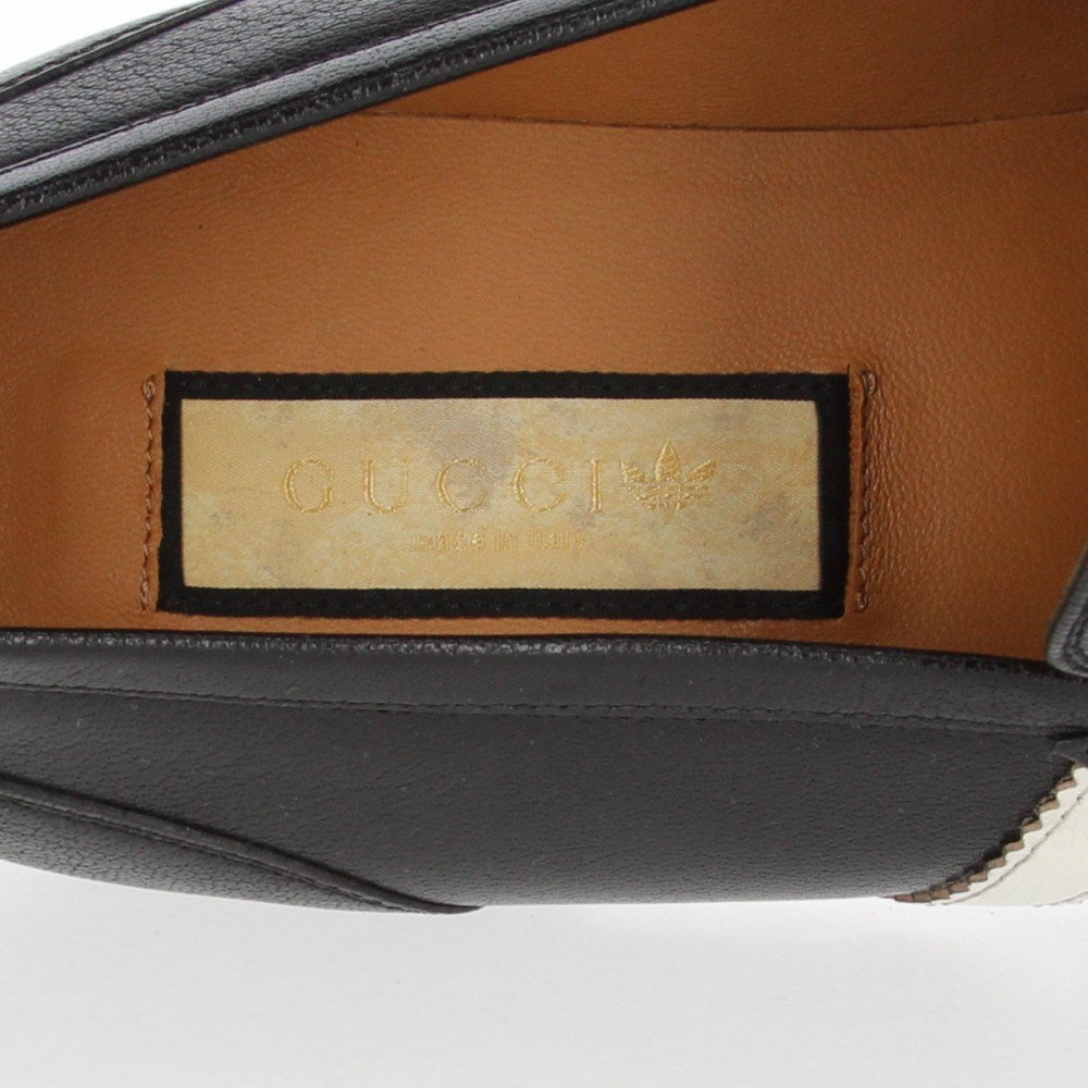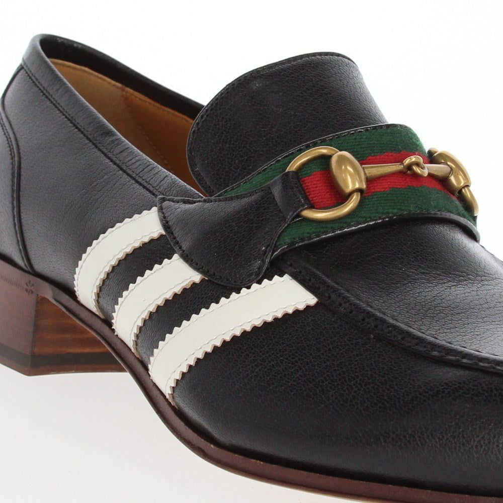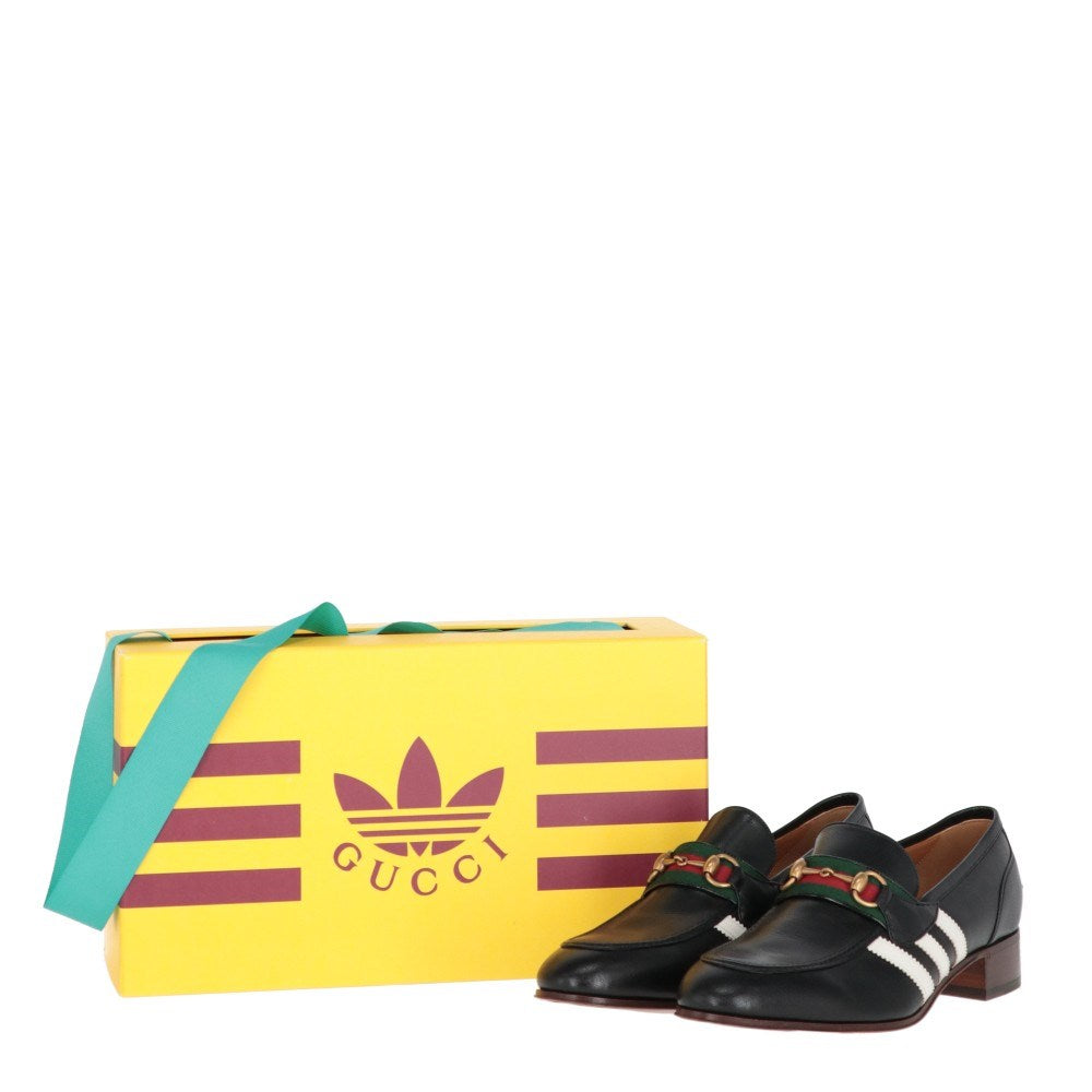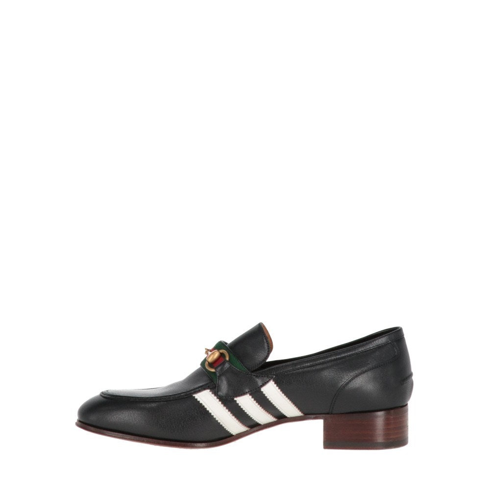 Gucci black leather loafers in collaboration with Adidas, 2020s. Gold-colored front clamp and white side bands. Heel with Adidas logo. These shoes belong to a deadstock, they have never been worn.