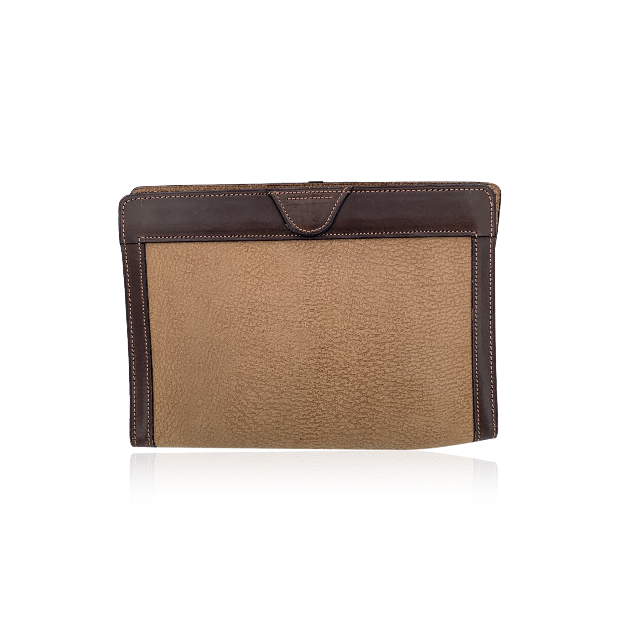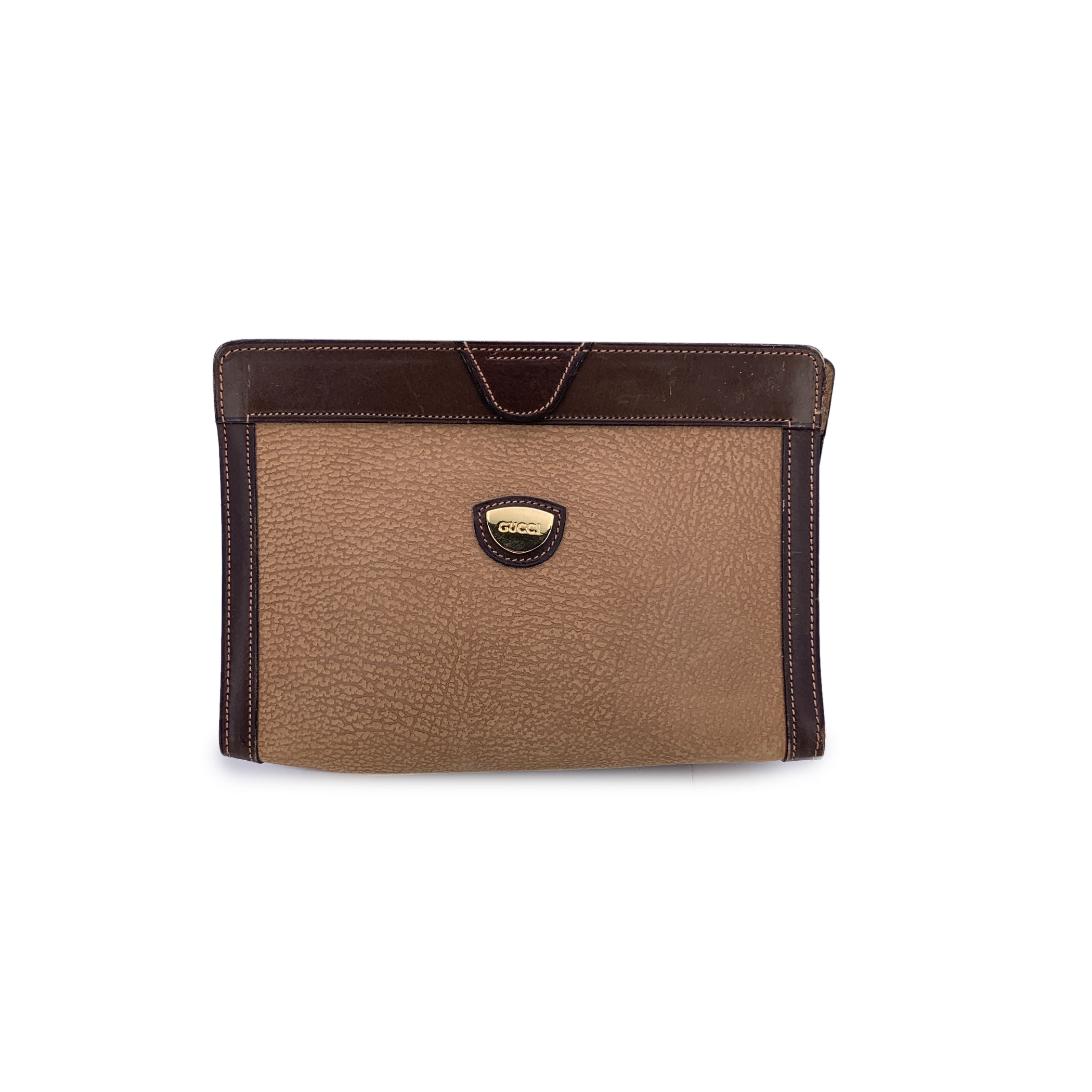 Step Into The World Of Vintage Luxury With This Stunning Gucci Cosmetic Bag Clutch, a Perfect Blend Of Elegance And Practicality. Crafted From Textured Beige Leather And Smooth Brown Leather Trim That Adds Sophistication And Durability. The Gold Metal Gucci Shield On The Front, Offers a Nod To Gucci's Heritage And Instantly Elevating The Design. The Upper Hook And Loop Closure Ensures Your Essentials Stay Secure, While The Waterproof Lining Inside Keeps Everything Protected And Easy To Clean. Inside, You'll Find The 'Gucci Italy' Tag, a Mark Of Authenticity And Italian Craftsmanship. This Vintage Gucci Cosmetic Bag Clutch Isn't Just Functional-it's a Statement Piece That Brings a Touch Of Timeless Luxury To Any Collection. Perfect For Organizing Your Beauty Essentials Or Carrying As a Sleek Clutch, This Versatile Bag Is An Essential For Those Who Appreciate The Elegance Of Classic Gucci Design.