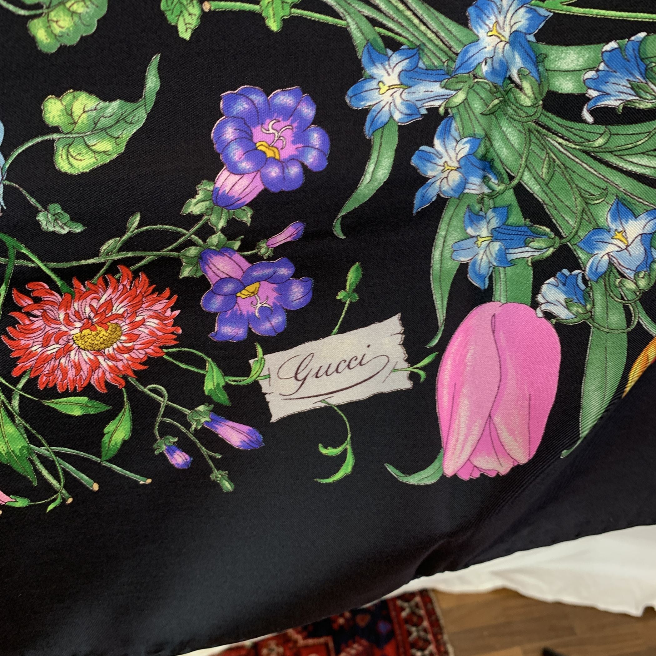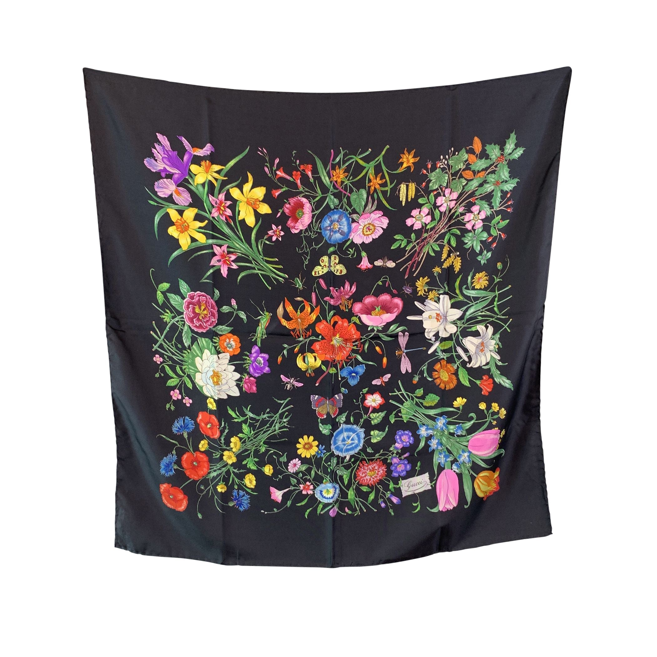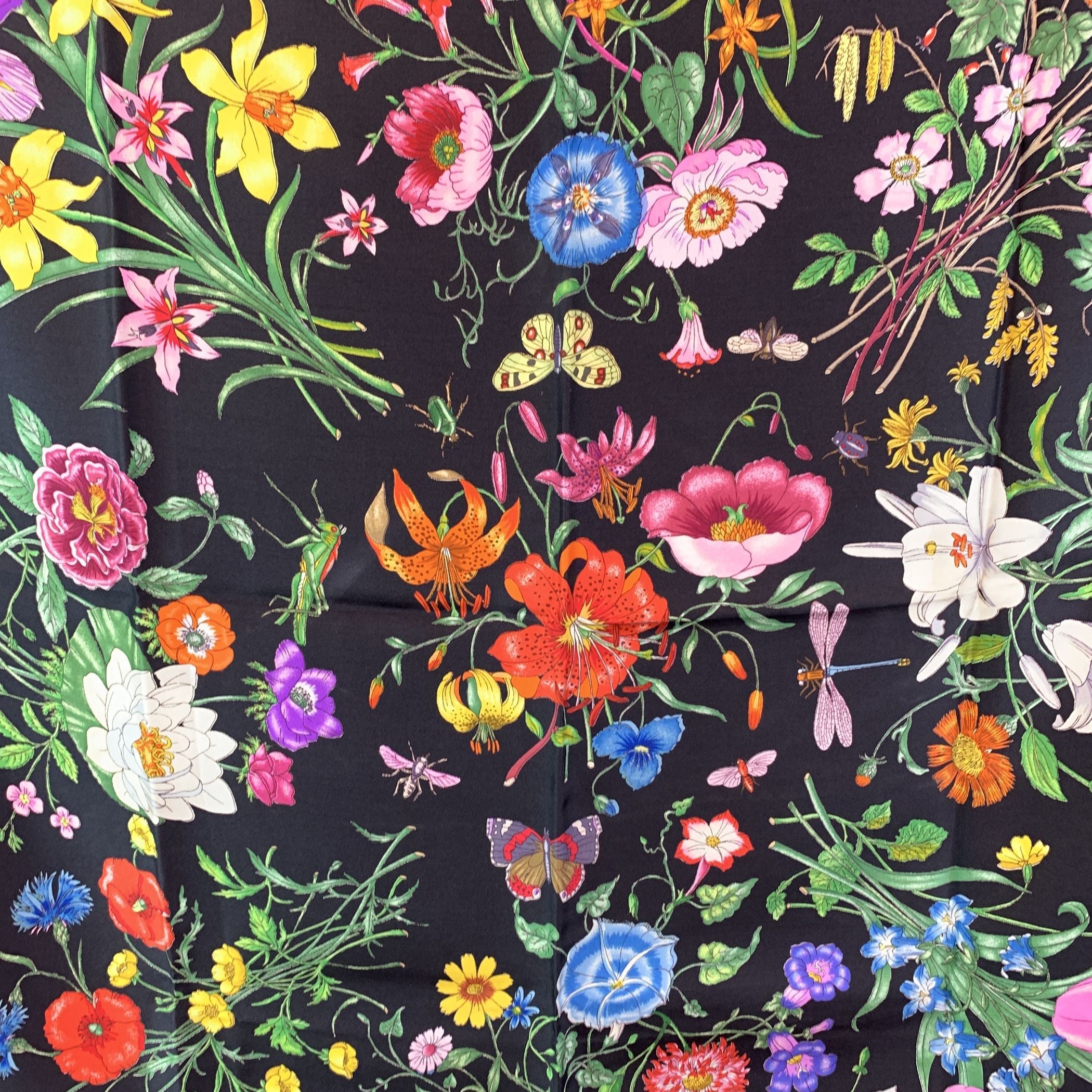 - Title: 'Flora' - Multicolor Floral Design On Black Background - 100% Silk - Printed Gucci Signature The Flora Design Born In 1966 By The Artist Vittorio Accornero. He Was The Textile Designer For Gucci Between The 1960s And 1981. The Flora Design Is a Magical And Delicate Composition Of Flowers, Berries And Insects Depicted With The Precision Of a Naturalist, In 37 Vibrant Colors On a White Background. The 9 Bouquets Represented Contain: Lilies, Ivy, Poppies, Cornflowers, Daffodils, Buttercups, Anemones, Tulips, Irises And Among These, Butterflies, Dragonflies, Wasps, Grasshoppers And Beetles.