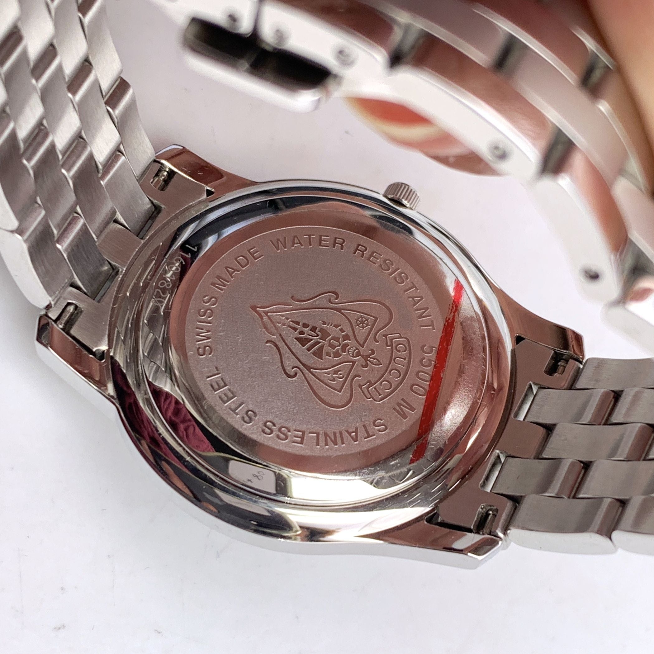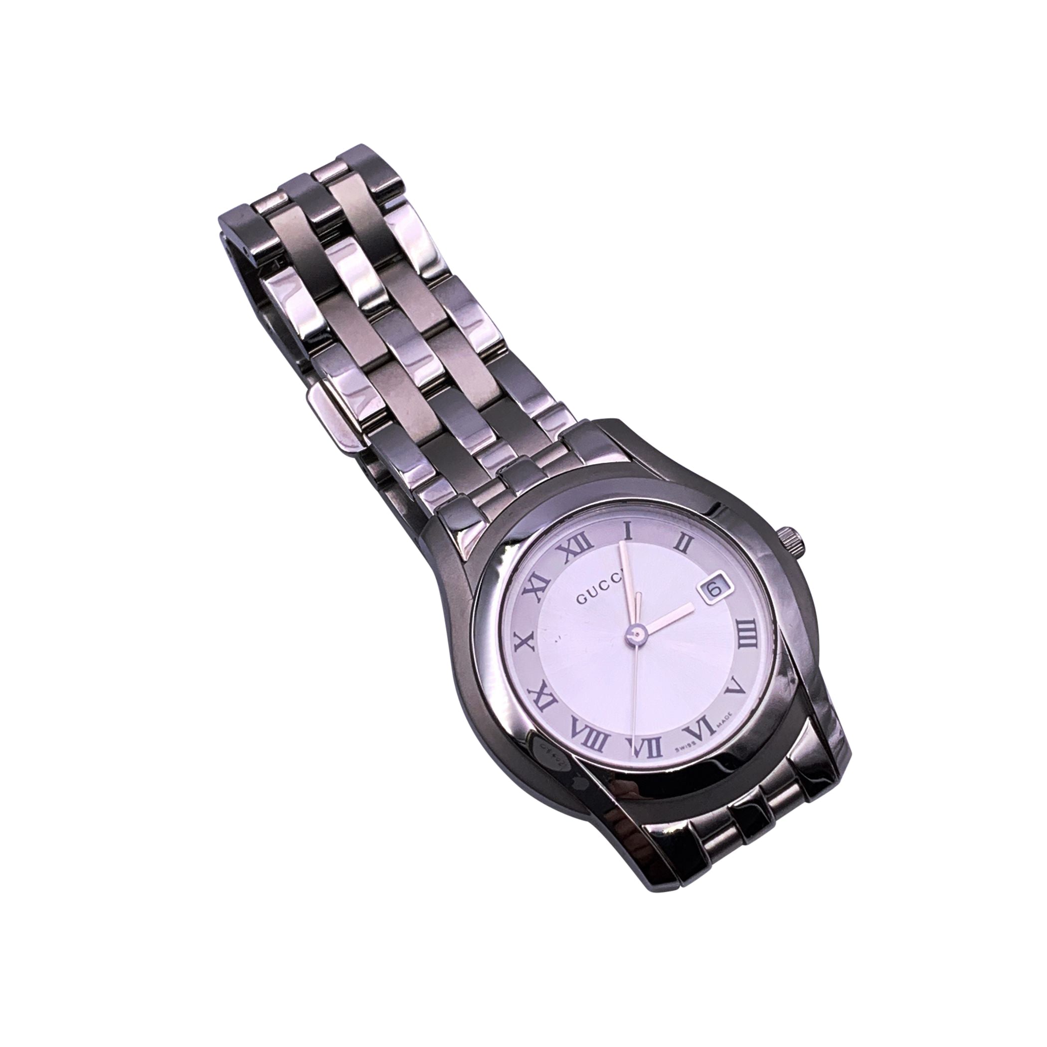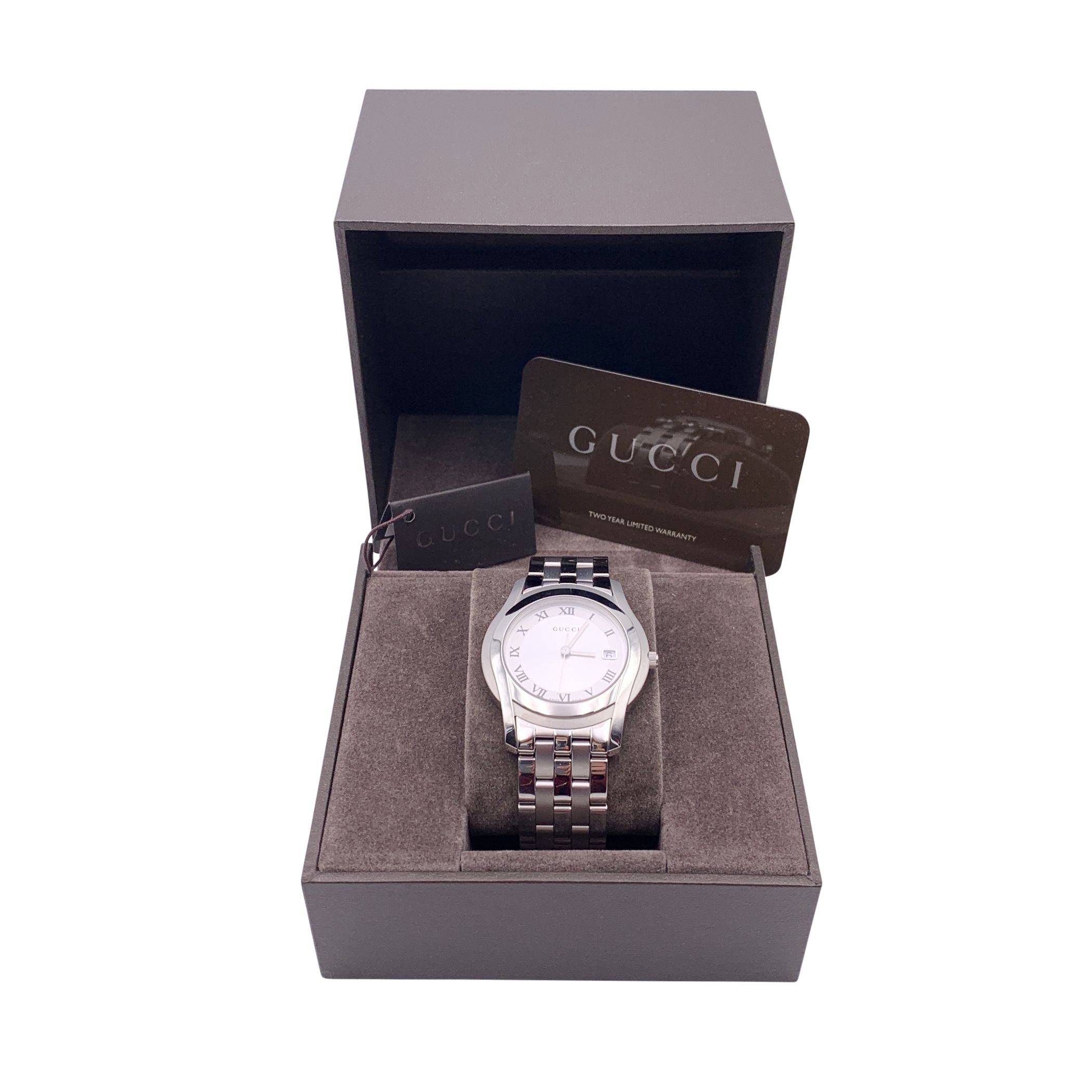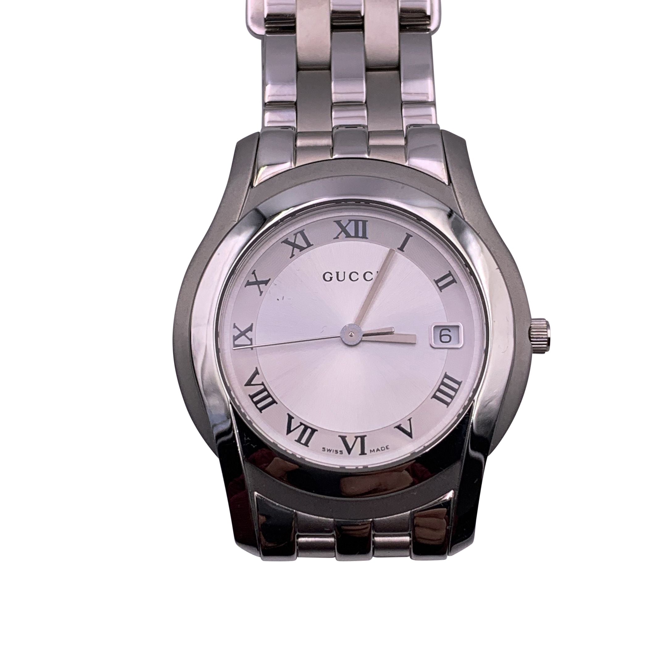 Gucci 5500m Silver-tone Stainless Steel Quartz Watch - White Dial, Roman Numerals Elevate Your Timepiece Collection With This Classic Gucci 5500m Wristwatch, Blending Timeless Design With Swiss Precision. Crafted In Silver-tone Stainless Steel, This Elegant Watch Features a White Dial With Roman Numeral Hour Markers And a Date Window At 3 O'clock, All Protected By a Durable Sapphire Crystal. Powered By a Reliable Swiss-made Quartz Movement, The Watch Offers Dependable Accuracy And Style. The Gucci Name Is Proudly Displayed On The Dial, While The Gucci Crest Is Engraved On The Case Back, Reinforcing The Brand's Heritage And Attention To Detail. Additional Features Include: Water Resistance Up To 3 Atm Stainless Steel Bracelet With a Secure Deployant Clasp Fits Wrists Up To 6.5 Inches (16.5 Cm) A Refined Everyday Accessory Or a Perfect Gift, This Gucci 5500m Exudes Understated Luxury And Craftsmanship.