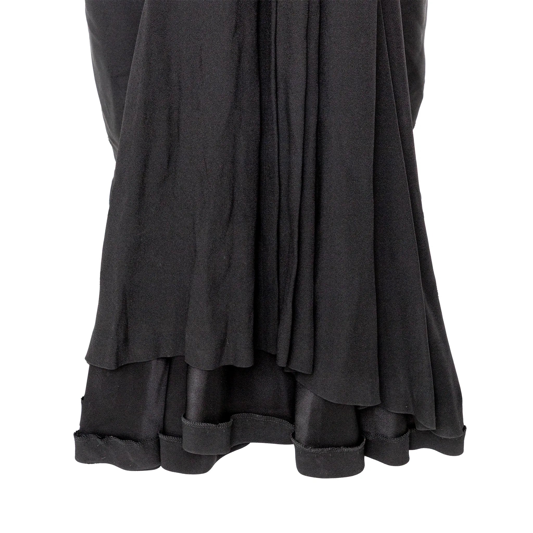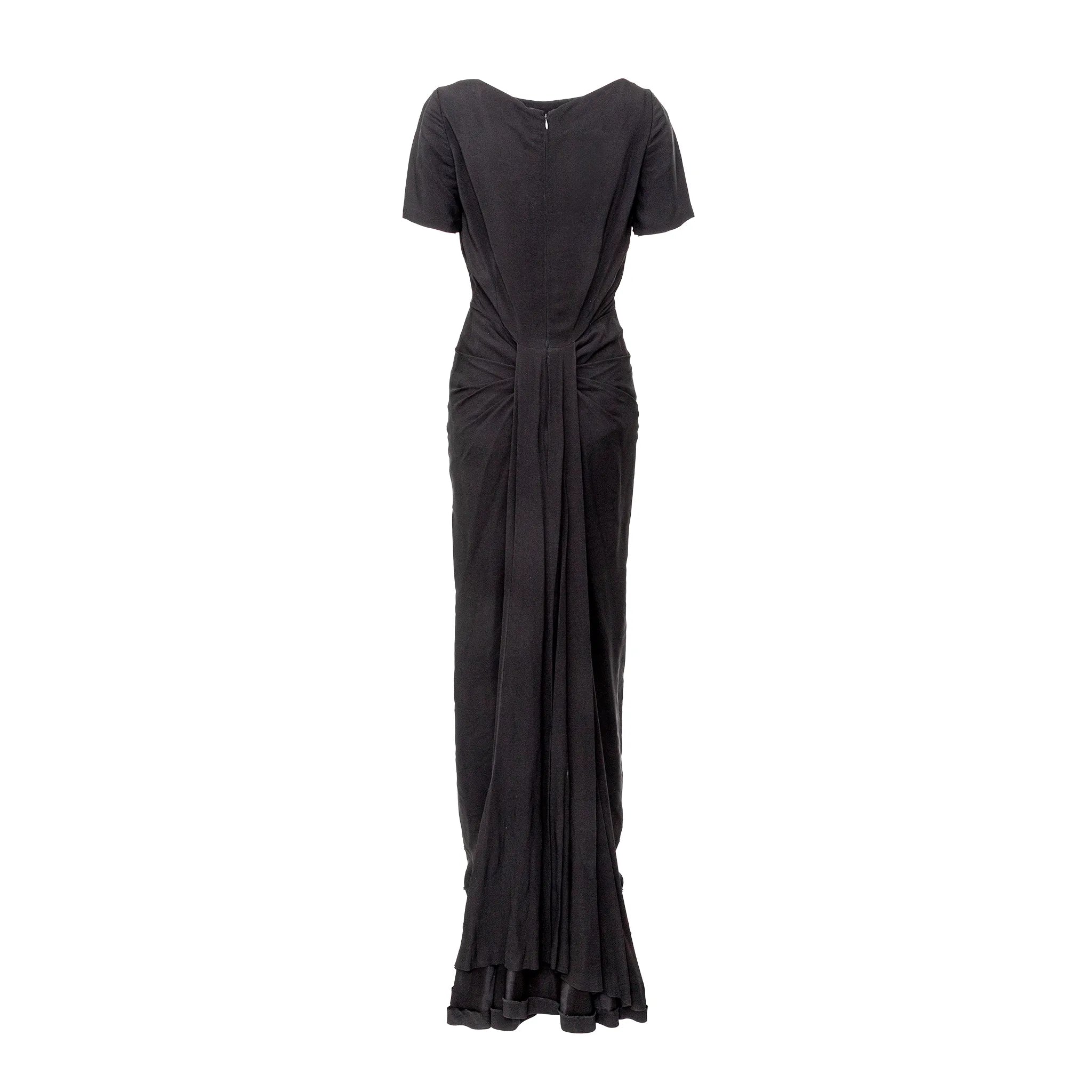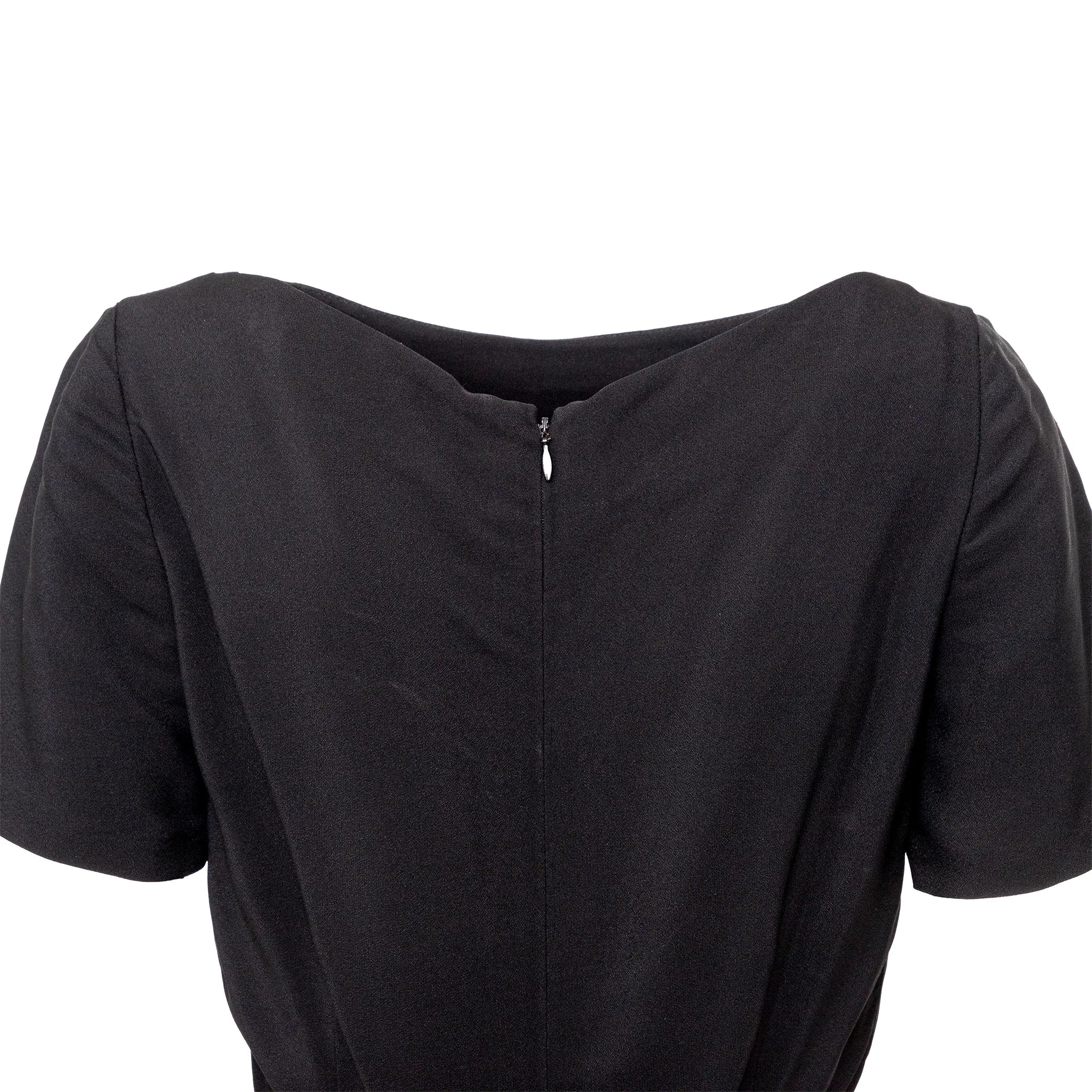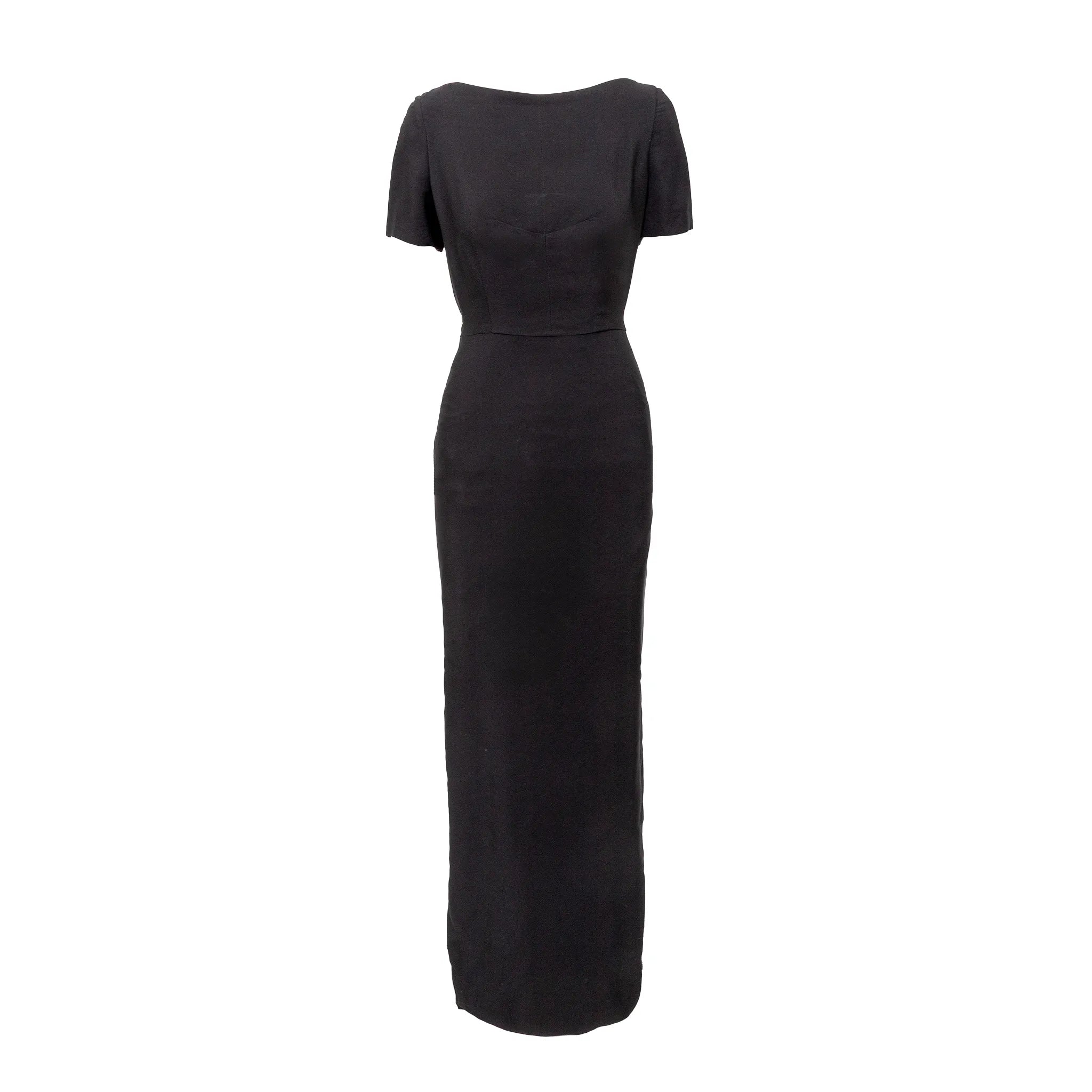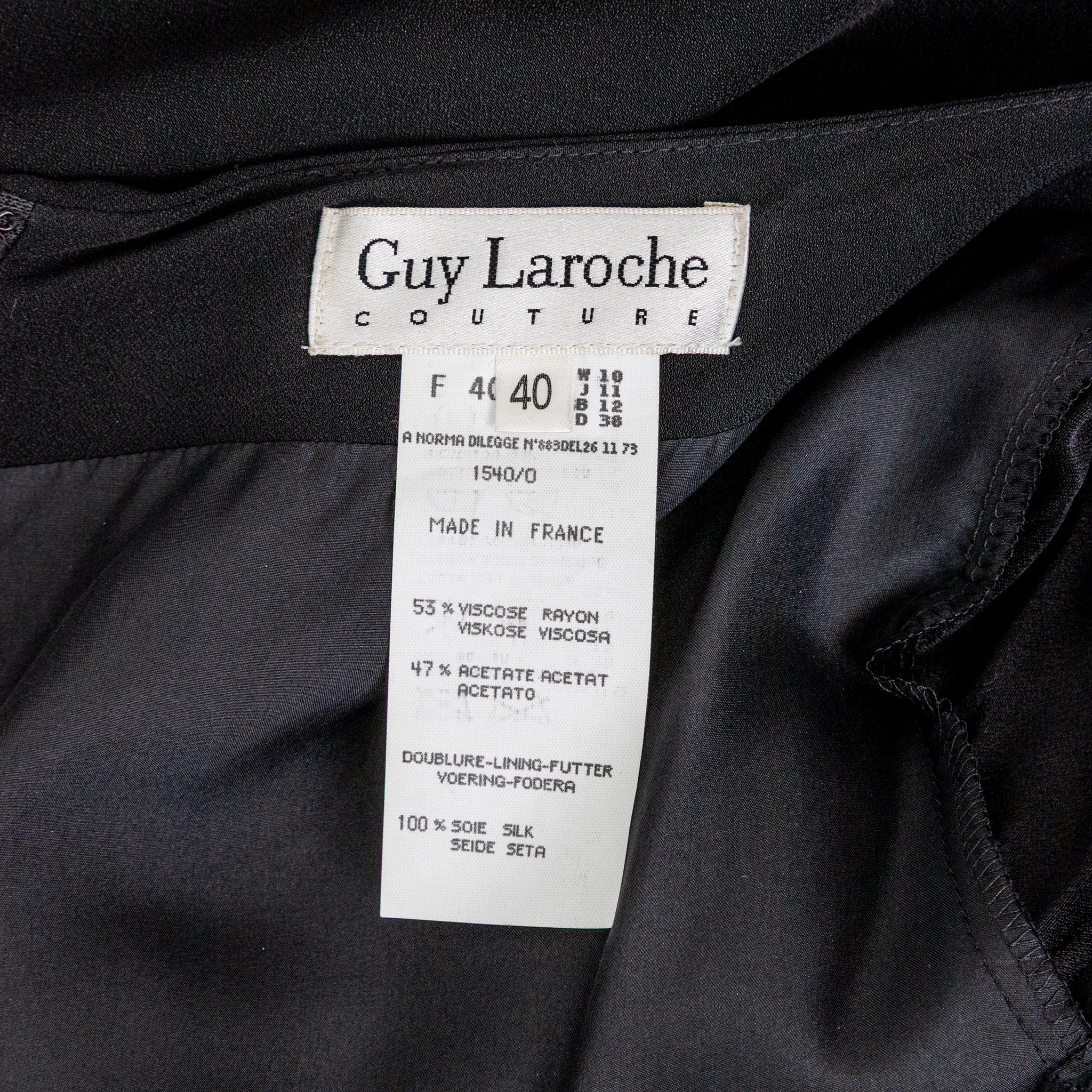 Elegant vintage couture dress by Guy Laroche featuring a timeless long black silhouette with a boatneck neckline, short sleeves, a pleated fitted bodice, and a striking pleated train cascading down the back—an iconic piece of haute couture sophistication.