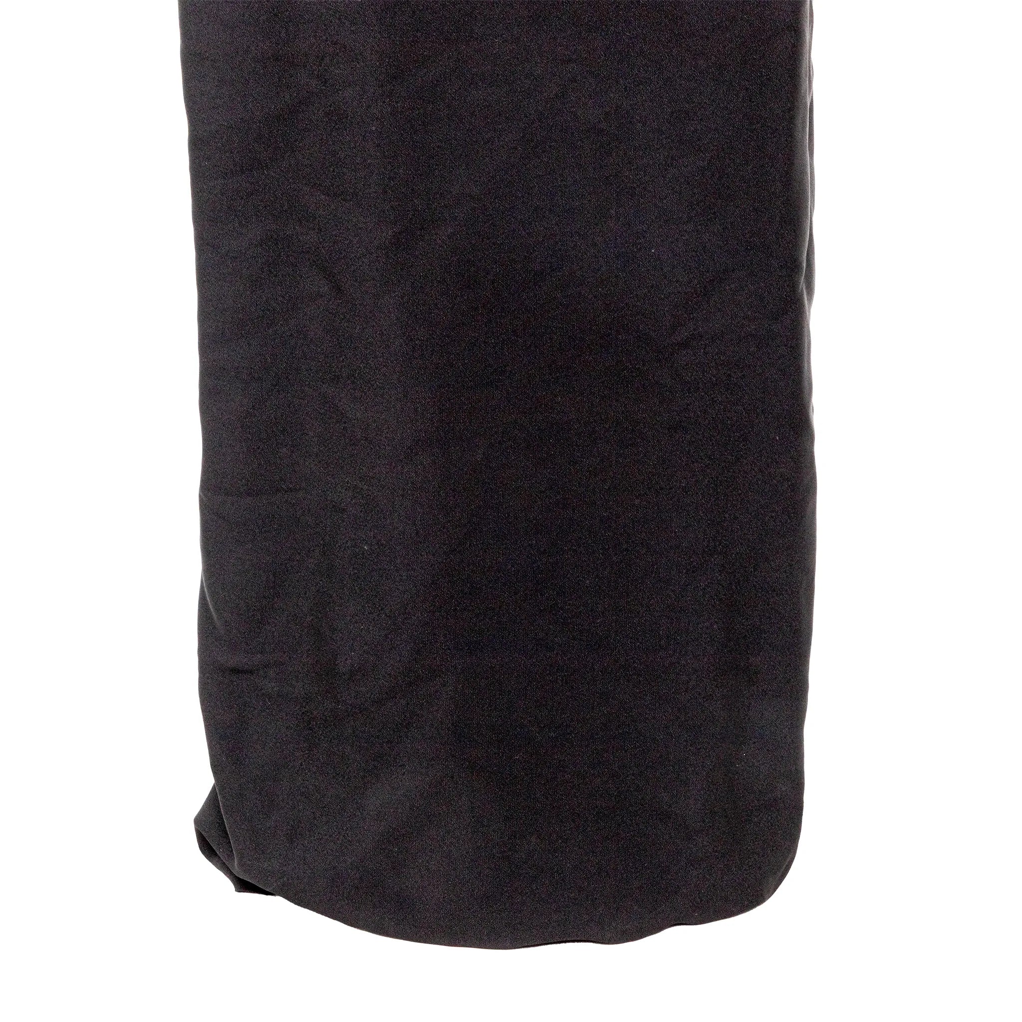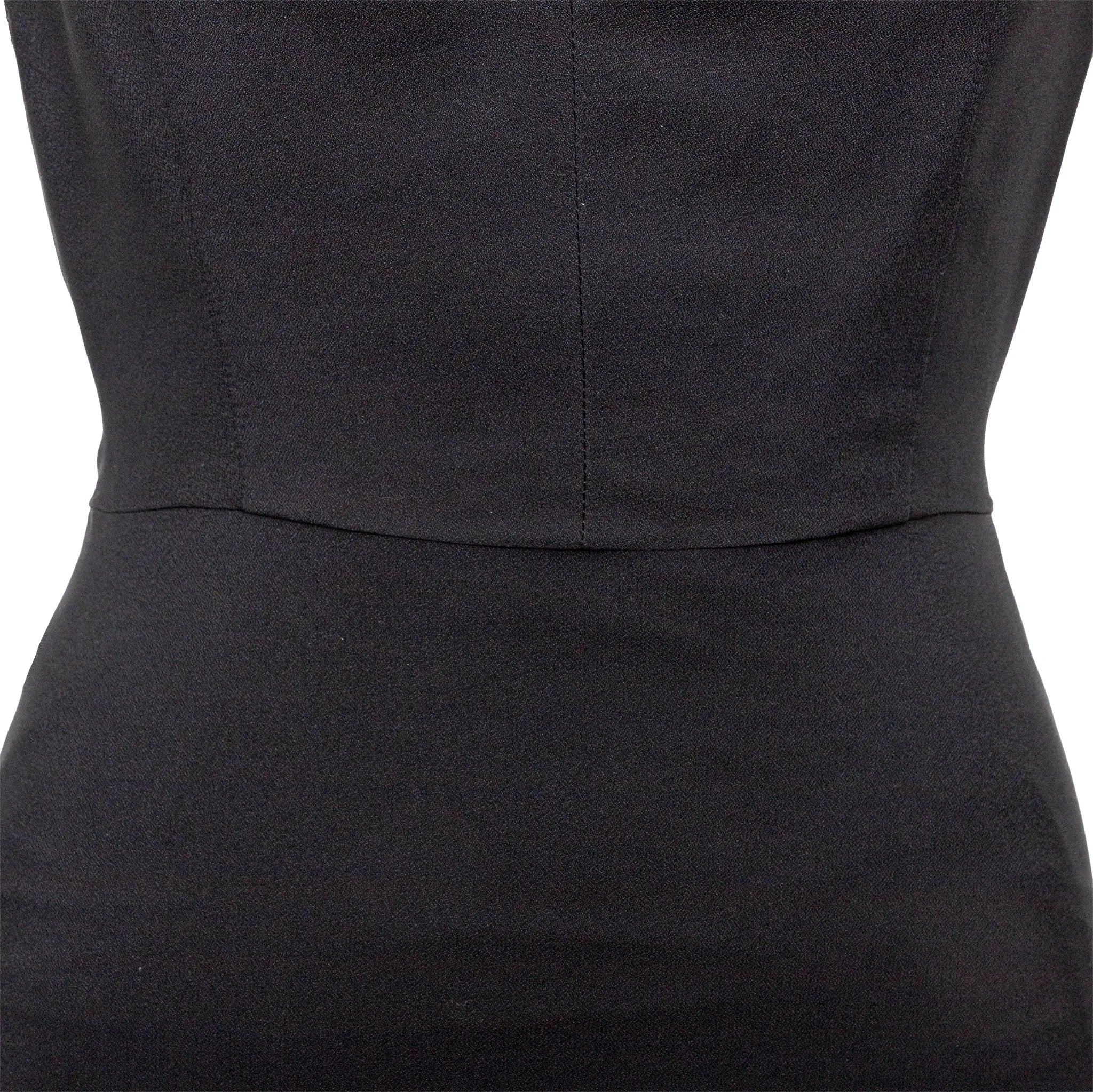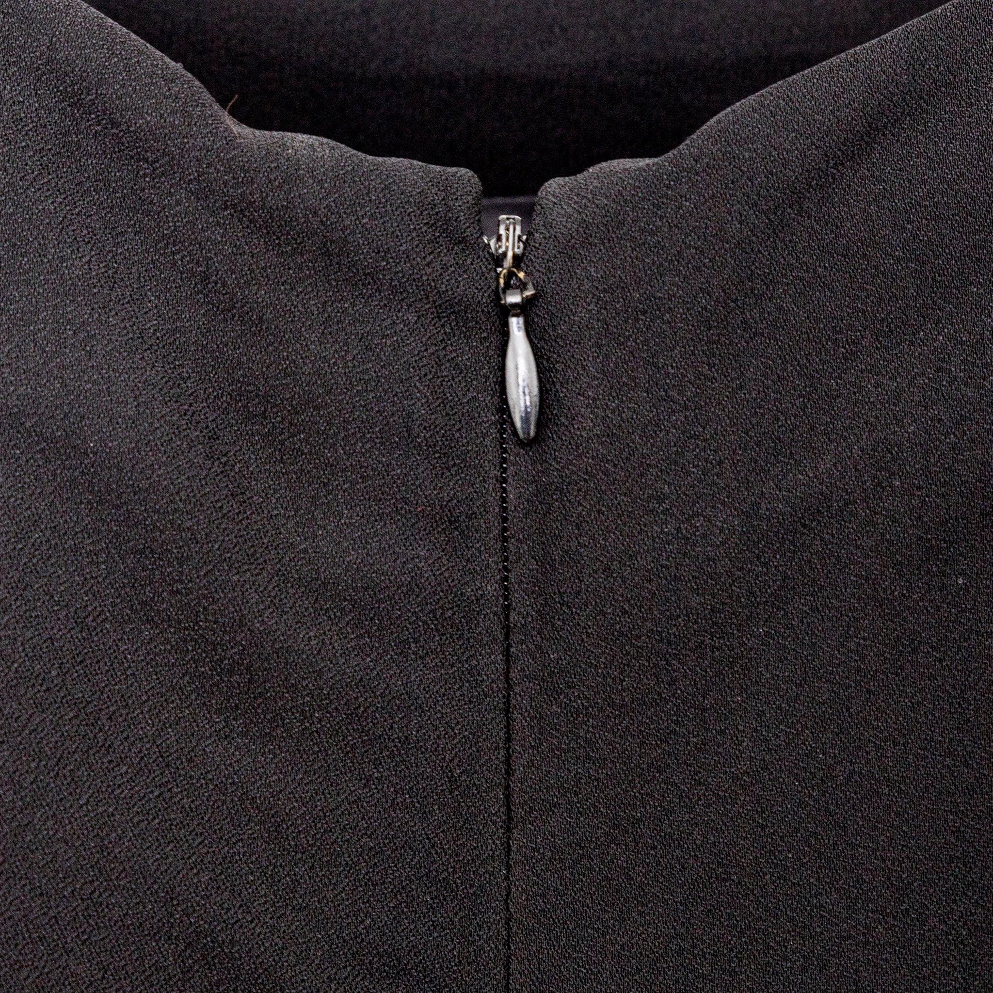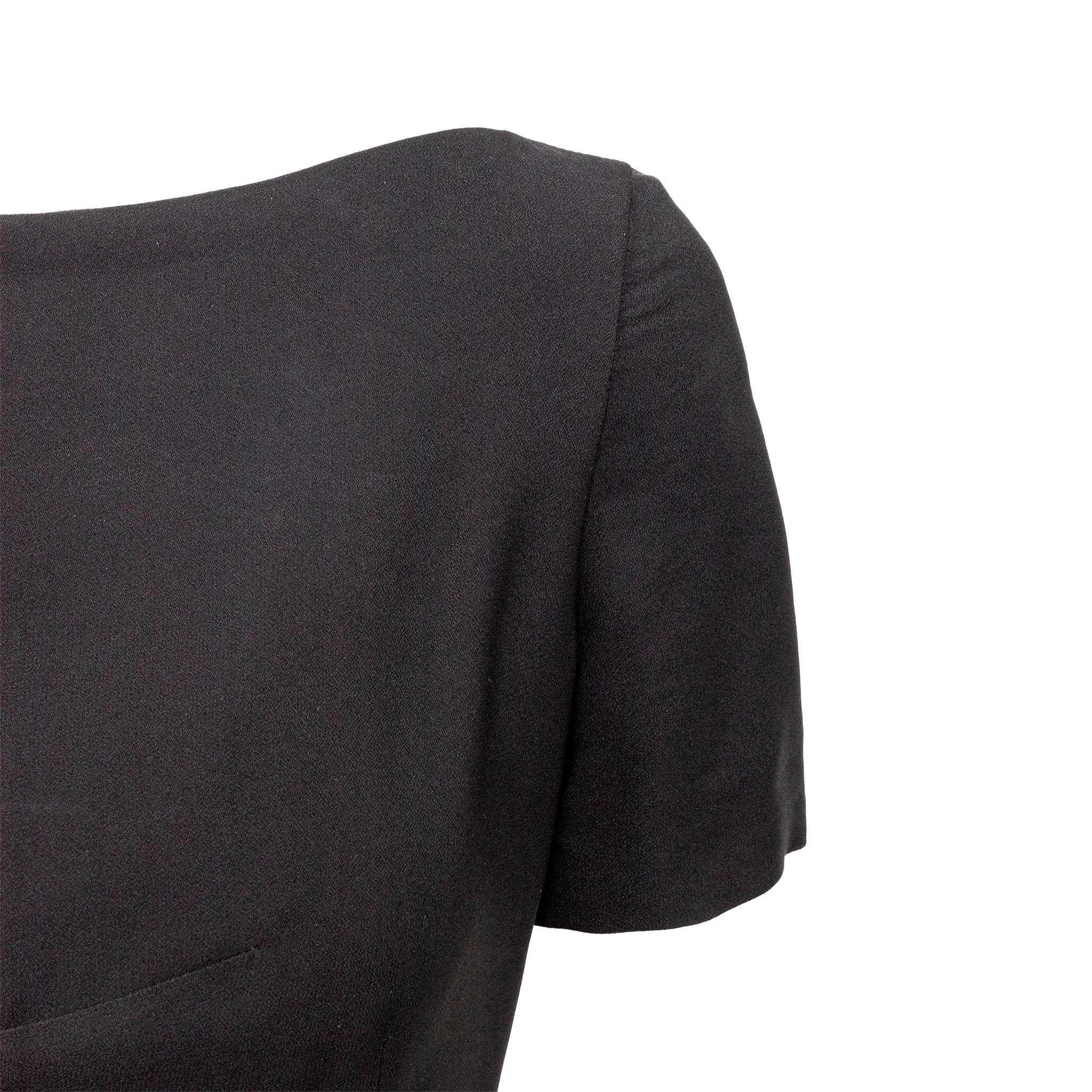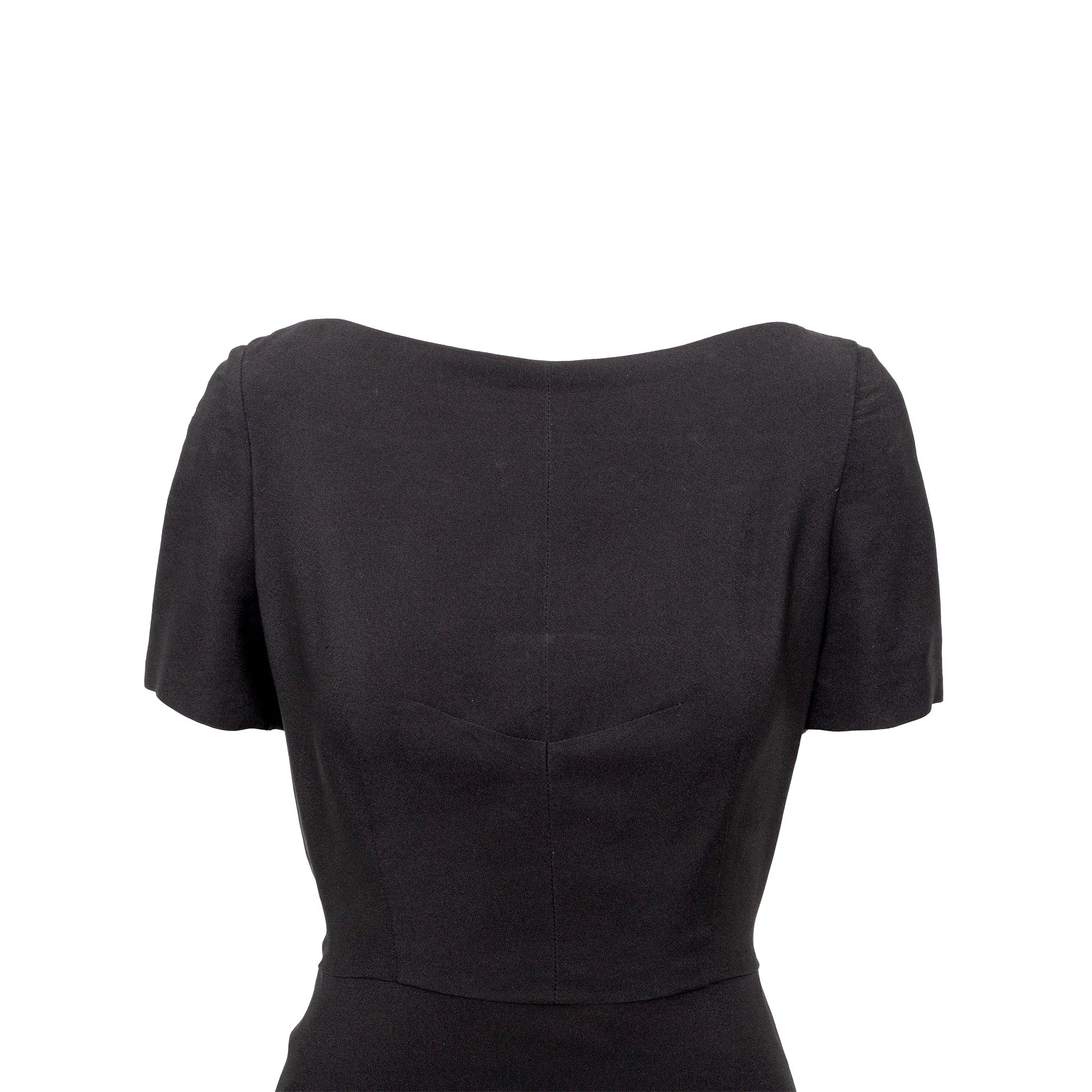 Elegant vintage couture dress by Guy Laroche featuring a timeless long black silhouette with a boatneck neckline, short sleeves, a pleated fitted bodice, and a striking pleated train cascading down the back—an iconic piece of haute couture sophistication.