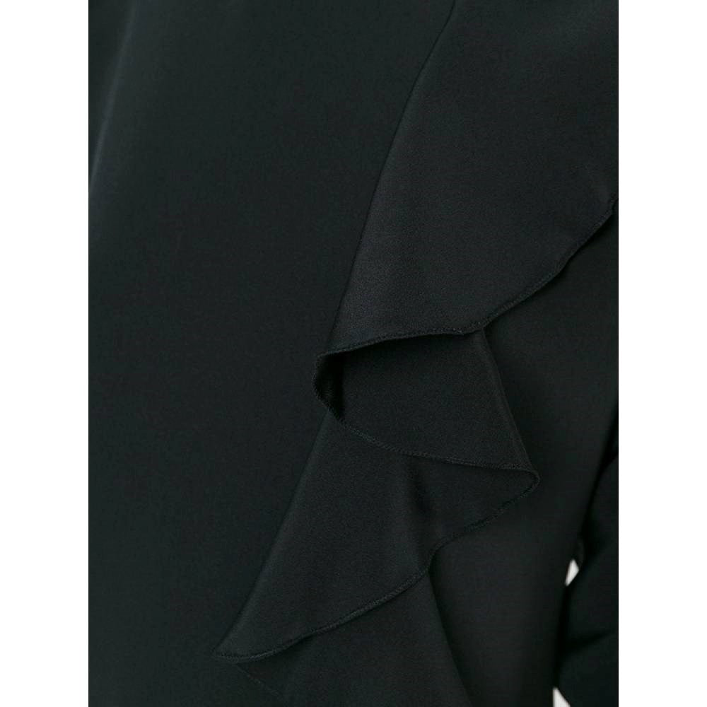 Guy Laroche black crepe silk 90s dress with long zipped sleeves, turtleneck and frontal side ruffles. Back zip and hooks fastening.