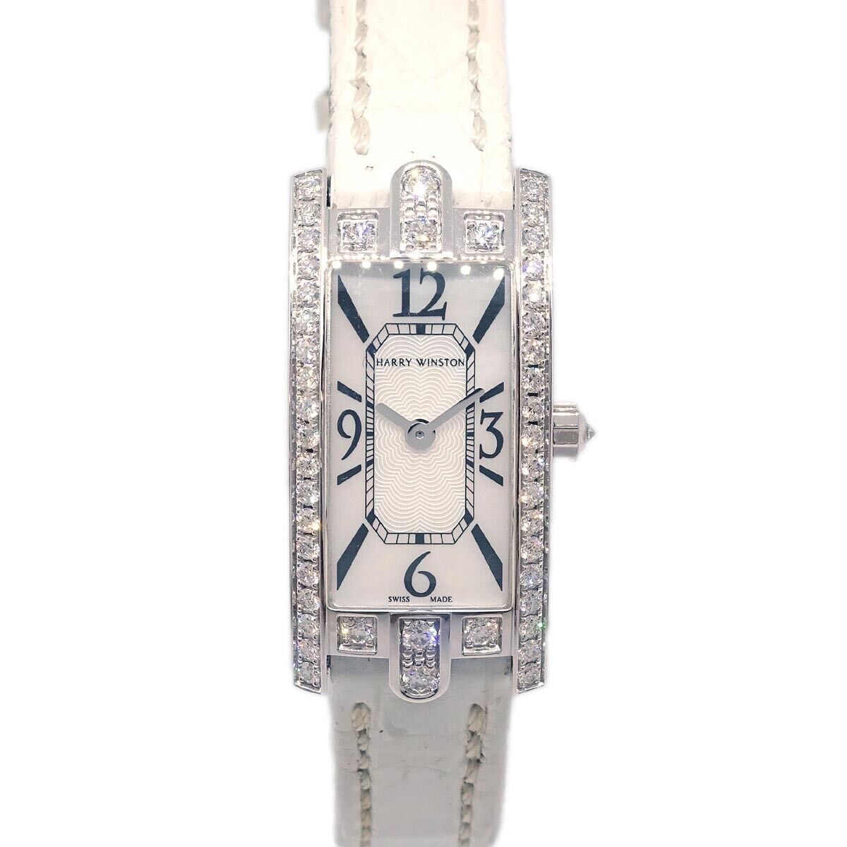 Brand : Harry winston Model : Avenue c quartz watch Style : White gold and alligator with diamond bezel and mother of pearl Serial number : 097285