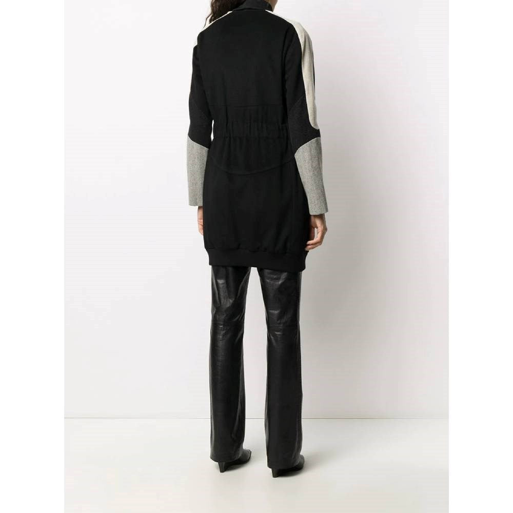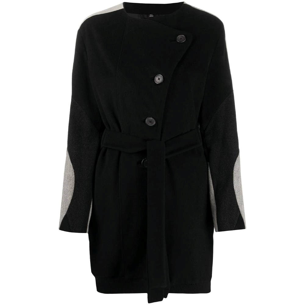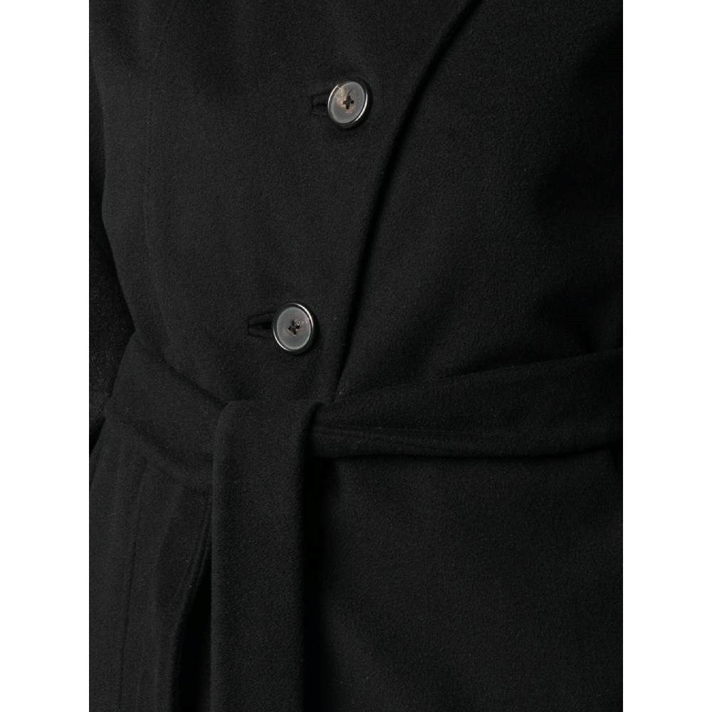 Helmut Lang black wool coat with beige and black twill details on the sleeves. Round collar. Frontal buttons closure. Two side welt pockets. Waist belted.