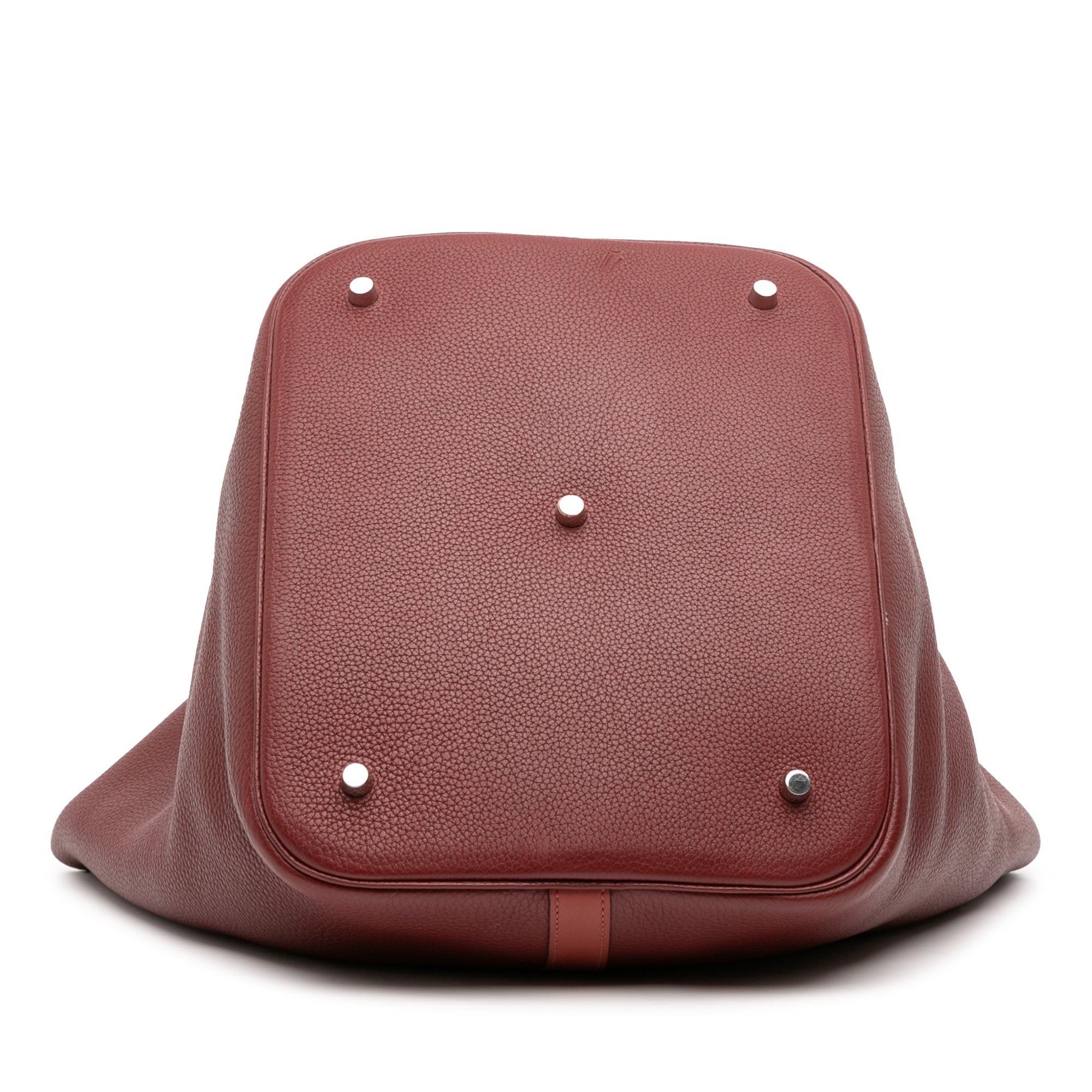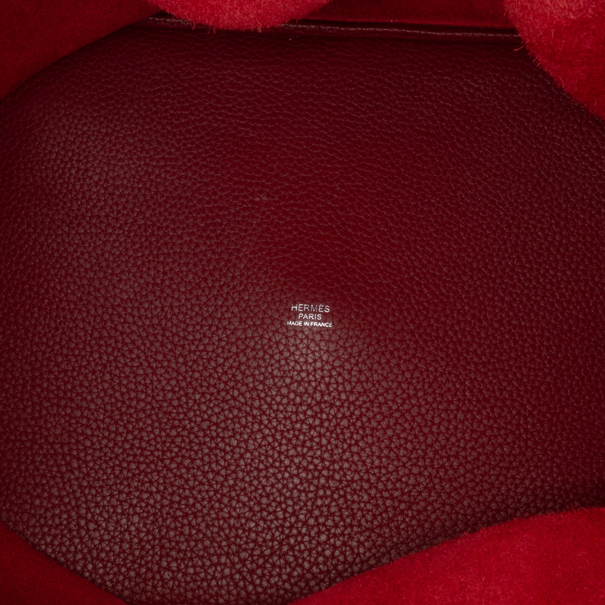 This Picotin 26 features a Clemence leather body in Rouge H and Brique colors, flat handles, and an open top. Retail Price: 4550.00