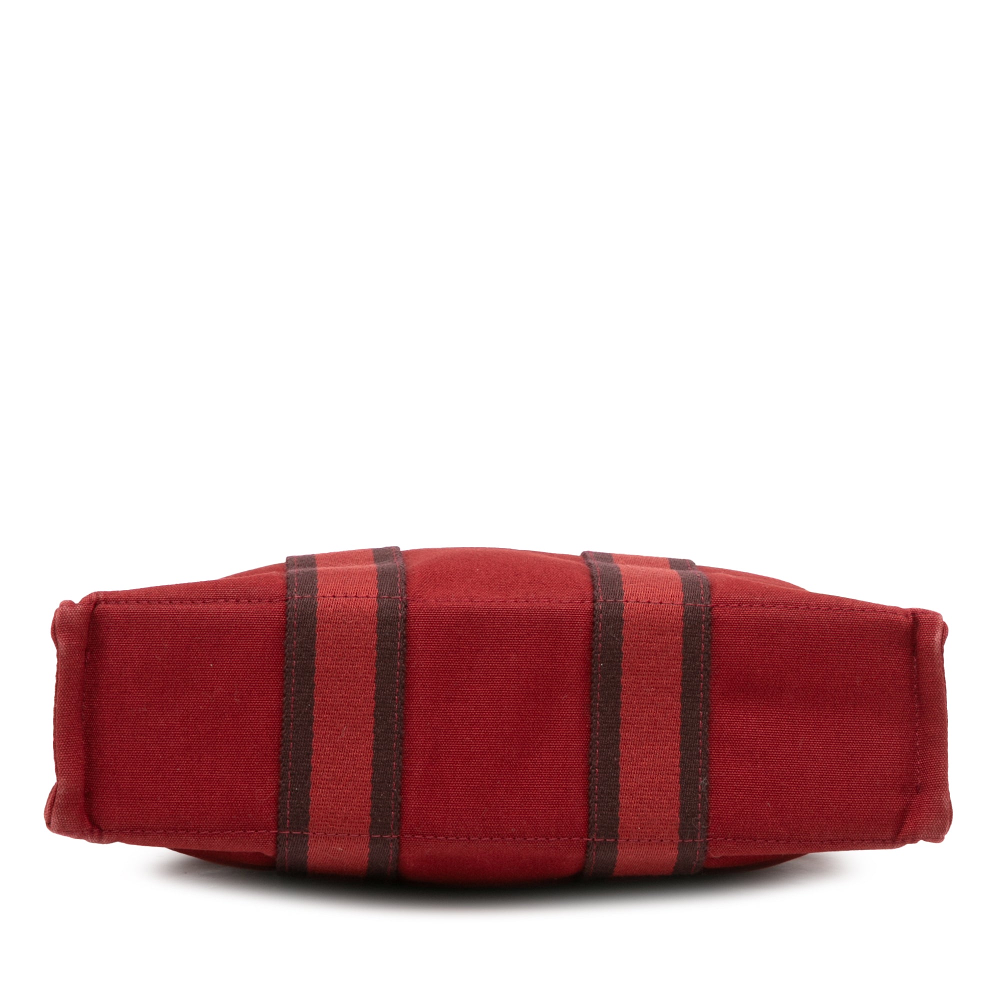 The Fourre Tout PM tote features a canvas body, flat straps, an open top with a snap closure, and an interior zip compartment. Retail Price: 990.00