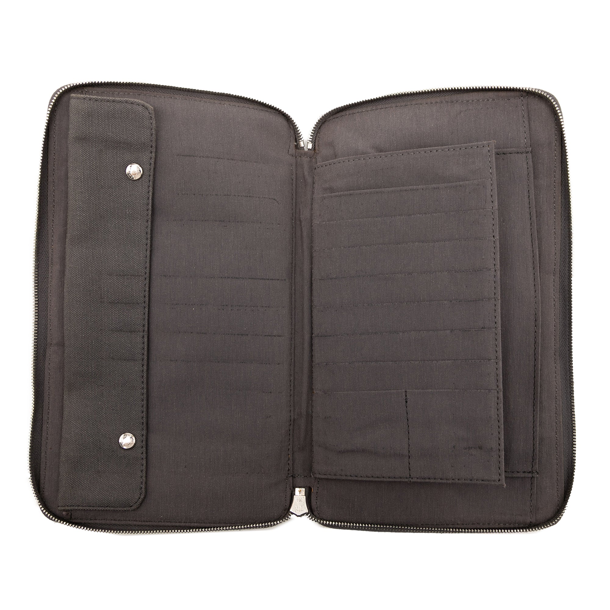 This organizer features a canvas body striped detail, zip around closure, interior slip pockets, an interior flap pocket, and interior card slots. Retail Price: 575.00