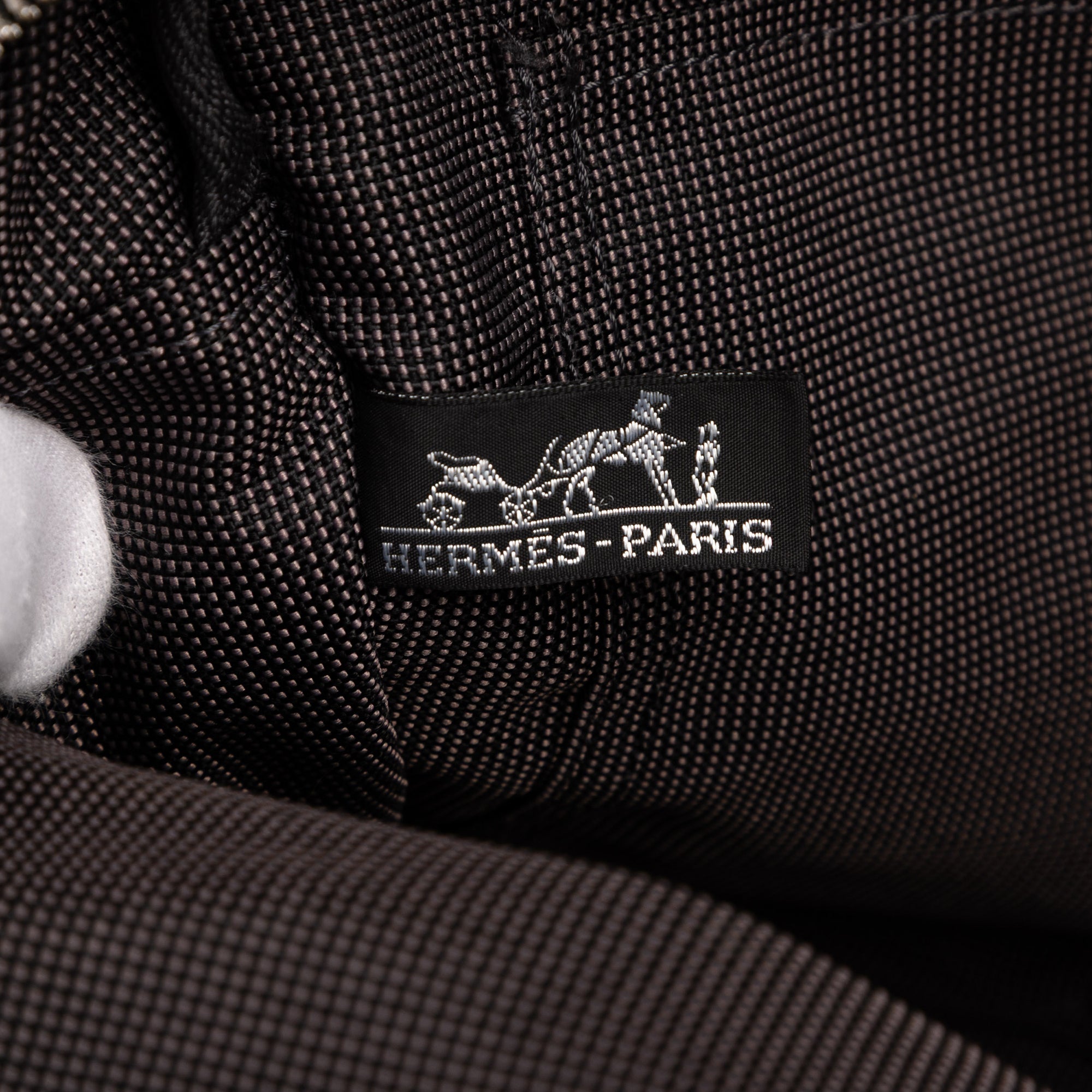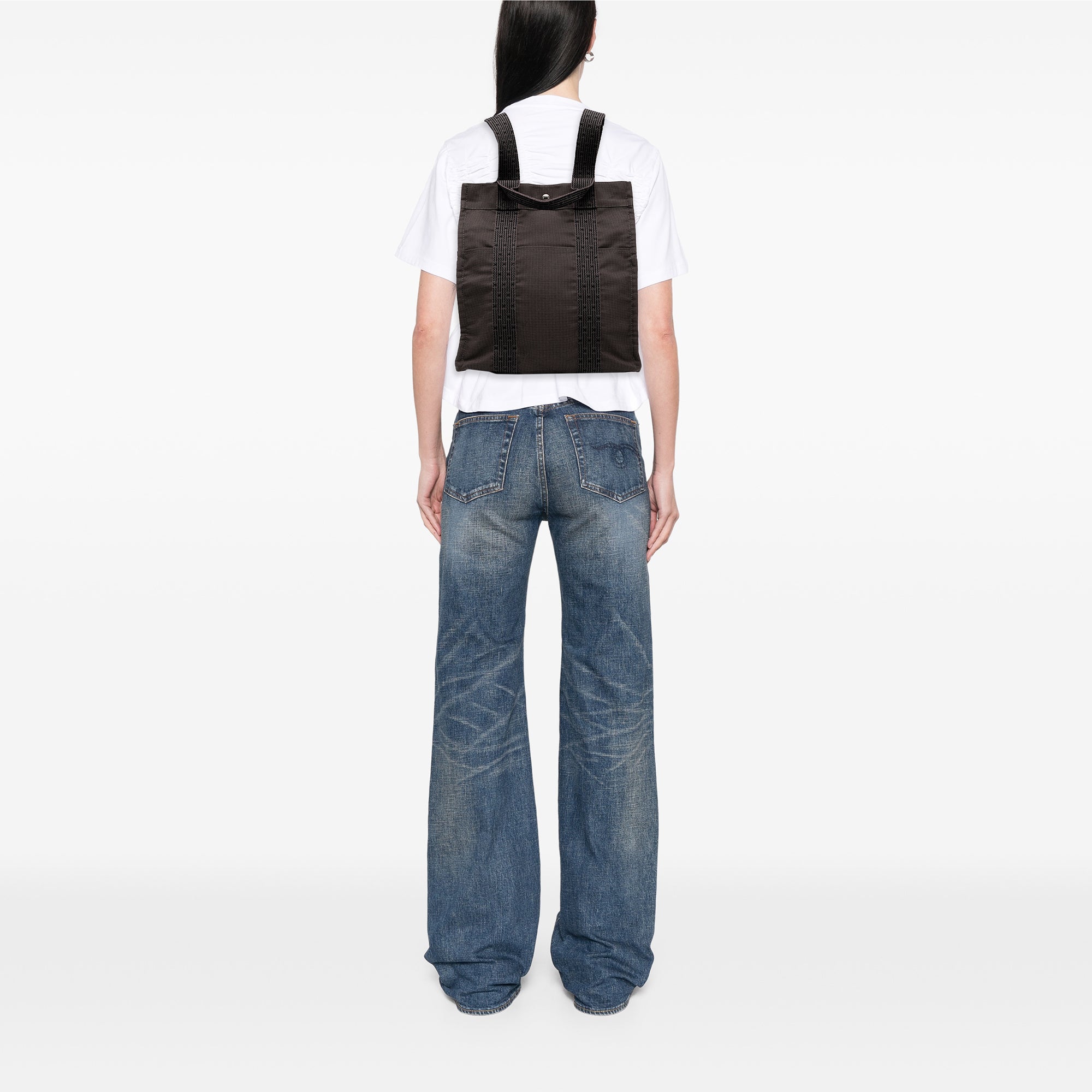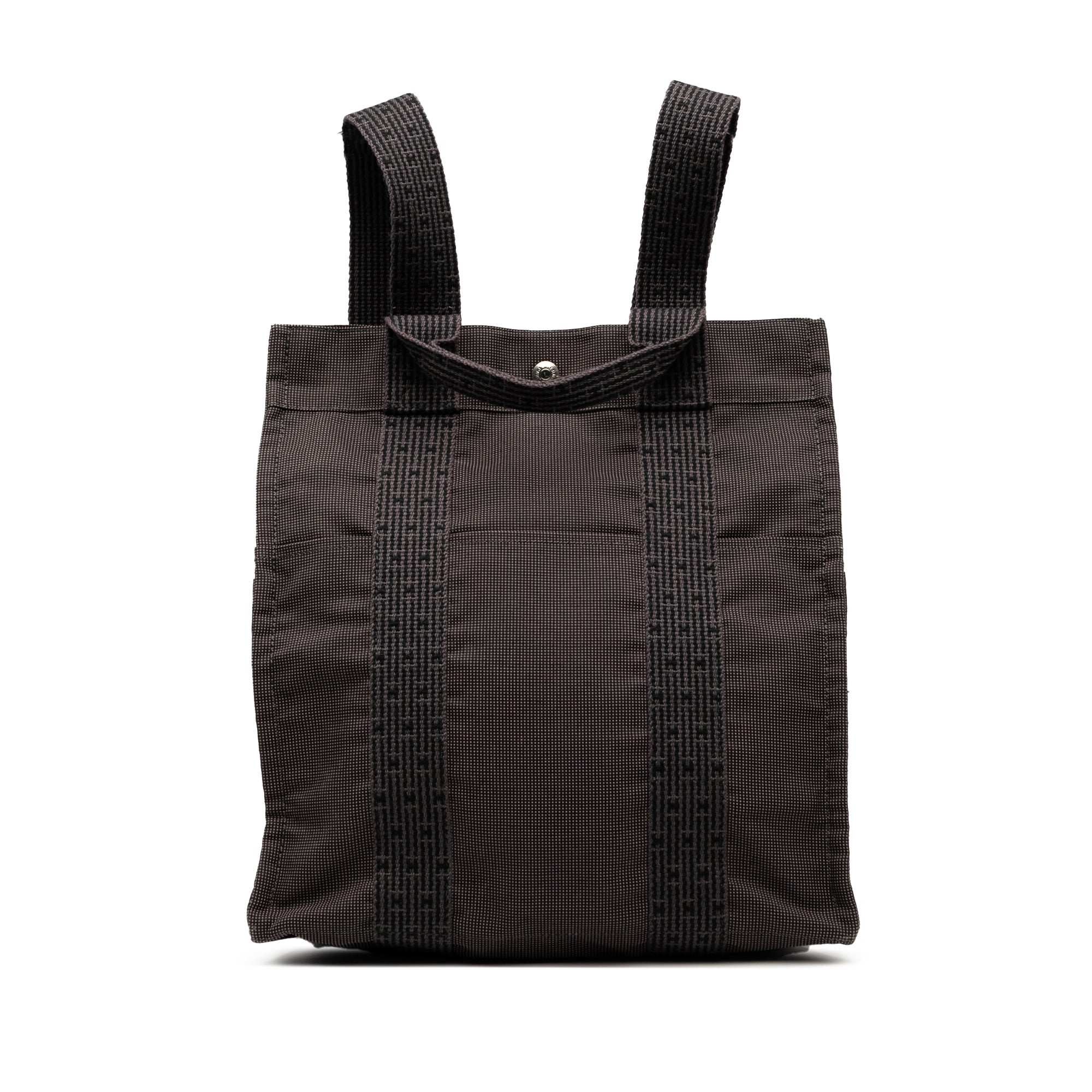 This backpack features a canvas body, a flat top handle, flat back straps, an open top with snap button closure, exterior front slip pockets, and an interior slip pocket. Retail Price: 1500.00