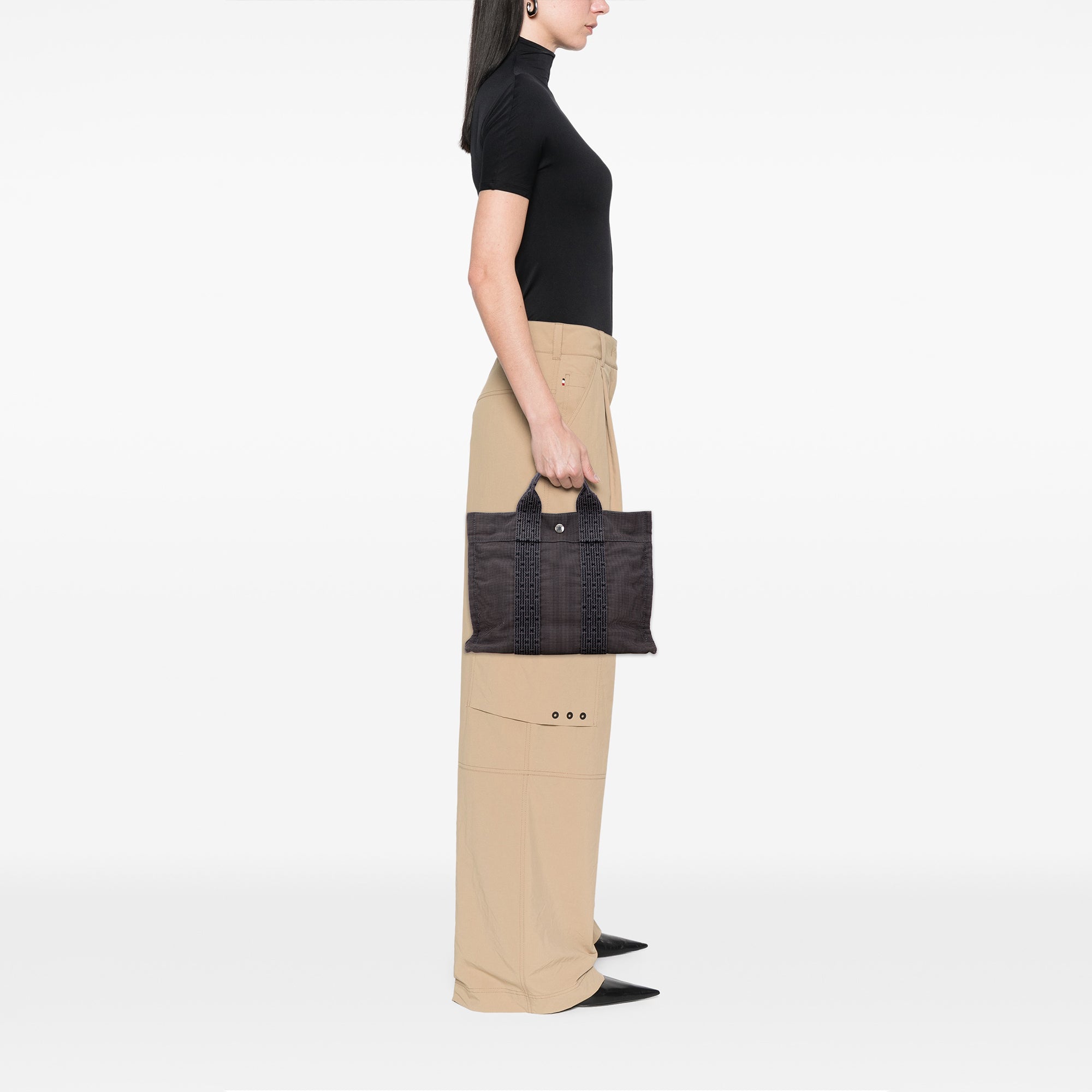 The Herline PM features a canvas body, flat straps, an open top with a snap closure, and an interior zip compartment. Retail Price: 600.00