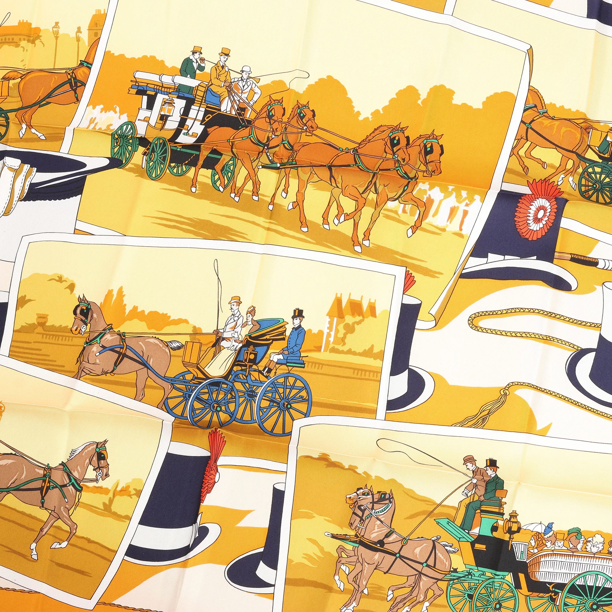 Step into equestrian elegance with the Hermès Carré 90 "Carriage and Hat" in Black x Orange. Crafted from 100% silk, this vibrant scarf showcases horse-drawn carriages and top hats in a dynamic composition—perfect for lovers of tradition and timeless style.