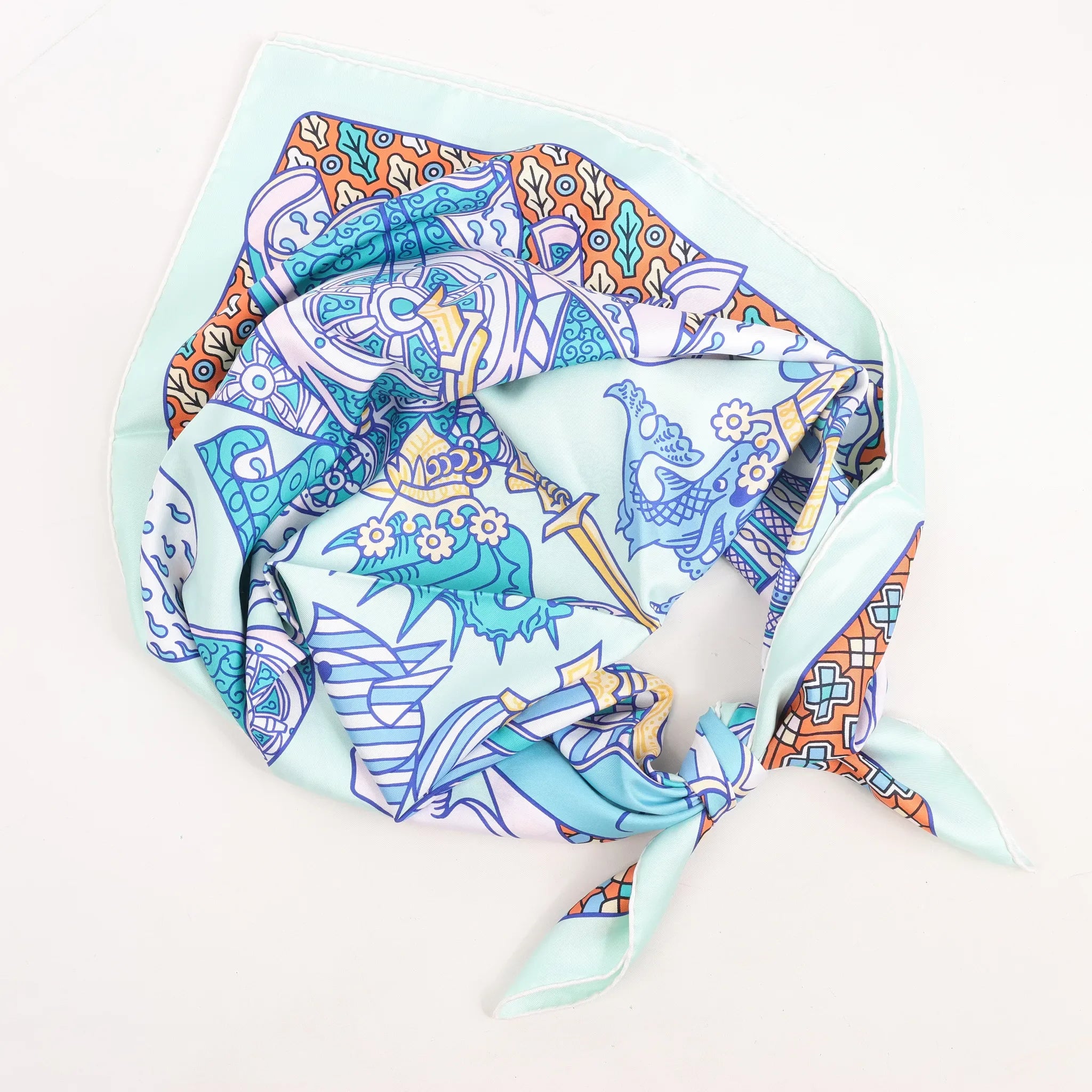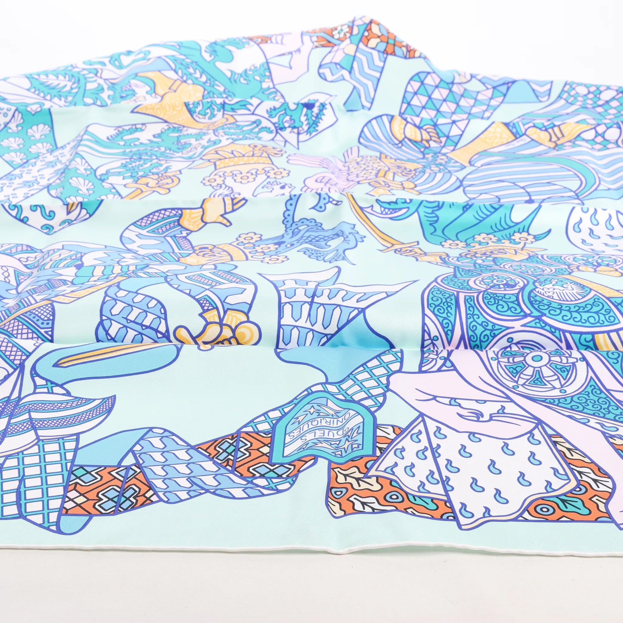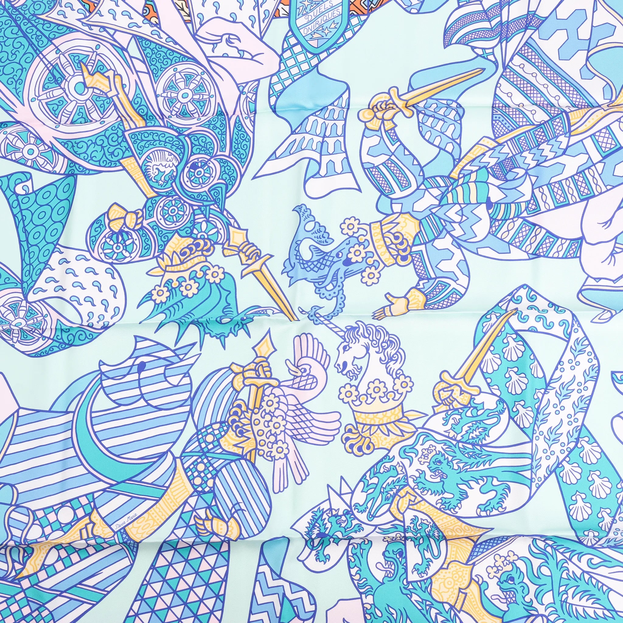 The Hermès Carré 90 "Duels Oniriques" in blue brings fantasy to life. Made from 100% silk, this vibrant scarf features armored knights in dreamlike combat with intricate detailing and geometric accents—a stunning blend of mythology and luxury.