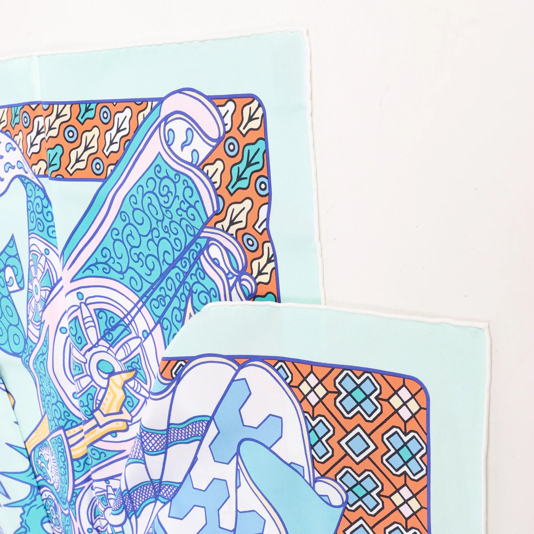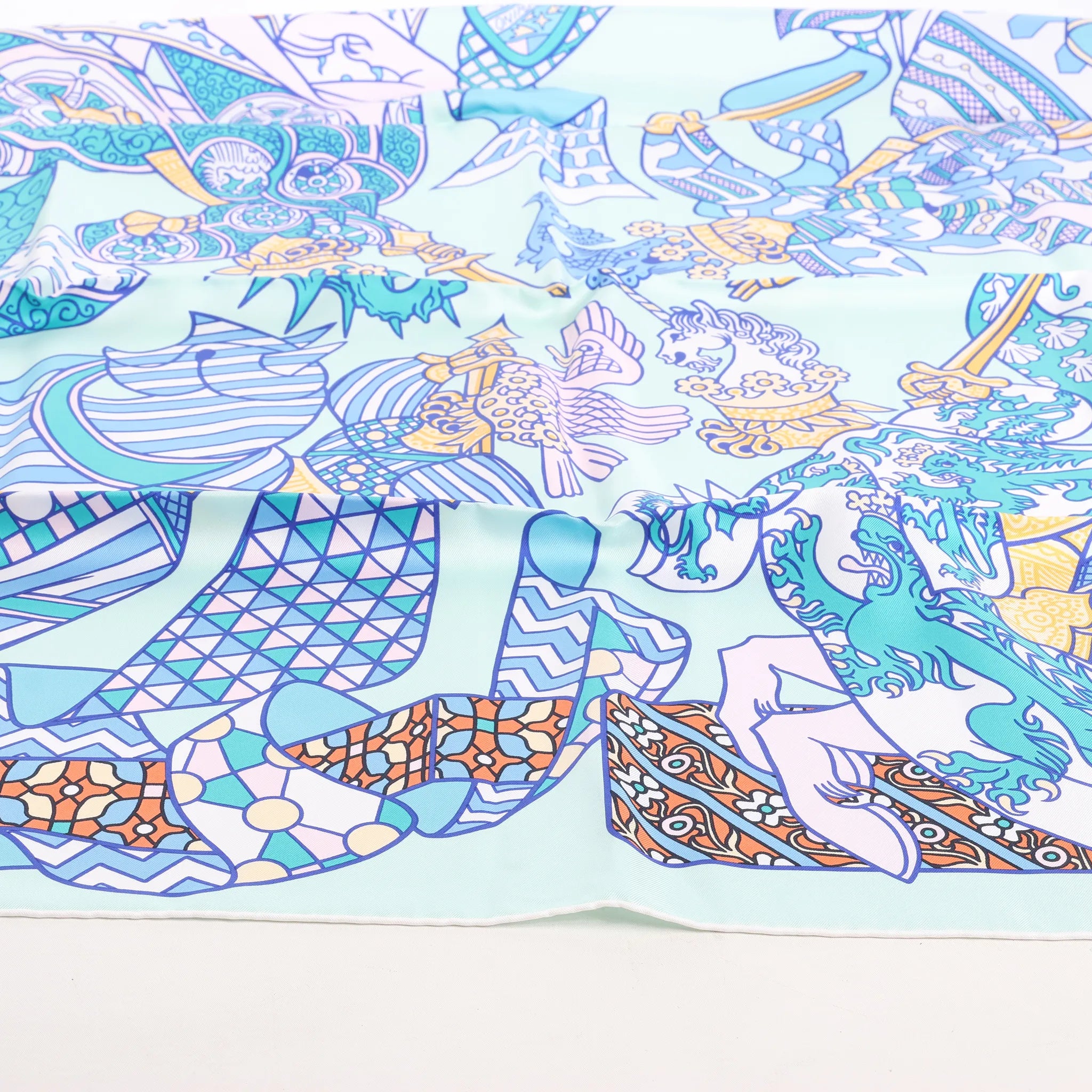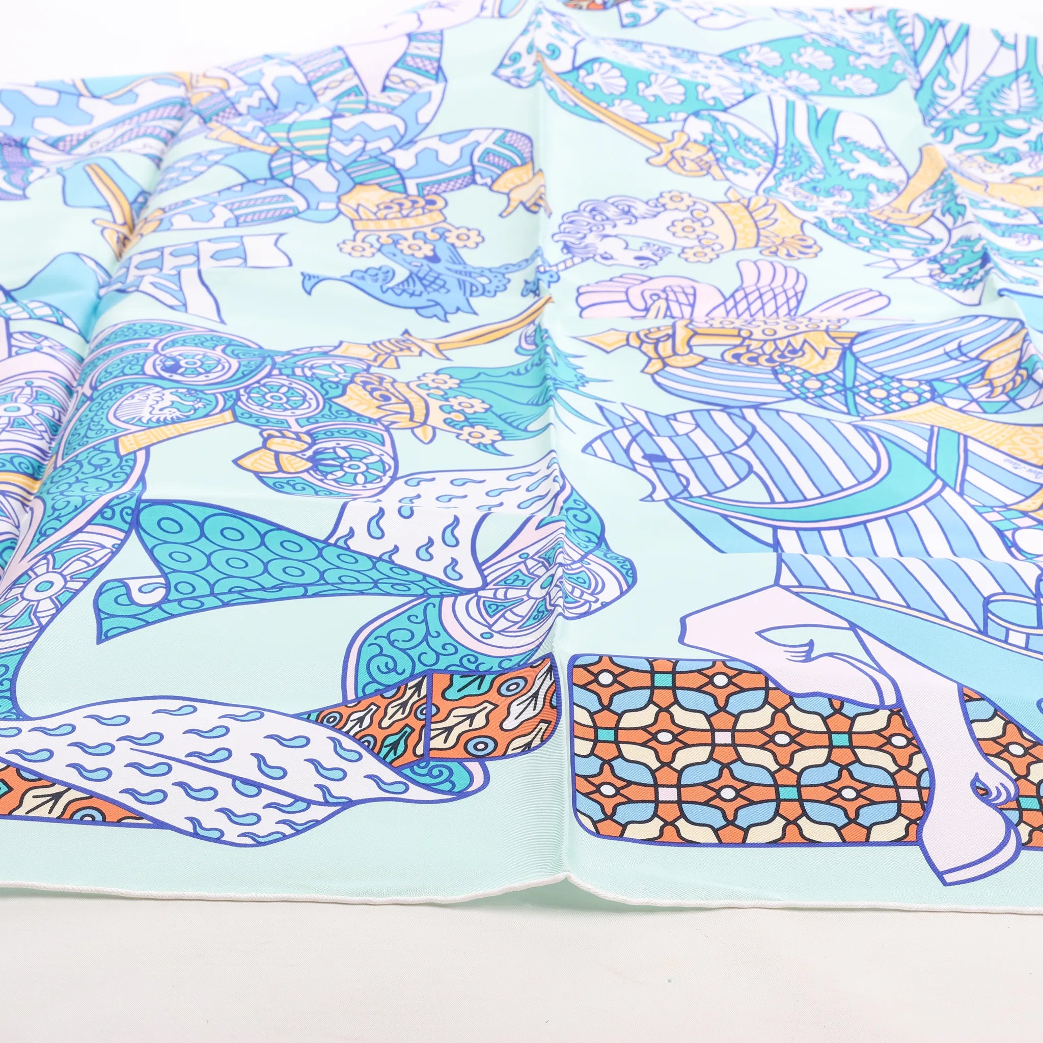 The Hermès Carré 90 "Duels Oniriques" in blue brings fantasy to life. Made from 100% silk, this vibrant scarf features armored knights in dreamlike combat with intricate detailing and geometric accents—a stunning blend of mythology and luxury.