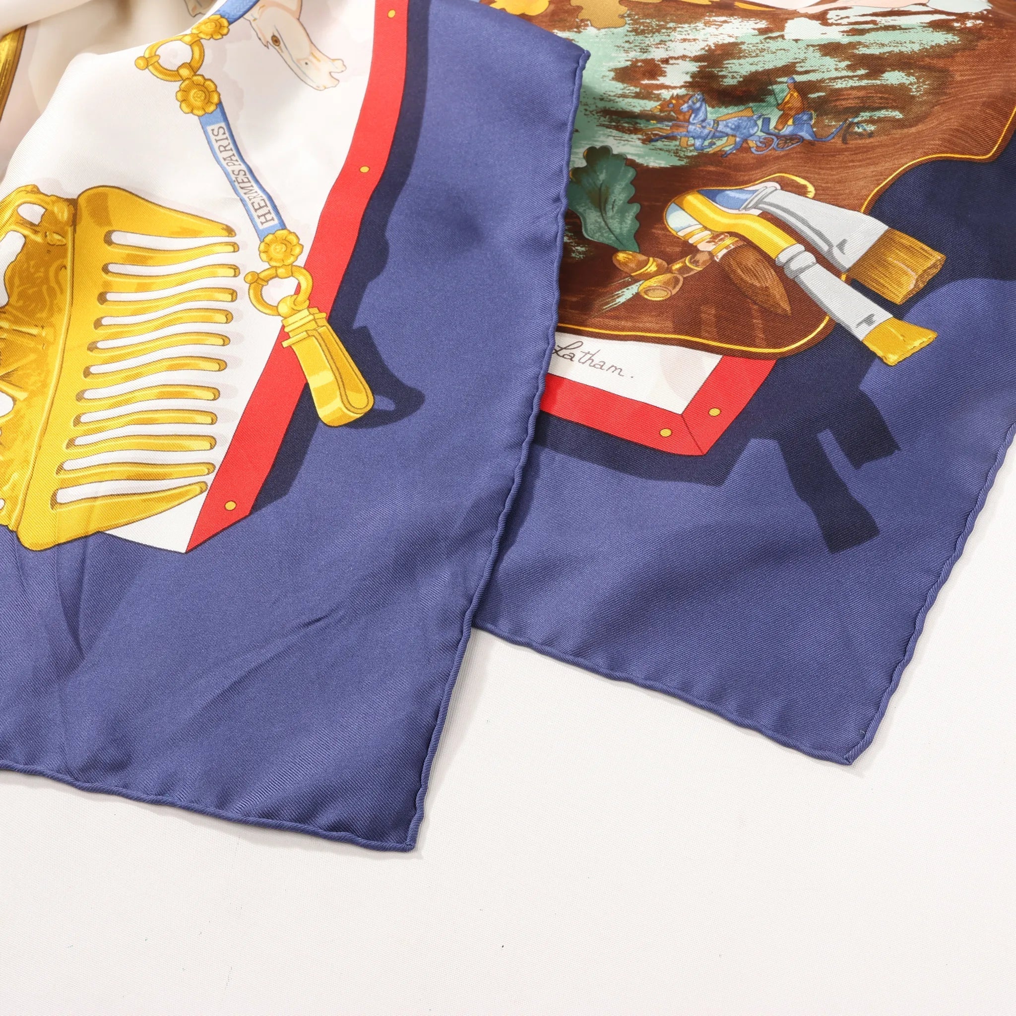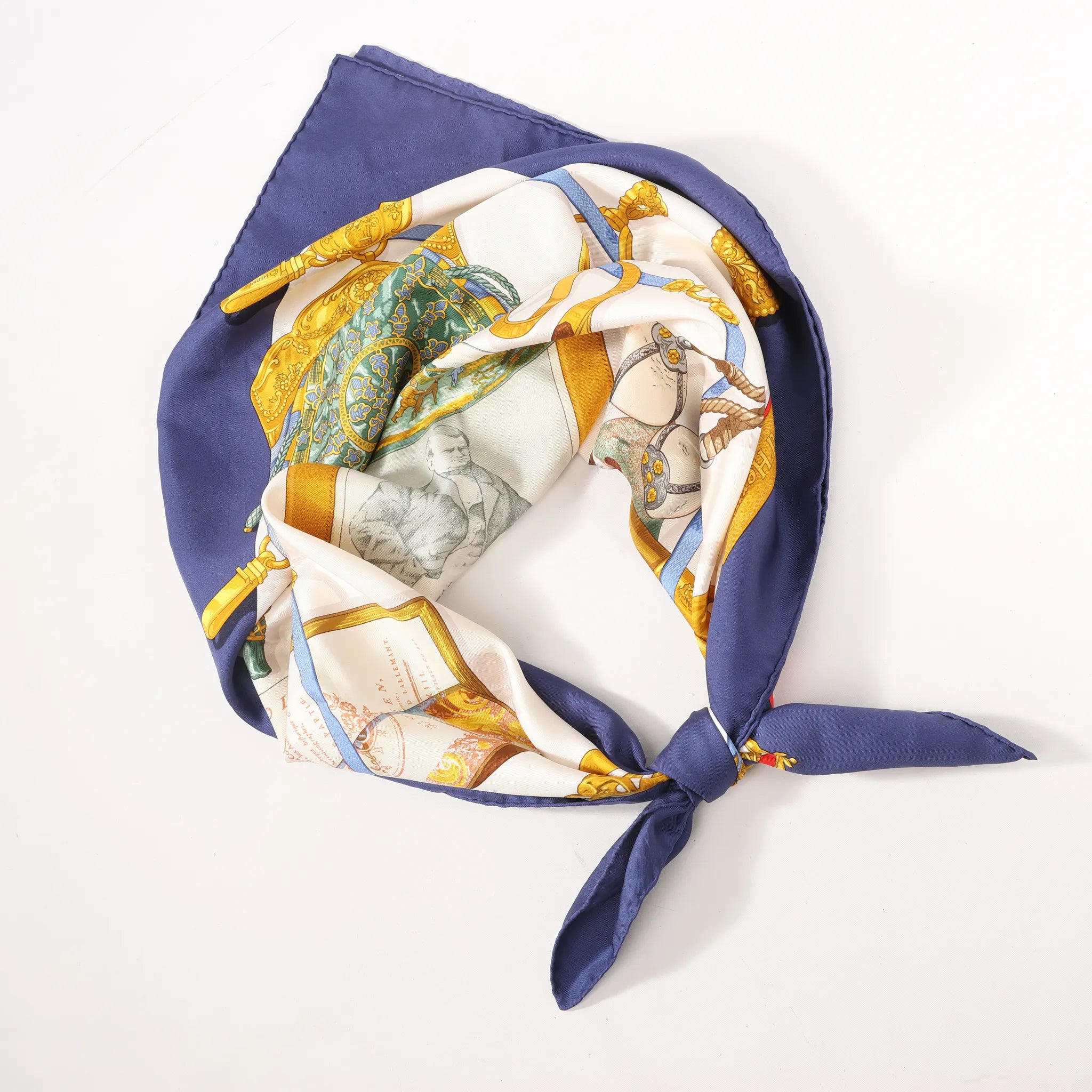 The Hermès Carré 90 “Mémoire d’Hermès” in navy blue is a luxurious silk scarf celebrating the brand’s rich heritage, illustrated with iconic objects and historical motifs in exquisite detail.
