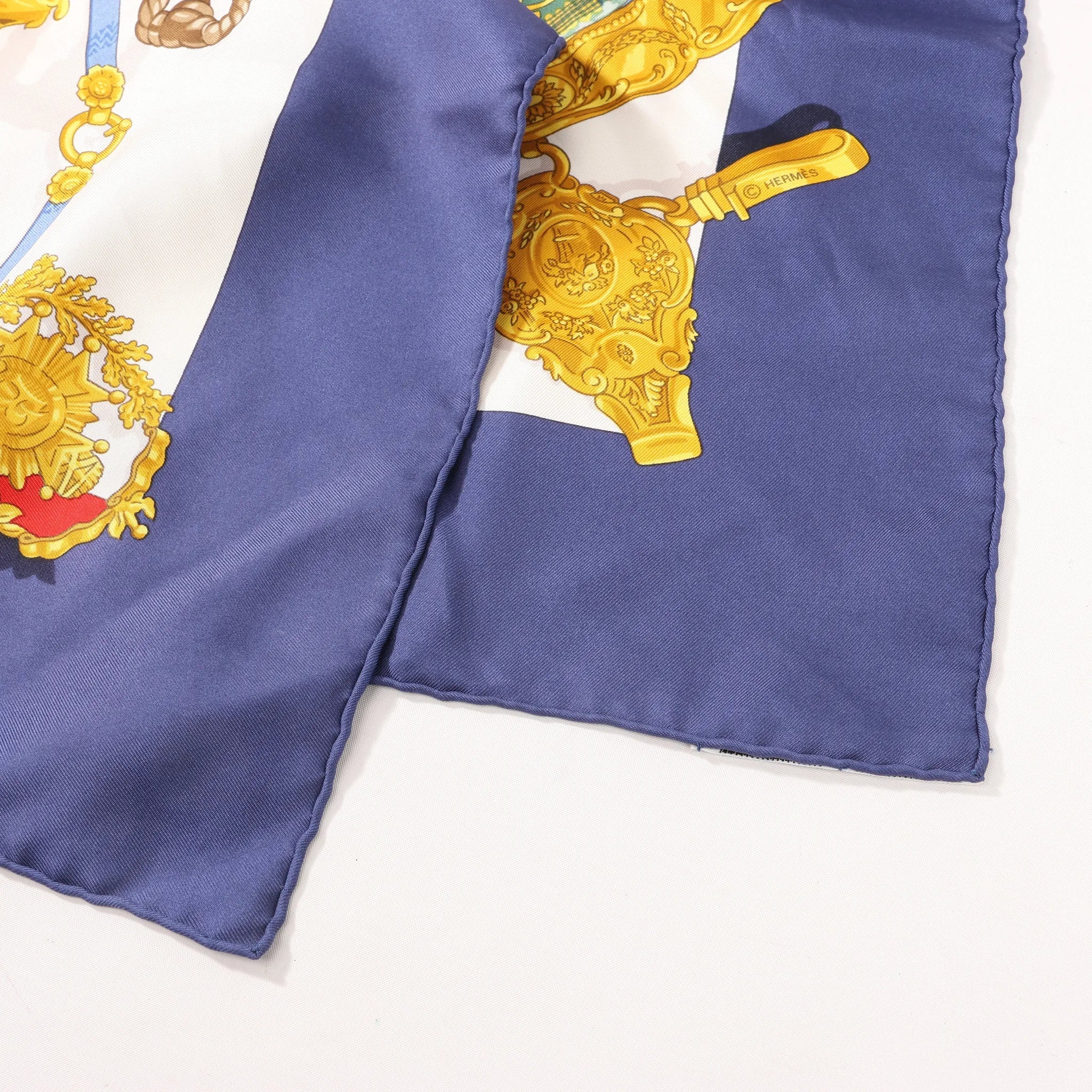 Brand: HermesModel: Carre 90Size: 90x90 cm Condition: ExcellentCondition Details: Gently worn, with some stains - see photos.Color: Navy Blue, Ecru, GoldMain material: SilkComes With: -