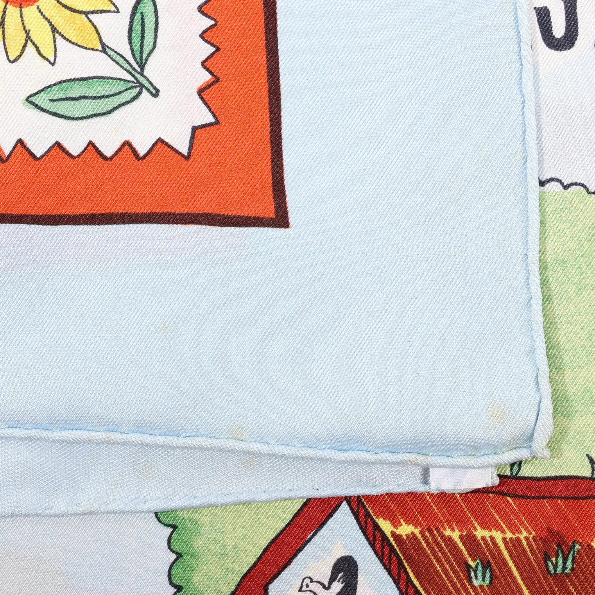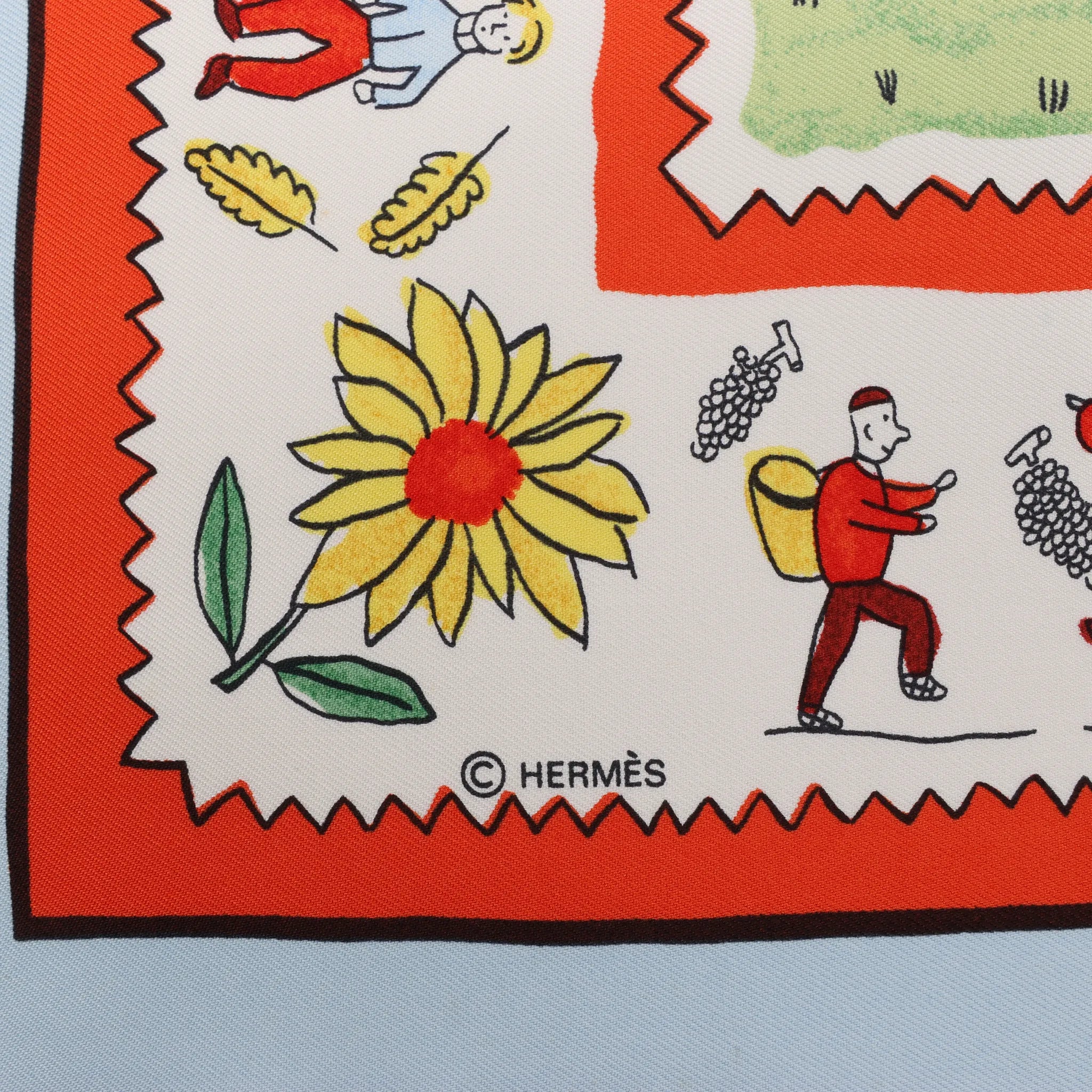 The Hermès Carré 90 "Retour à la Terre" silk scarf in light blue captures the charm of rural life with playful, hand-drawn scenes of farming and nature. Crafted in soft silk twill, it’s a whimsical and colorful ode to simplicity and the land.