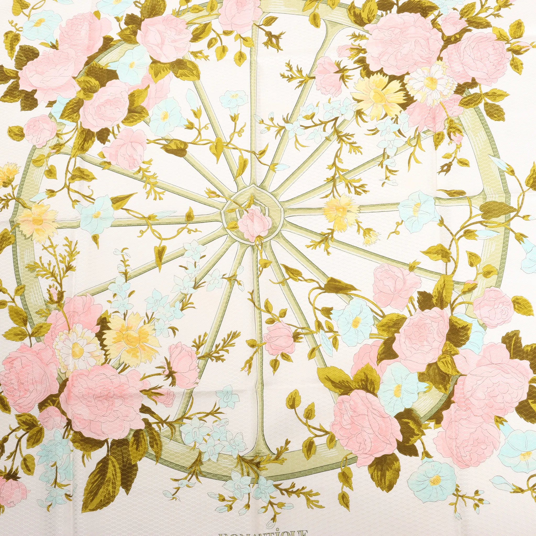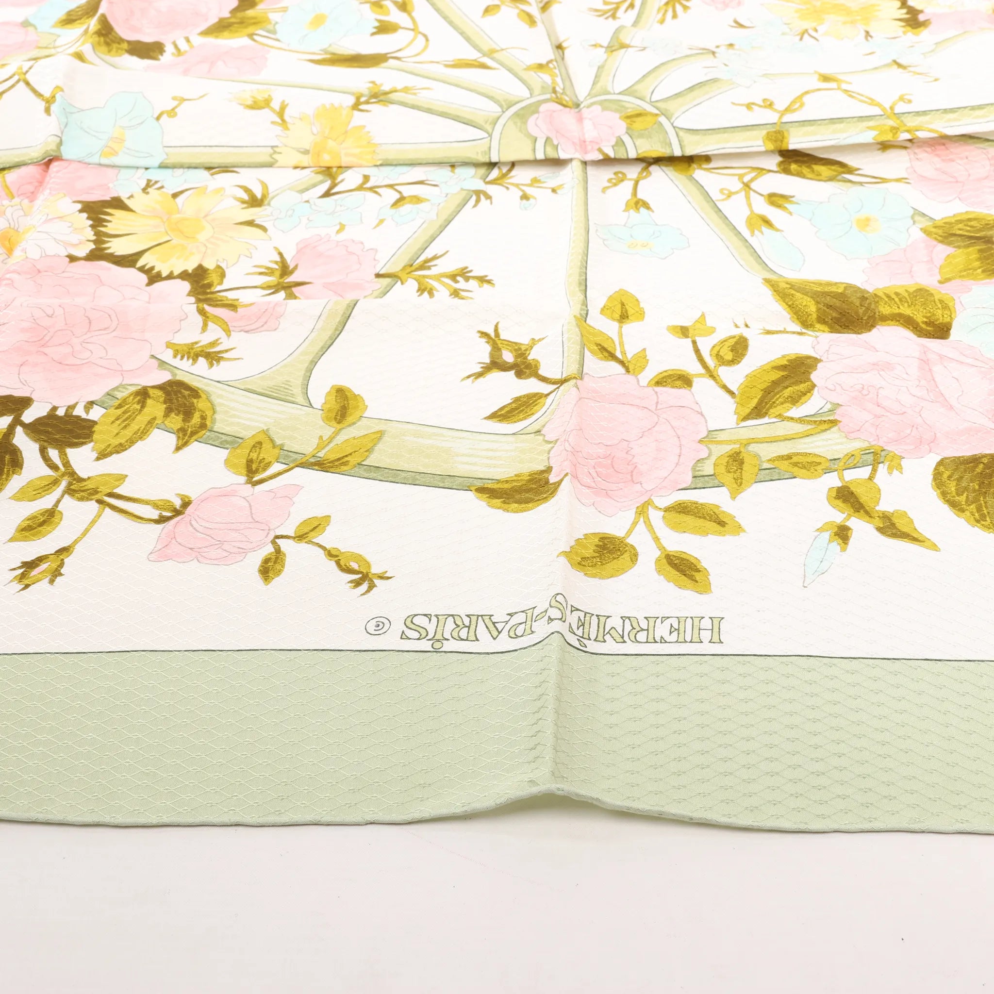 The Hermès Carré 90 "Romantique" silk scarf in soft green features a delicate wheel of blooming florals in pastel hues. Crafted in luxurious silk twill, it’s a timeless, feminine accessory that adds elegance to any ensemble.