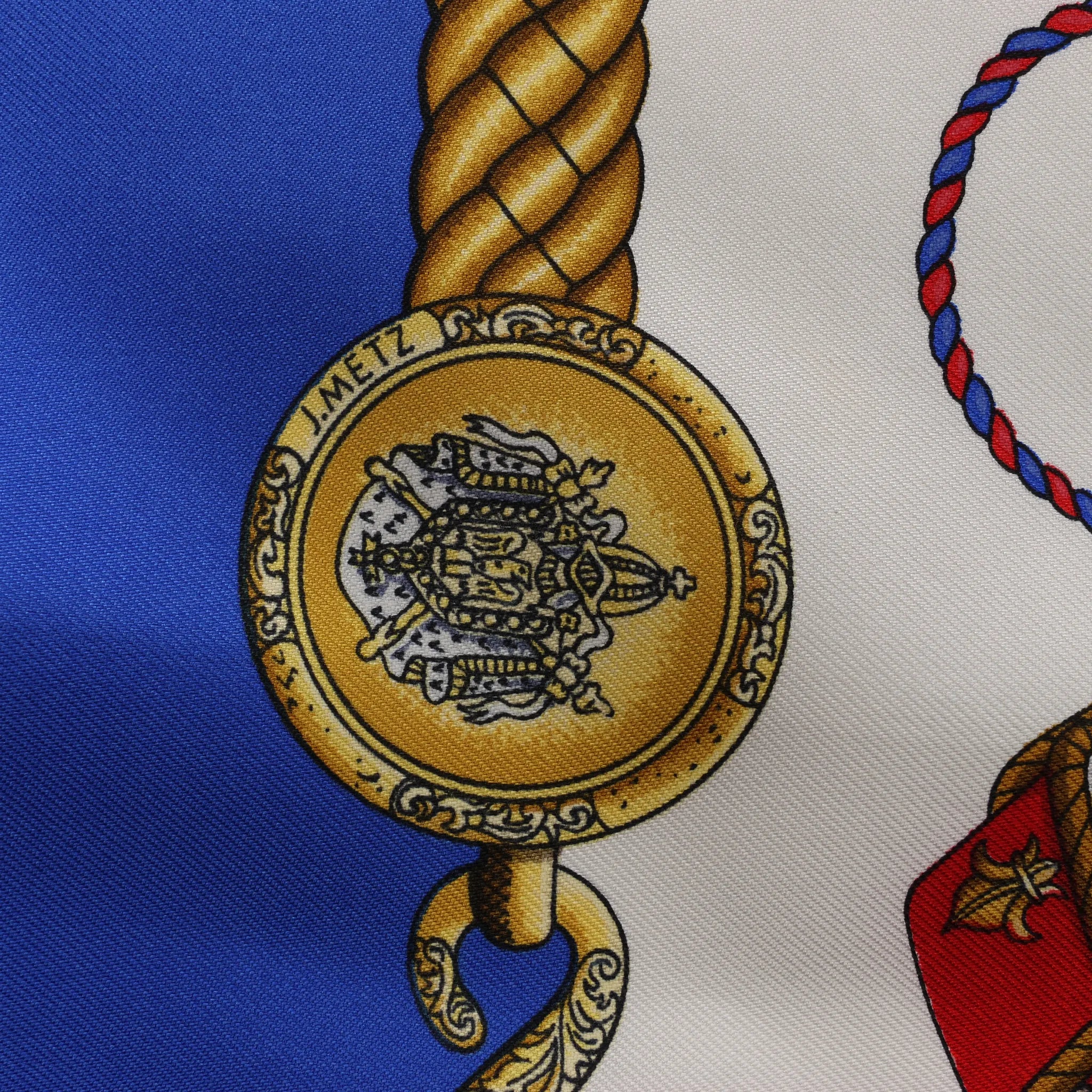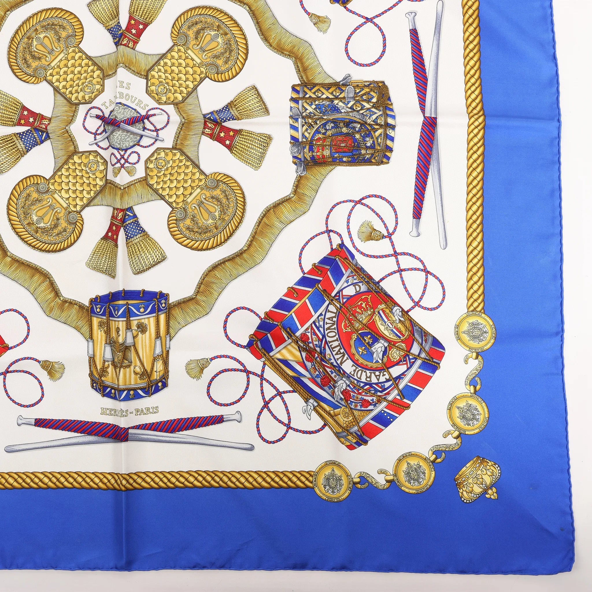 The Hermès Carré 90 "Tambour no Taiko" silk scarf in blue features a vibrant motif of ceremonial drums, ropes, and medals. Crafted from luxurious silk twill, it brings bold color and rich cultural detail to any look.
