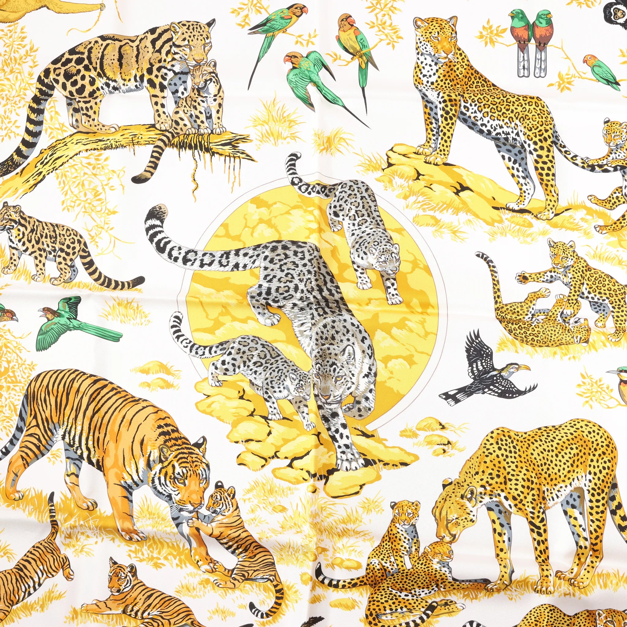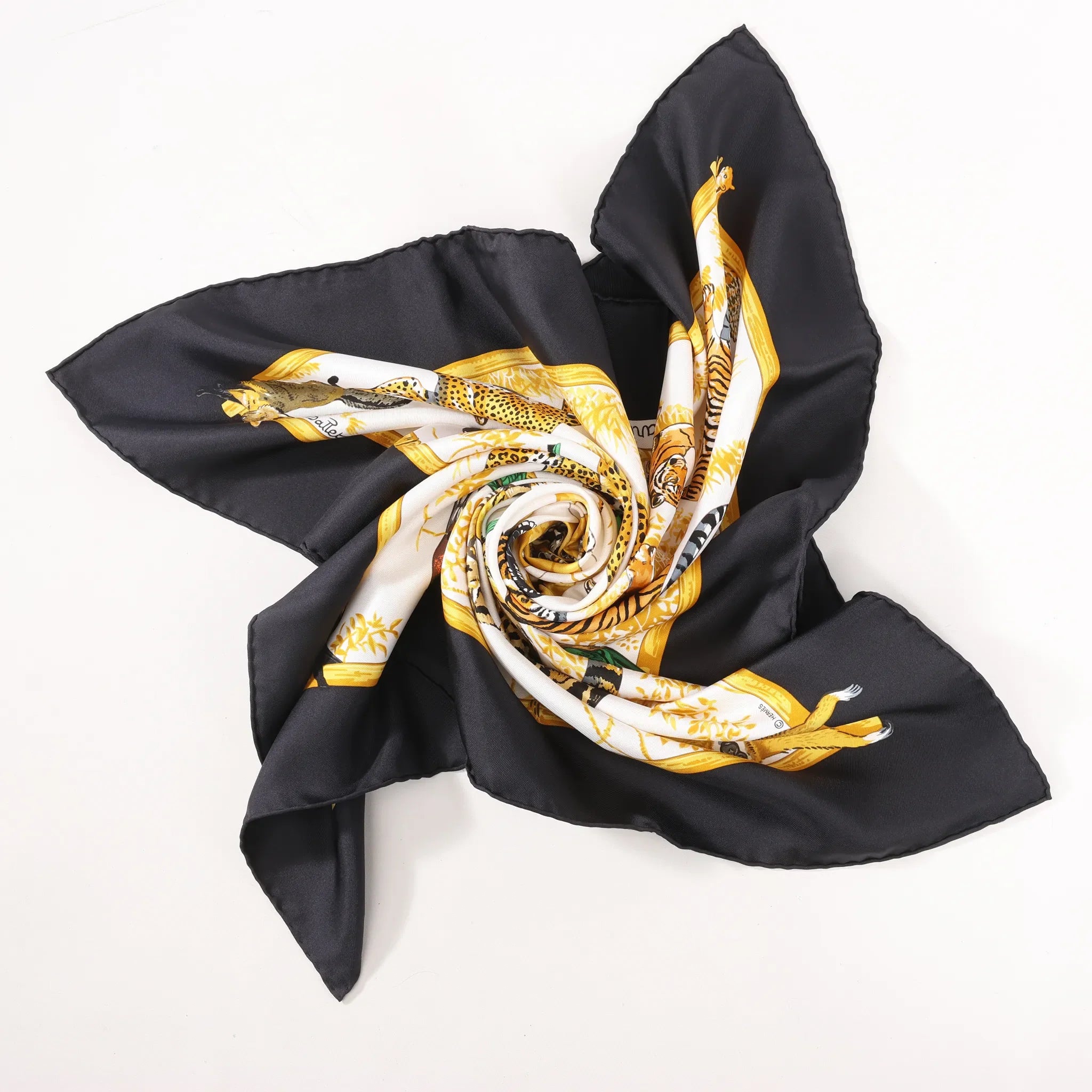The Hermès Carré 90 “Tendresse Féline” scarf in black and yellow captures the wild elegance of big cats in a lush silk canvas, blending luxury with nature-inspired artistry.