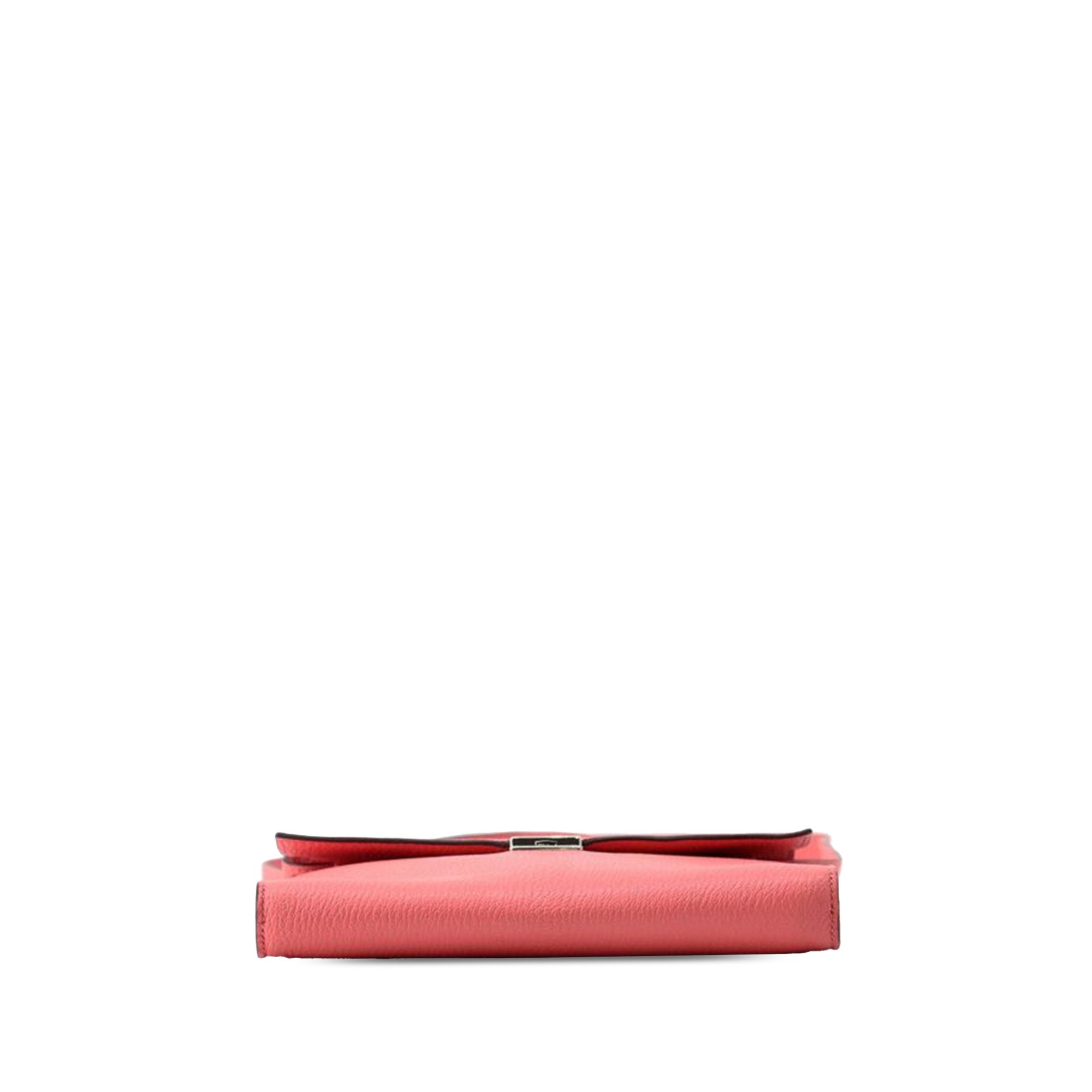 This Clic 16 wallet on strap features a Chevre Mysore leather body in Rose Azalee color, a flat leather strap, a front flap with a push lock closure, and interior slip pockets. Retail Price: 2400.00