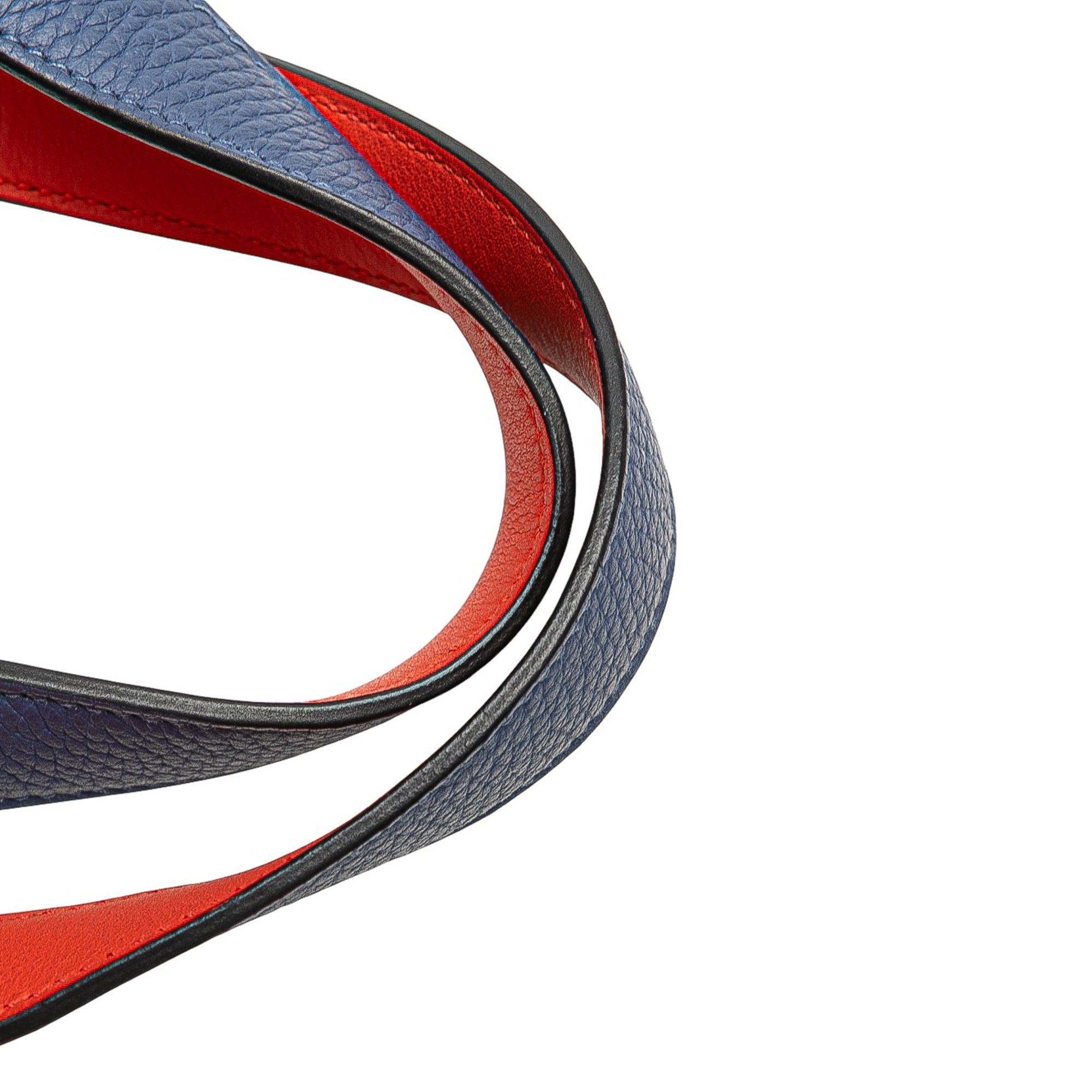 The Picotin Lock features a Clemence leather body in Bleu Brighton color and Swift leather trim in Capucine color, flat leather handles, and an open top with a pull-through strap closure. Inclusion: Dust bag. Retail Price: 4588.00