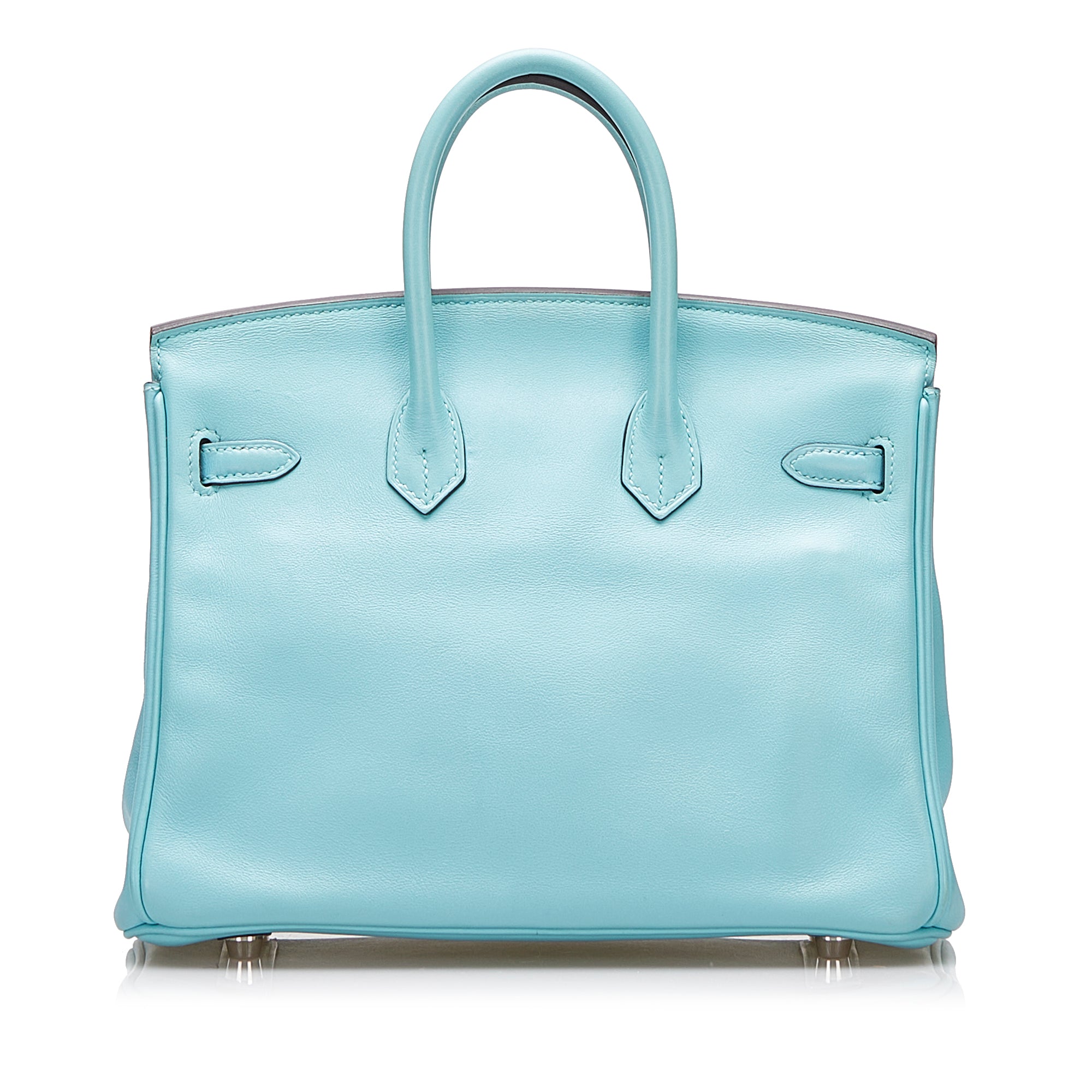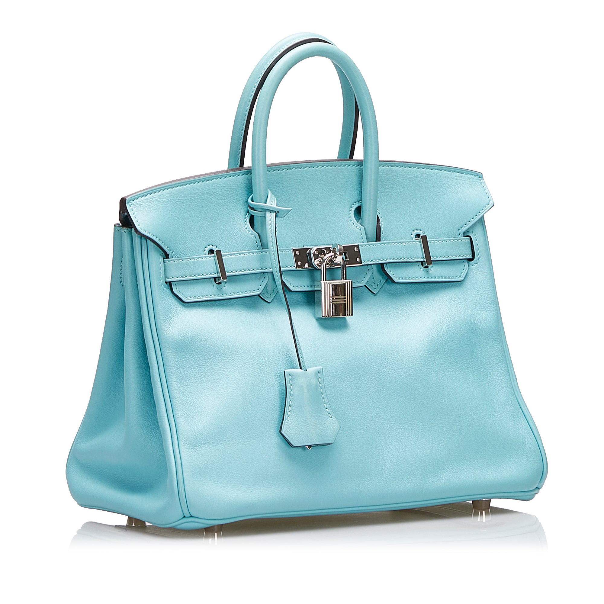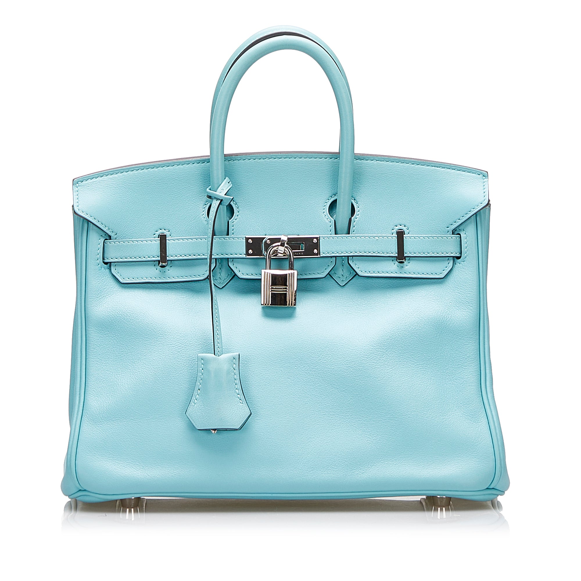 The Birkin 25 features a Swift leather body in Blue Atoll color, rolled leather handles, a front flap with turn-lock closure, silver hardware, and interior zip and slip pockets. Inclusion: Dust bag. Retail Price: 28000.00
